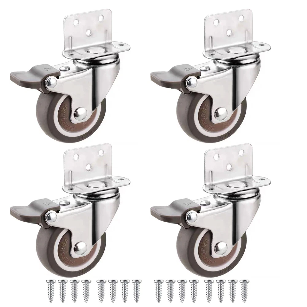 The casters are made of rubber, which can easily slide safely on your expensive hardwood floors, tiles, vinyl, marble, carpets and any type of floor. Not suitable for outdoor use on rough roads Suitable for replacing movable furniture such as cribs, trolleys, kitchen cabinets, storage racks, coffee tables, work tables, etc. Rotate 360 degrees. Rotating, smooth, quiet and robust Capacity: 50 Lbs each-200 Lbs total Wheel diameter: 2 inches Wheel material: rubber Total height: 2.58 inches Including: 4 X 2 inch casters with brake and 20 screws HIGH-QUALITY MATERIALS: thermoplastic elastomer , built-in bearing, does not hurt the floor, the movement is silent. SIZE: L-shaped bracket About 1.5"×1"/ 38×25mm(L×W), mounting height is about 2.58"/65mm, the diameter of wheel is 2"/50mm. CARRYING CAPACITY:Heavy Duty Ball Bearings, 50 lbs per wheel bearing, 200 lbs (pack of 4). UNIVERSAL ROTATION:360 degree swivel casters with brake lock ,Glides on easily without scratches or noise. EASY TO INSTALL L- SIDE MOUNT CASTERS:Wide range of applications, Brake casters for small equipment and small space furniture, including coffee tables, plant racks, bookshelves, shoe boxes, toy boxes, shopping carts.