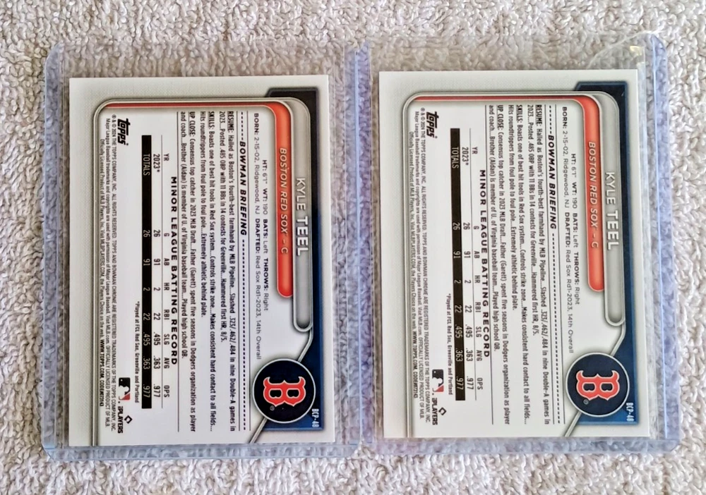 2 KYLE TEEL 2024 BOWMAN CHROME GREEN REFRACTOR RC LOT # BCP48 CHICAGO WHITE SOX SHIPPING WILL BE $4.99. I DO COMBINE SHIPPING FOR ADDITIONAL ITEMS PURCHASED. PLEASE CONTACT ME FOR DISCOUNTED RATES. USPS FIRST CLASS SHIPPING UNLESS OTHERWISE LISTED. I ONLY SHIP TO THE U.S. EBAY SELLER WITH 100% FEEDBACK. PLEASE VIEW MY OTHER LISTING. MONEY BACK IS GURANTED IF YOU NOT SATISFIED WITH THE RETURN OF THE ITEM OR ITEMS.