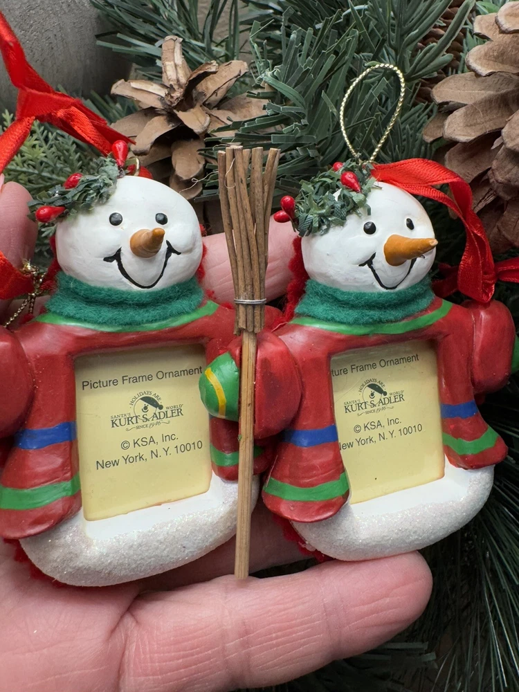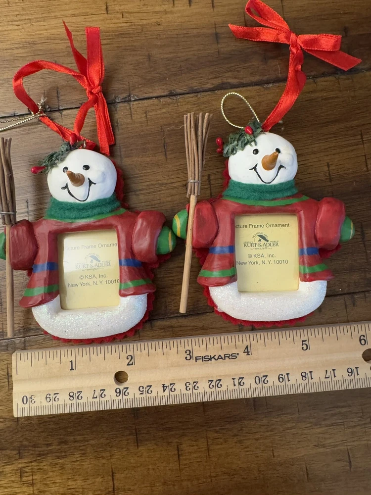 TWO ORNAMENTS This product is a set of two vintage Kurt Adler snowman photo frame ornaments. Each ornament features a snowman holding a broom and adorned with holly and glitter details. The ornaments are made of resin and have a photo holder feature, making them perfect for displaying cherished memories during the Christmas season. These ornaments are part of the Christmas theme collection by Kurt Adler and would make a festive addition to any holiday decor. Please see all photos SMOKE FREE HOME Always happy to combine for shipping savings Please buy through your cart on multiple items and request a combined shipping invoice If you pay separately, no worries, I just send the refund when I create the label