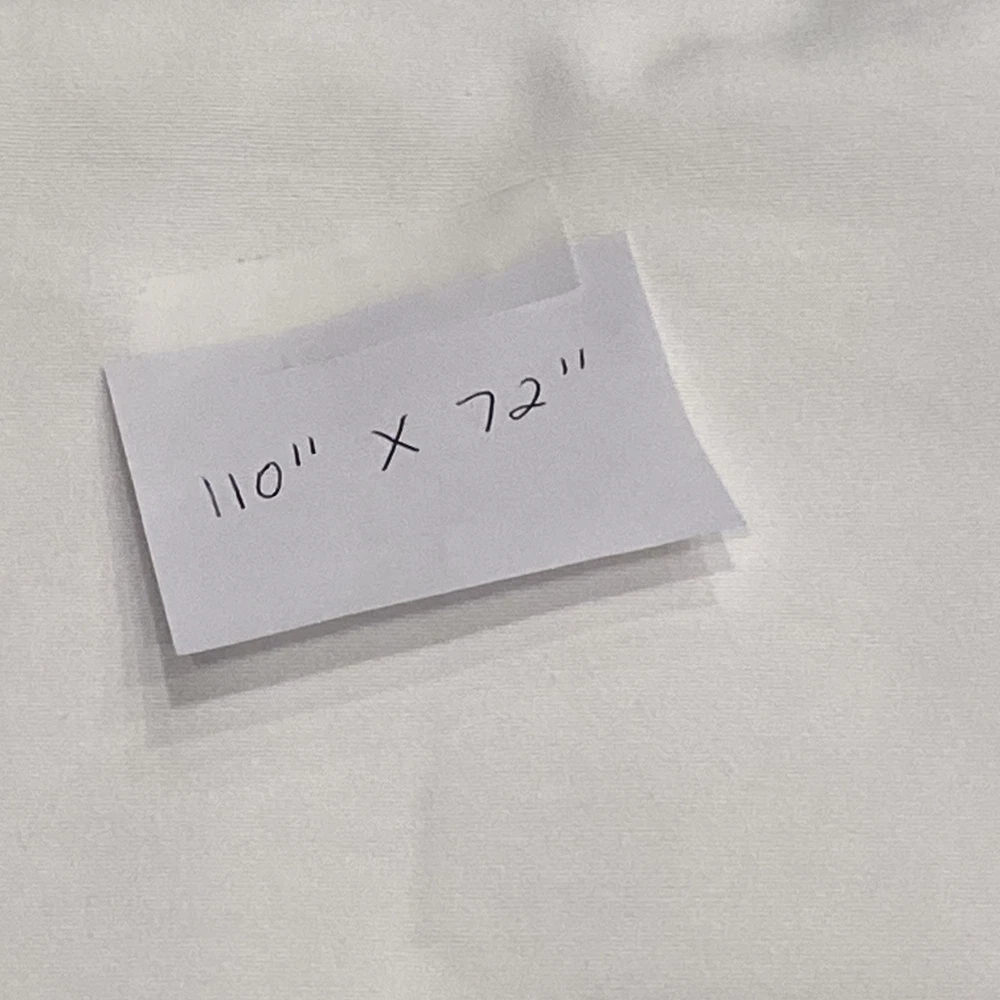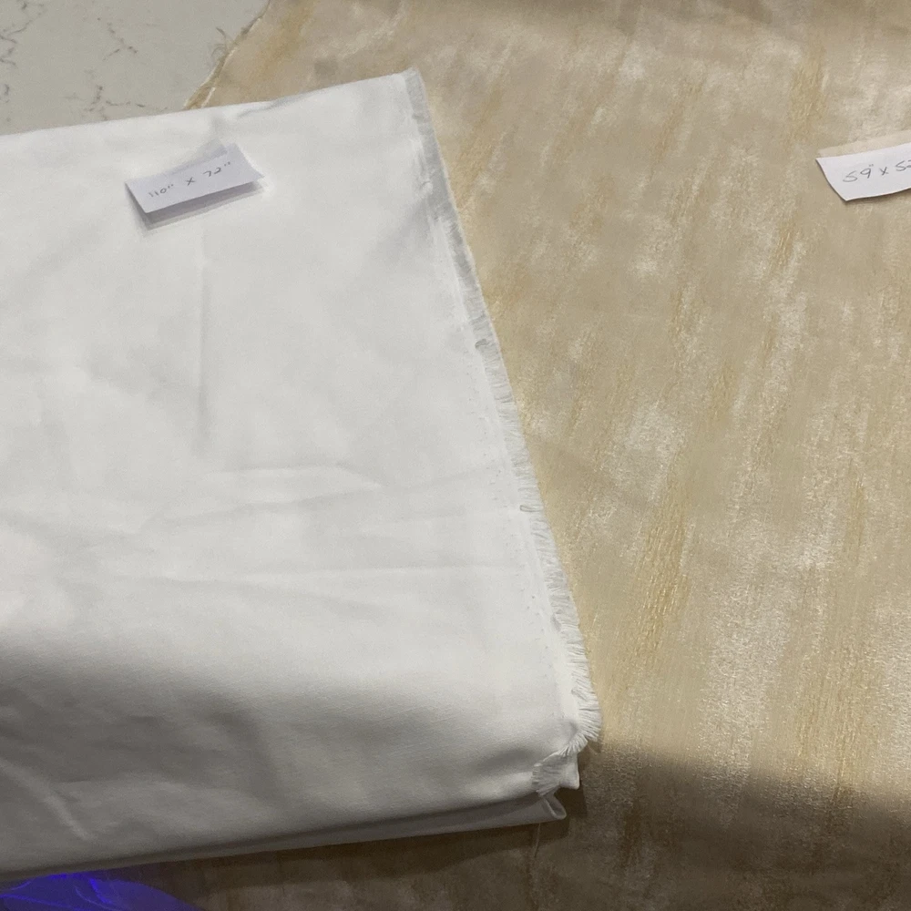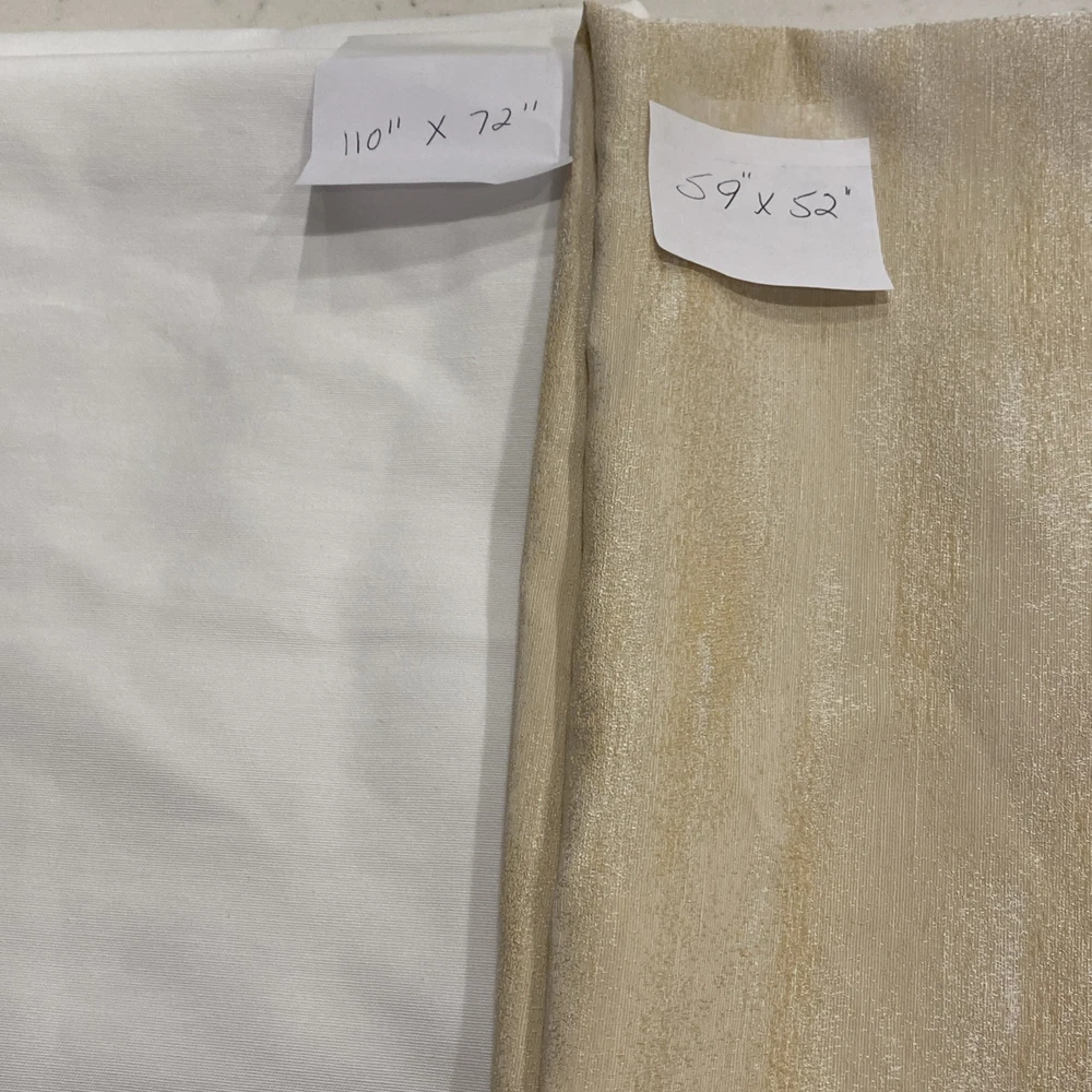 2 large pieces of material great for making napkins, table cloths, or runners. White is 110”X72”, and cream with gold tones is 59”X 52”. Wash prepped and ready to cut. Details as per pictures.