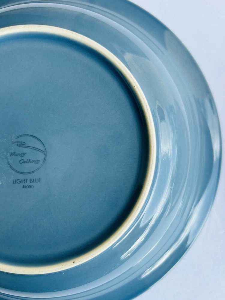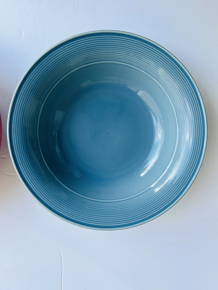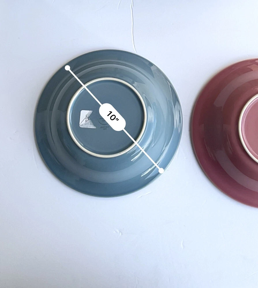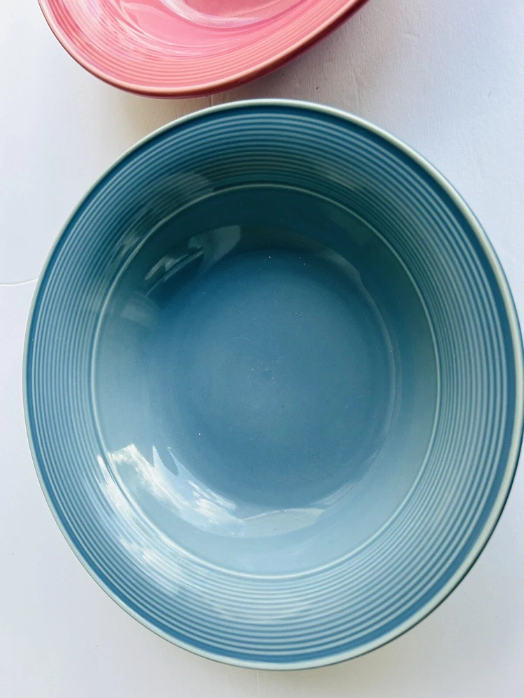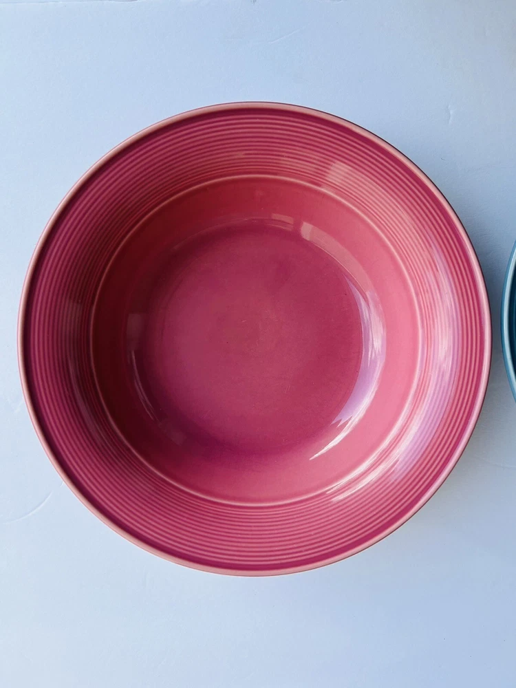 This product is a set of two large serving bowls by Nancy Calhoun in dark rose and light blue colors. Made of stoneware and ceramic, the set includes a bowl. The bowls are designed in a chop plate style, perfect for mixing and serving food. 3.12.24