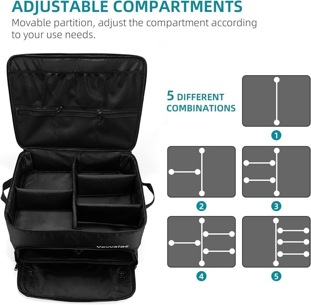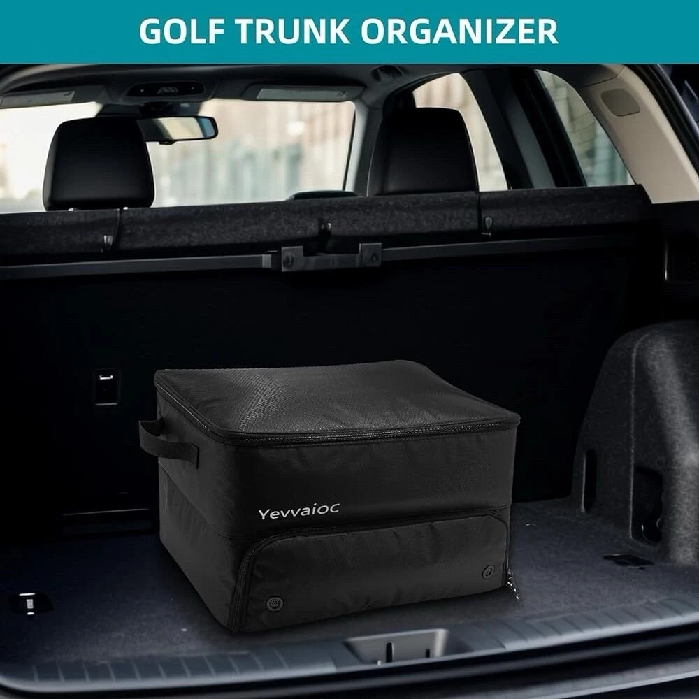 The 2 Layer Golf Trunk Organizer is a waterproof car golf locker with separate compartments, designed specifically for golf enthusiasts. This organizer is perfect for keeping gear dry and organized, with a black color that adds a sleek touch to any car. With its dual layer design and dedicated compartments, this trunk organizer is ideal for storing items like balls, club monogrammers, and other golf accessories securely while on the go.