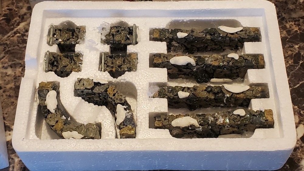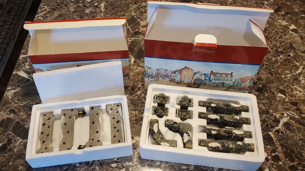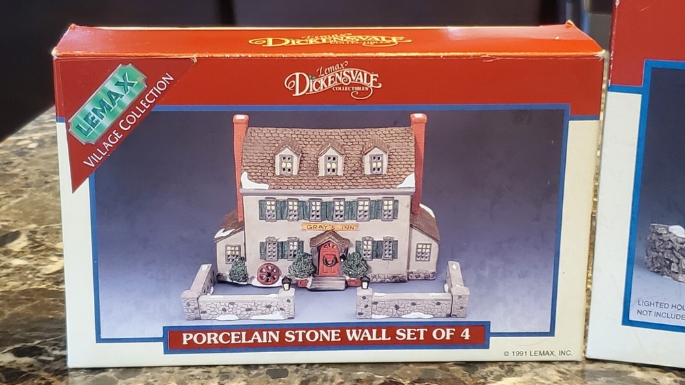 Both are in excellent condition..any other questions be sure to message me before buying..be sure to check out my other Lemax items as I bought out a huge collection..all orders are shipped within 24 hours after payment is received Add a touch of colonial charm to your Christmas village with this beautiful set of LEMAX stone walls. The set includes two porcelain stone wall sets, each hand-painted with intricate details and featuring a snow pattern. These walls are perfect for creating a cozy and festive atmosphere for your holiday season. The LEMAX collection is known for its quality and original designs, and this set is no exception. Made from durable resin material, these walls are built to last and will make a great addition to your collection. Get ready to impress your guests with this unique and original Christmas village set.
