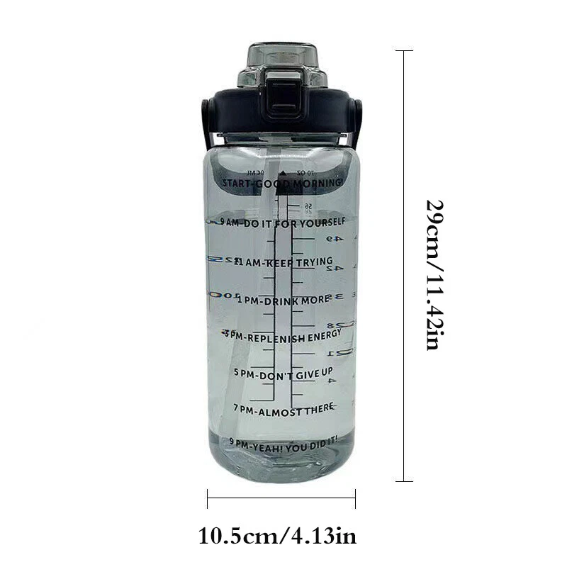 Features & Details Description: 【 Motivational Quote & Time Marker】The 64 oz - 2 liter large fitness water bottle jug with straw is with time markers to drink and unique motivational measurement statements on it, the half gallon water bottle with the tracker is the best choice of reminding you to stay motivated to drink enough water daily. It is important and easy for achieving healthy fitness goals including weight loss, muscle gain, keep hydrated and healthy with the motivational water bottle. 【 Half Gallon Water Bottle】 With large capacity(64 oz), the half gallon water bottle ensures you enjoy a full bottle of water without refilling it frequently.The aqua bottle is featured with measuring scale help you check the actual amount of water intake simply and clearly. The wide-mouth design of the half gallon water bottle is easy to clean and fill with ice cubes or fruit juice and effectively cleaned. 【 Advanced and Humanized Design】The aqua bottle has a integrated design of handle and lid stronger of the 64 oz half gallon water jug for drinking. A safety lock is designed for the flip cover to separate dust and keep sealed. Simply open one hand by clicking the button easily with one removable silicone straw inside allows you to enjoy spill-proof sipping or fast water flow. A smooth inner mouth of the half gallon water bottle improves your drinking experience. 【 BPA Free & Multiple occasions】100%BPA FREE and TOXIN FREE. The motivational water bottle Is made of food-grade and high-quality environmentally friendly reusable Tritan co-polyester plastic. The fitness sports water bottle with handle is sturdy and easy enough to carry for adults and kids to the gym, office, and outdoor sports. 【 Use Note & Purchase Tips】Do not drop the water bottle, not dishwasher safe. You can clean the plastic water bottle with baking soda and vinegar. Not fill the aqua bottle with hot water. If there is any problem, please contact with us. We will handle it immediately. Enjoy the durability and ease of using a reusable plastic water bottle. Specifications: Product Name: Water Cup Material: PC Capacity: 2000ml(64oz) Package Included:1x Water Cup Notes: 1. Due to the different monitor and light effect, the actual color of the item might be slightly different from the color showed on the pictures. Thank you! 2. Please allow 0.1-2cm measuring deviation due to manual measurement.