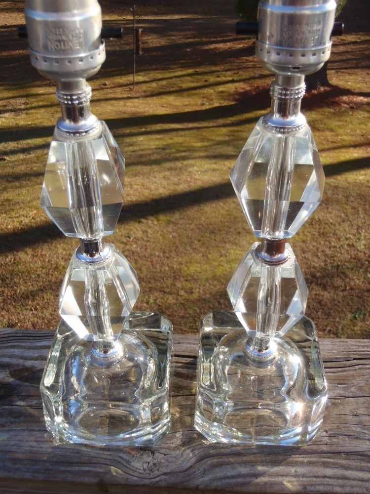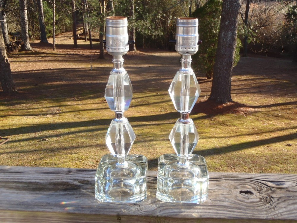 Up for bid here is a vintage pair of mid century art deco clear acrylic/lucite and glass 3 tier electric boudoir dresser table lamps, ca 1950s-1960s. These as came out of an Estate, but the maker and exact age is not known. These lamps are in very good p re-owned working condition with minimal surface patina/use and no chips or cracks. The lamps are tiered and the top two tiers are made of thick clear acrylic or lucite, silver color spacers, and the bases are clear thick glass. Each lamp measures approx. 12" tall by 3 1/2" square at the base. Each lamp also has an approx. 60" long electrical cord with plug in. Folks, this is a lovely Art deco pair of electric boudoir dresser table lamps and it they would go wonderful in a collection or home. U SPS Ground/Parcel and FedEx Ground/Home Delivery mail true calculated shipping costs is based on a insured well wrapped and packed 7 lb shipment, box size 16Lx9Wx7H. If you would like to see the all the available shipping services with calculated shipping costs, please look under the Shipping & Payments tab above the Item Specifics on our auction page or scroll down to the Shipping, returns & payments section and hit the small arrow on the right of Returns, thanks. NO WORRIES ... YOU CAN BID HERE IN CONFIDENCE! We are a true U.S. seller, NOT a drop shipper and item ships from our U.S. location! As always ... Low Opening Bid and Never a Reserve! Plus, we NEVER end an auction early or CANCEL a bid after the auction has ended! PLEASE BID ONLY IF YOU ARE SERIOUS and INTEND TO PAY IF YOU ARE THE SUCCESSFUL WINNER! Our quality merchandise come directly from Estate Sales, private homes, thrift shops, and local auctions hand picked and purchased by my husband and me. As most of you may know, most vintage or used items will have some age and/or wear, and here we like to describe as accurate as possible and show many photos, so you know exactly what you are bidding on. We are human and do make mistakes, but we honestly try very hard not to here so please rest assure and bid in confidence. Typically, our photos are shot outdoors under natural lighting on a not so fancy old railroad tie, rail, against our home, or somewhere outdoors, so please excuse any camera reflection glares, white spots or specks and shadows. Yes, we are old school and our descriptions also may be more lengthy than others, but we like you know exactly what you are buying/bidding on so there are no surprises. Please read the entire description, see all photos and ask any questions before placing a bid. All emails/messages are answered. We are rural and ship by USPS Ground/Priority and FedEx Ground/Home Delivery (true calculated shipping) and (free shipping) for local pick-up. We also recycle and use over-sized boxes and new high quality packaging materials to ensure your item(s) will arrive to you safe and unharmed. We do not charge for boxes, packaging materials, gas, or handling. We do not profit any money from shipping costs or sales tax. You are only charged true actual calculated postage and all items are shipped fully insured with carrier. We ship same or next day unless it is a holiday or a weekend, then shipment will be the following business work day. Payment is due within 3 days of close of auction, unless you have made prior arrangements with us. Please bid only if you are serious and intend to pay within the allotted time frame. North Carolina buyer must pay 7% sales tax. We combine shipping to save you money and give shipping discounts on 3 or more auction wins. The eBay combined shipping calculator is not always correct, so if you win 2 or more auctions please request or wait for a combined invoice for appropriate total. Our items come from a smoke free home. We do have many pets, but all items are stored in a pet free environment until delivery day. Claims/Refunds - Please DO NOT request a return on merchandise damaged in shipping. Insurance claims can only be filed upon proof of damage (proof of damage is pictures which are most needed to file claims) and before issuing you a refund. So if your item happens to arrive to you damaged in shipping, please contact us and DO NOT THROW ANYTHING AWAY. In order to file a USPS/FedEx online claim, we must have pictures of the shipping box at every angle, shipping labels (tracking/addressee), bubble wrap, wrapping/packing materials (packing/partitions), and of course the breakage. Once we receive all the requested pictures, we can send you a full refund ASAP. If there is a problem with your order, simply contact us. As an old-school eBay Seller, we list in the spirit in which eBay was founded; a place to find vintage, unusual, rare, hard-to-find, one-of-a-kind, and various quality items at affordable prices, for you! SHOP, BID and BUY IN CONFIDENCE! SATISFACTION GUARANTEED! Please, no buyer's remorse and ask any questions before placing a bid. We have been auctioning on eBay for 26+ years and truly only want the very best for you and us both. We honestly describe all our items to the best of our knowledge and ability and show many photos, but if you have a question(s) or just need further info. or pictures, please let us know. We don't just want you satisfied; we want you to be a happy returning customer for years to come! ;) THIS IS A 10 DAY AUCTION and HIGHEST BID WINS! THANK YOU FOR LOOKING and GOOD LUCK IF YOU BID! TAKE CARE and HAVE A BLESSED DAY!
