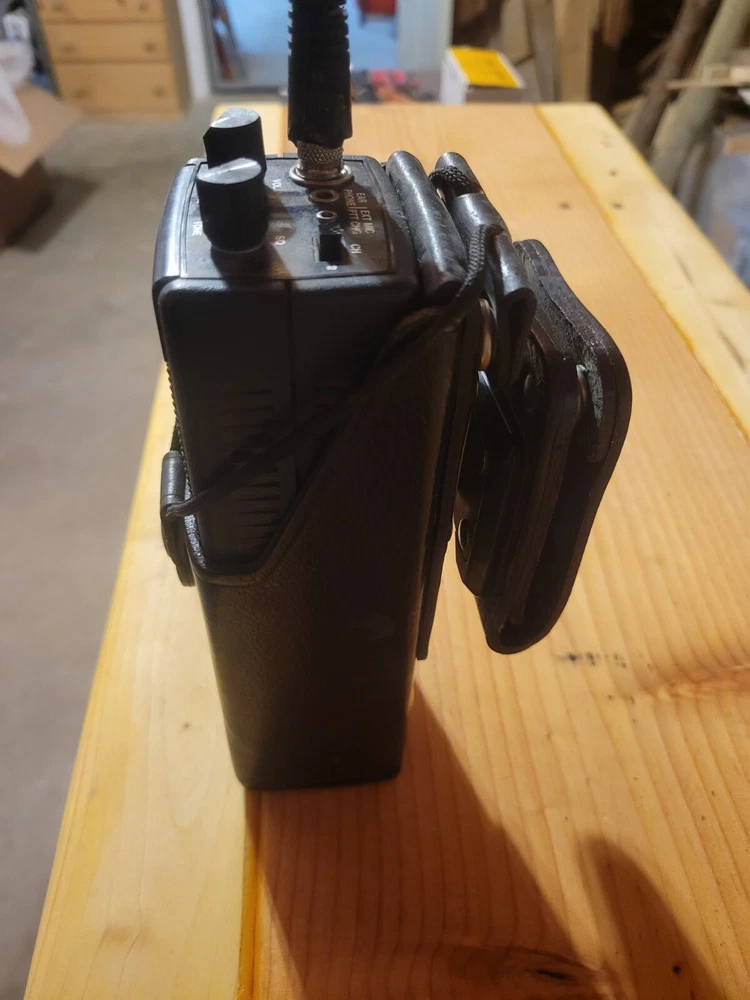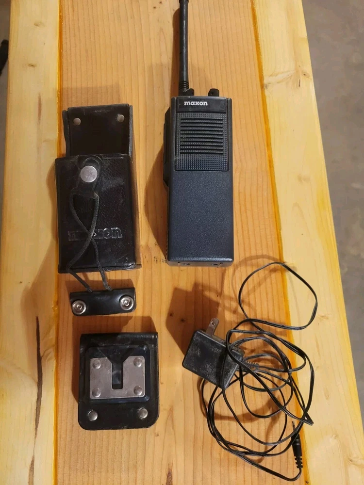 This listing is for two Maxon CP-1015 VHF Transceiver Radios along with leather holsters, holders, and chargers. These radios are made by the trusted brand Maxon. The model number for these radios is CP-1015 and they are designed for use in the VHF band. In addition to the radios, this listing also includes leather holsters, holders, and chargers to keep them safe, secure, and charged when not in use. These accessories are perfect for anyone who wants to keep their radios organized and protected. Whether you're a professional or a hobbyist, these Maxon CP-1015 VHF Transceiver Radios are a great addition to your collection. Get yours today! Both radios turn on and both chargers work when plugged in. They could use a good cleaning but look to be in good condition. The rubber on the antennas is old and is flaking off a bit, but still appear to work fine.