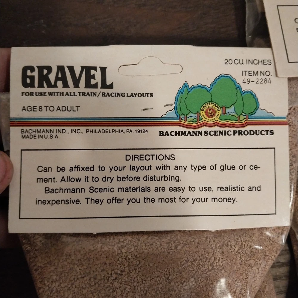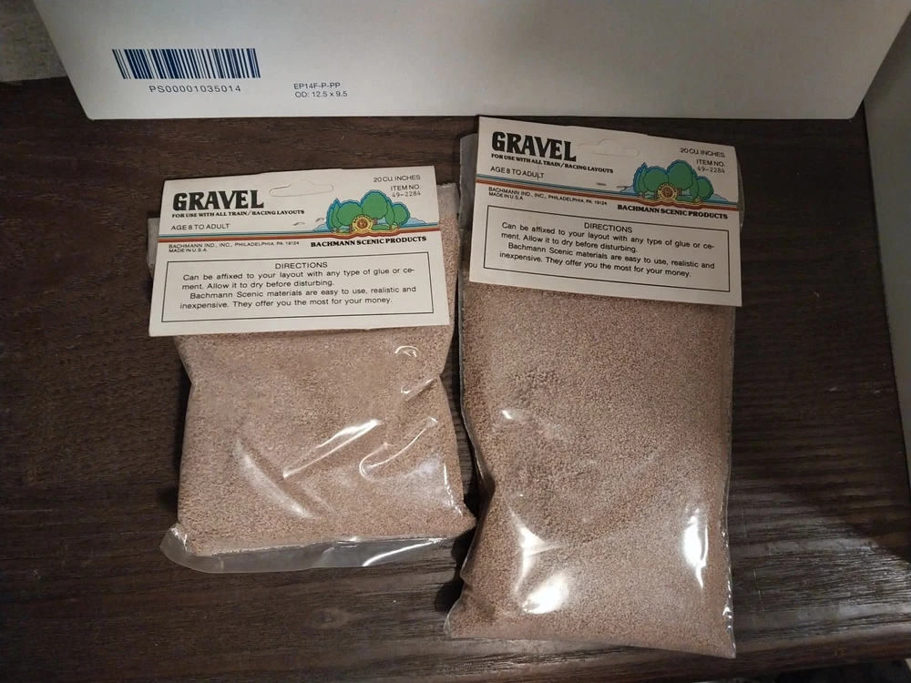 The product is a set of two new sealed Bachmann Bros Scenic Products, each containing 20 cubic inches of gravel. These items are vintage HO scale basic scenery pieces in a beige color, perfect for enhancing model railroad layouts or dioramas. Made in the United States, these gravel sets provide realistic detail for adding texture and depth to your miniature landscapes.