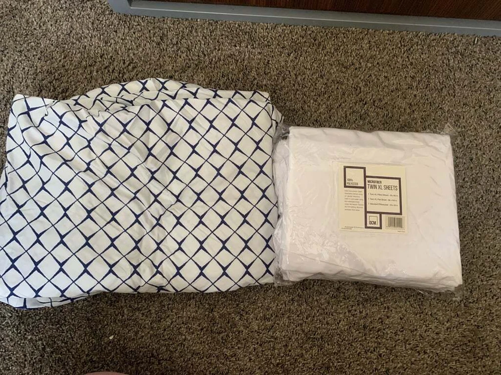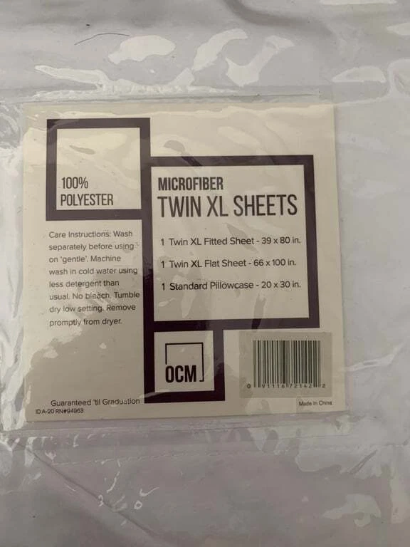 This OCM Microfiber Twin XL Sheets Set includes a white fitted sheet (39 x 80 in.), a white flat sheet (66 x 100 in.) a blue and white patterned fitted sheet (39 x 80 in.), and a blue and white flat sheet (66 x 100 in.). Made from 100% polyester, this set is perfect for a comfortable and cozy sleep. Easy care instructions: wash separately before use on a gentle cycle, machine wash in cold water, use less detergent, no bleach, and tumble dry on low setting.