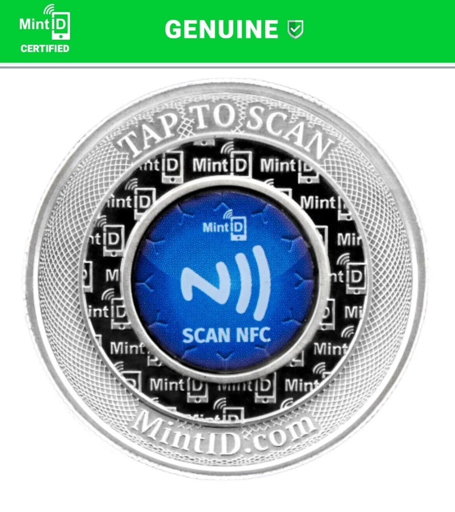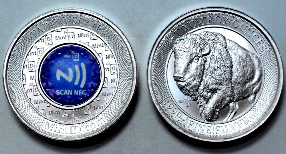 22 OZ 999 SILVER ROUND HIGH RELIEF BUFFALO BIZON HUGE COIN MintID.com TAP TO SCAN , No Reserve. This 2 oz MintID Buffalo Silver Round .999+ Fine with NFC Scan Authentication. Made with 2 troy ounces of .999+ fine silver, this is a MintID product that comes with a special, tamperproof NFC microchip. This special microchip is able to be scanned with your iOS or Android cellphone because it is linked to a cloud-based digital ID. This ID allows you to trace the scanning history of your silver rounds. When you buy silver rounds, take control of the security of your product. MintID is a company that holds the honor of manufacturing some of the world’s most secure bullion products. Each Buffalo silver round carries an AES-128 bit encryption microchip, which is completely attached to the round. This microchip meets the “Advanced Encryption Standard” (AES), which is US government-approved technology. The silver round’s microchip gives you access to authenticate your silver round at home for free with the MintID phone application. This can easily be found in your iOS or Android cellphone’s app store. After you scan your item through the application, you can access your product’s digital identity in the MintID Cloud. This allows you to trace the history of when and where your silver was scanned. And also, you do not have to worry about the microchip being removed because they are tamperproof, and the chip self-destructs if there has ever been any attempt to remove it. The obverse of the silver round showcases the American “buffalo” bison with the MintID logo beneath its head. Surrounding the buffalo is a crosshatch-style border. Inscriptions include the silver round’s weight and purity. The reverse of the MintID Buffalo silver round features the NFC microchip in the center. Behind that is a repeating pattern of the MintID logo and the same border found on the obverse. Inscriptions note the “TAP TO SCAN” instruction MintID website. You will NOT receive the exact item or with the same certificate number. This photograph is for reference purpose only. The actual item you will receive is guaranteed to be similar to that shown and exactly as described. Happy Bidding !!
