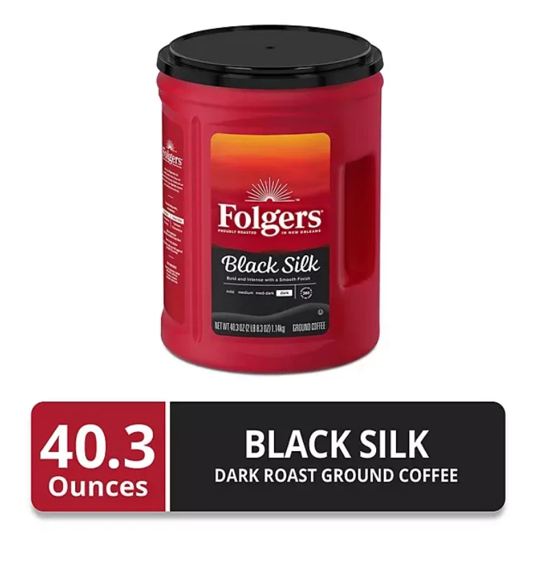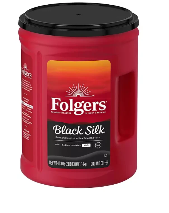 Folgers Black Silk Dark Roast Ground Coffee 2-Pack (40.3 oz Each) Bold • Smooth • Rich Flavor in Every Cup Wake up to the smooth, full-bodied taste of Folgers Black Silk Dark Roast Ground Coffee . Perfectly roasted in New Orleans, Louisiana , this dark roast delivers a strong yet silky flavor that’s never bitter — just rich, bold perfection. Product Highlights ☕ 2-Pack Value – Two 40.3 oz canisters (Total 80.6 oz) 🌄 100% Pure Mountain-Grown Coffee – Premium quality beans 🌆 Expertly Roasted in New Orleans – Authentic Folgers flavor 🔒 Interlocking Aroma Seal Canister – Locks in freshness 💪 Dark Roast, Bold & Smooth – Robust taste with a silky finish 🏠 Great for Home, Office, or Break Room Use Product Description Folgers Black Silk Coffee is designed for true dark roast lovers. Enjoy it black for a deep, intense taste — or add cream and sugar for a smooth, velvety cup. Perfect for mornings, afternoons, or evening relaxation. Every canister is sealed tight to preserve freshness and aroma , ensuring every scoop brews the same bold, satisfying flavor. Make every coffee break special with Folgers Black Silk Dark Roast — because the best part of wakin’ up is Folgers in your cup!