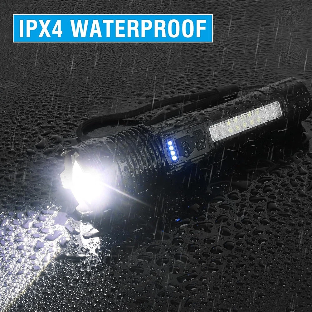 ☀ Super Bright Flashlight ✔ uses a super bright high power wick to drive away the darkness, with a maximum lumen value of 9900000 and a super long range of 1000 meters. Perfect for work, outdoor, camping, adventure and emergency. ☀ Rechargeable LED Flashlights ✔ with built-in rechargeable battery, equipped with USB-C charging port, charging time is only about 4 hours, in the brightest mode, usage time up to about 8 hours. And has a smart power indicator light 25%-50%-75%-100%, always know the power situation. ☀ 7 lighting modes ✔ The main light 3 modes, click the switch to enter (super bright - medium bright - flashing), side lights 4 modes, long press the switch to enter (super bright - medium bright - red - red and blue flashing), the flashlight can be turned off directly after 10 seconds of operation in each mode without having to cycle through all the modes. ☀ Tactical flashlight, adjustable focus. Many people say that the flashlight is too heavy, we solved this problem by using a high-quality ABS flashlight body and aluminum head. Combines quality with weight reduction. The flashlight weighs less than 150 grams and is much easier to use. ☀ Package includes: 2 x Flashlight, 2 x Build in Battery, 2 x Charging Cable, 2 x Rope. We have carefully checked all items before shipping to ensure that the product works properly. If you have any questions, please feel free to contact us to get the best solution within 12 hours. Note: 1. Due to the high working power of the super bright flashlight, the LED light position will generate more heat, please do not touch the light-emitting position (ie the head of the flashlight) with hands; 2. Do not use the flashlight in water, do not immerse; 3. Do not irradiate the human eye; 4. Do not give it to children to use.