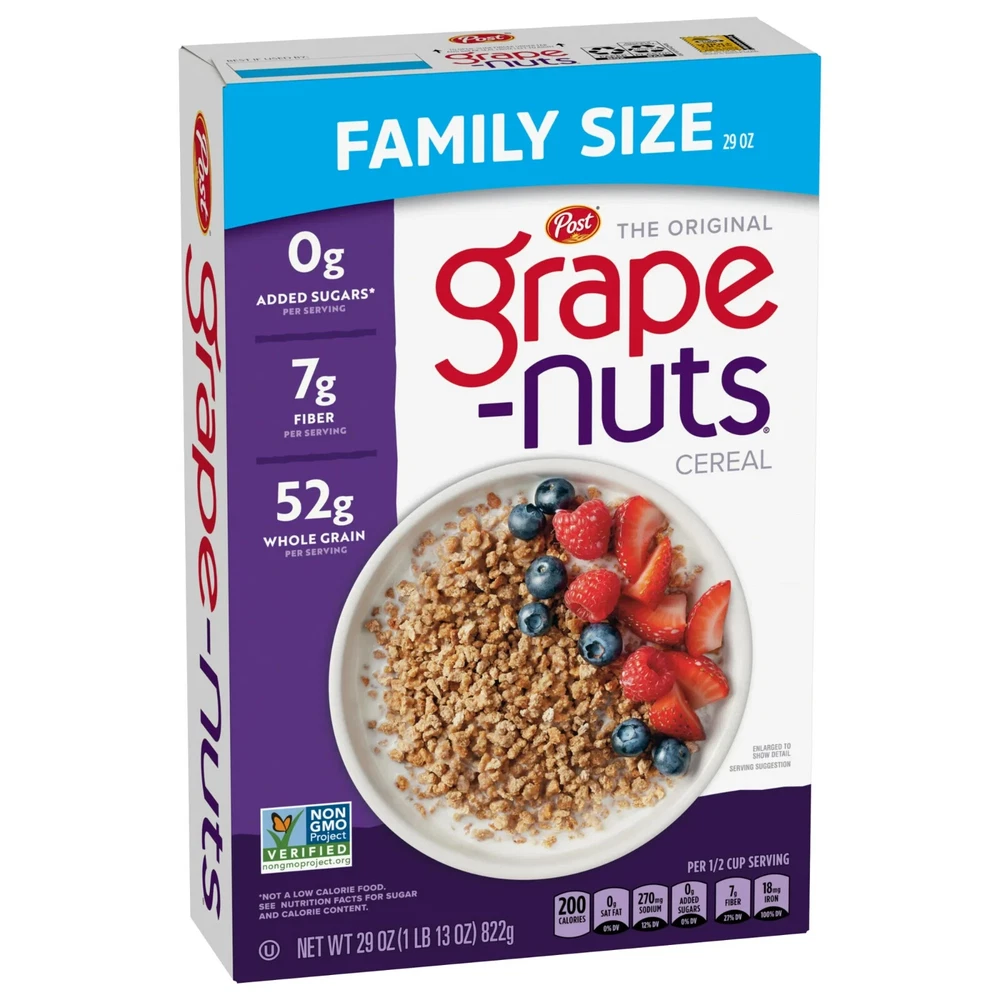 (2 PACK ) New Post Grape Nuts Original Breakfast Cereal, 29 oz BUY WITH 100% RISK FREE DESCRIPTION: Post Grape-nuts Original Breakfast Cereal Packs Plenty Of Punch And Even Bigger Crunch For The Modern-day Active Lifestyle In An Instant. Post Grape Nuts Cereal Is Non-gmo Project Verified And Features Whole Grain Wheat And Barley Baked Into Sweet, Uniquely Crunchy Nuggets Of Cereal. An Excellent Source Of Fiber With 7 Grams Per Serving, Grape-nuts Is A Heart-healthy (2) Option With 52 Grams Of Whole Grain Per Serving (1) For 100% Of Your Daily Whole Grain Recommendation. It's Also High In Iron And Folate. Enjoy A Crunchy Bowl Of Ready-to-eat Breakfast Cereal In The Morning To Help Get Your Day Off To A Great Start. With Its Extreme Crunchiness, This Whole Grain Wheat And Barley Cereal Adds Texture And Crunch To Ice Cream, Yogurt Parfaits And Other Favorites. Keep A Cardboard Box Of Shelf-stable Grape-nuts On Hand For A Crunchy Breakfast Everyone Will Go Nuts Over. (1) Nutritionists Recommend Eating 3 Or More Servings Of Whole Grain Foods Per Day (About 16g Whole Grain Per Serving Or At Least 48g Per Day). (2) Diets Low In Saturated Fat And Cholesterol, And As Low As Possible In Trans Fat, May Reduce The Risk Of Heart Disease. FEATURES: One 29 oz box of ready-to-eat Post Grape Nuts Original Breakfast Cereal Post Grape-Nuts Cereal is a heart-healthy (2) breakfast cereal option that offers an extremely crunchy texture in your morning cereal bowl Grape Nuts Cereal is Non-GMO Project Verified and made with whole grain wheat and barley baked into sweet crunchy nuggets Contains 52g of whole grain (1) and 7g of fiber per serving and is high in iron and folate in an instant Enjoy a bowl as part of breakfast or add crunch and texture to yogurt parfaits and ice cream Stock up on boxes of Grape-Nuts for a crunchy, delicious breakfast cereal option Fuel your sense of adventure with Post Grape-Nuts Breakfast Cereal Shelf-stable cardboard box WE SHIP TO LOWER 48 STATES ONLY. WE CANNOT SHIP TO APO/FPO OR PO BOXES. WE OFFER 30 DAY MONEY BACK GUARANTEE COMMUNICATION If you have a problem or question regarding your transaction please contact us before leaving any type of feedback. We will work with you to resolve any problem you may have. Customer Satisfaction Is Very Important To Us. If You Have Any Problem With Your Order, Please Contact Us And We Will Do Our Best To Make You Satisfied, Please Do Not Leave Negative Feedback Before We Resolve Your Problem, We Guarantee That Your Issue Will Be Solved Quickly.