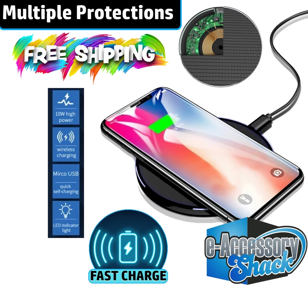 2 PACK Wireless Fast Charger Charging Pad Dock for Samsung iPhone Android Cell Phone Will charge most phones from empty to full in 3-4 hours or so as long as you use a 10w or higher power source. That means the power source's output is rated at 2A/5V or higher. 3-4 hours charge time is considered "fast" by most industry standards. Do faster ones exist? Yep, and I sell those too, in my eBay store at a higher price. This one for sale here is a very good combination of value vs performance. Go to bed at night and put your phone on this, it will be fully charged in the morning every time. I offer 60 day free returns for ANY reason. Buy with confidence. Specifications: Color: Black Output: 5W/7.5 W/10W Charging efficiency:>75% Charging frequency: 110-205 kHz The package includes: 2 x Wireless Fast Charger Pad 2 x 3ft Micro USB Cable Power Source is NOT included, but I sell them in my eBay store if needed. You'll save a % if you by 2 or more items from my store at one time, applied on last page of checkout. Typically it's 1% off for 2 items, 10% off for 3 items, 21% off for 4+ items at one time.
