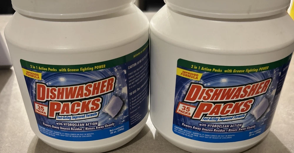 The product is a set of 2 packs of dishwasher packs, with each pack containing 35 pouches. These dishwasher packs are 2-in-1, designed for use in dishwashers to effectively clean dishes. They are scent-free and weigh 20 oz. Each pack is intended for single-use in a dishwasher and is convenient for households looking to keep their dishes clean and sparkling. Made in China, these dishwasher packs offer a hassle-free cleaning solution for daily dishwashing needs. Thank you for looking!