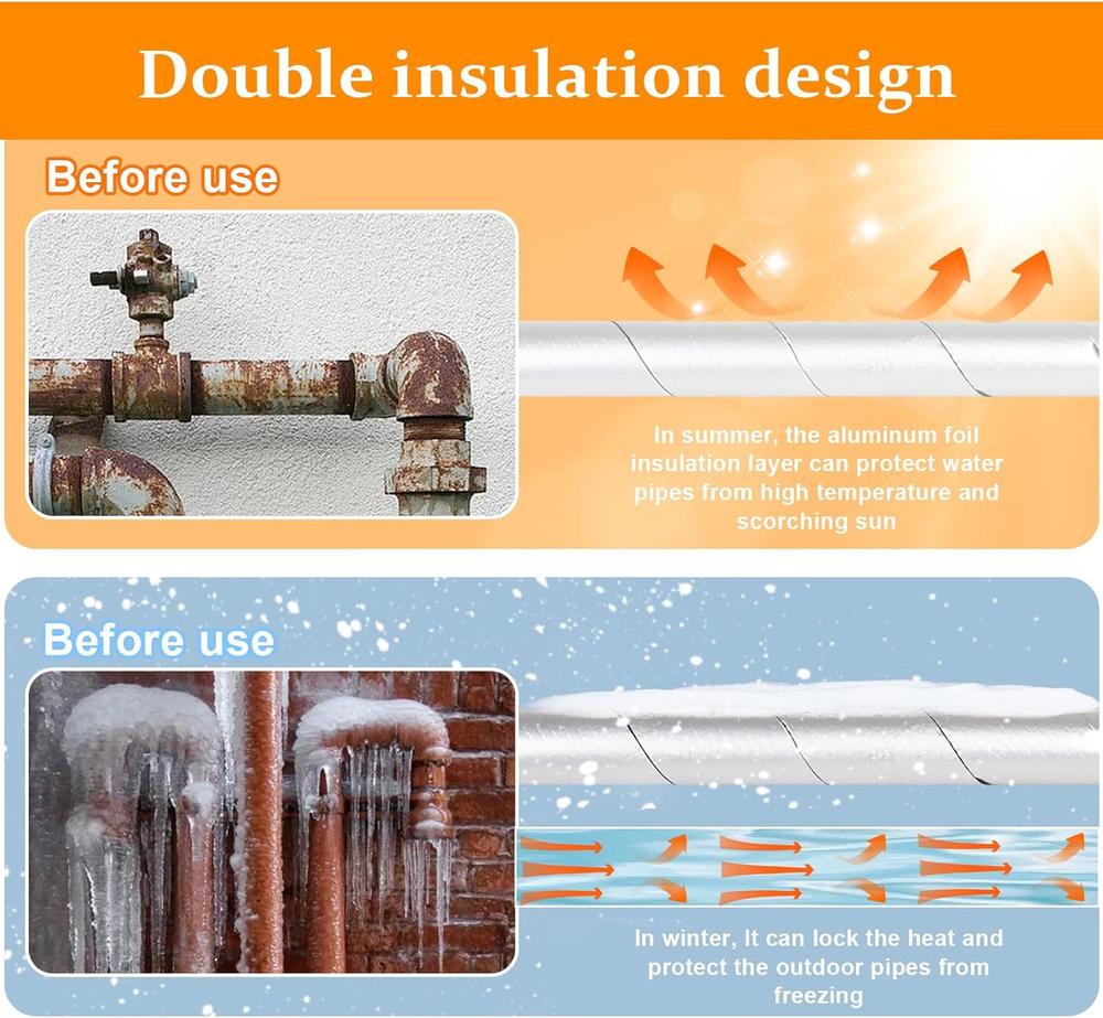 2 PCS 33Ft Foam Insulation Tape Pipe Insulation Wrap Waterproof Self Adhesive NICE THERMAL INSULATION: crafted from 0.2 inch thick foam, this pipe insulation wrap keeps heat in and cold out, ensuring your pipes stay at the right temperature FIRE RESISTANT FOIL LAYER: the pipe insulation wrap features aluminum foil layer, enhancing fire resistance, protecting your pipes, extending their lifespan by preventing corrosion and weather damage FIRE RESISTANT FOIL LAYER: the pipe insulation wrap features aluminum foil layer, enhancing fire resistance, protecting your pipes, extending their lifespan by preventing corrosion and weather damage WEATHER RESISTANT AND DURABLE: made from cotton and foil, the pipe insulation foam withstands harsh weather, providing reliable insulation in both heat and cold EXTRA LONG FOR FULL COVERAGE: you will get 2 rolls of foam insulation tapes, each roll is 10 m/ 33 ft long, 5 cm/ 2 inch wide, 0.5 cm/ 0.2 inch thick, enough length to cover more area Product Description Item model number Pipe Insulation Wrap Item Thickness 0.2 Inches Color 2 roll Product Dimensions 32.8"L x 2"W Material Foam Country of Origin China Item Weight 10.2 ounces Batteries Included? No Coverage 11 sq ft Included Components 2 Pack Pipe Insulation Wrap Complimentary Shipping and Easy Returns Need to return something? Enjoy our 30-day hassle-free return policy! Take advantage of free shipping across all 48 contiguous states! Your order will be dispatched within 1-2 business days once payment is confirmed. Your Opinion Matters! Your happiness is our main goal! We welcome your feedback! If you encounter any problems, reach out to us right away, and we’ll be here to help. Explore the Extraordinary! Our collection showcases fascinating products that are sure to capture your attention. What surprises await you? Delve in and discover unique items that enrich your daily life. Don't miss the amazing things we have in store for you!