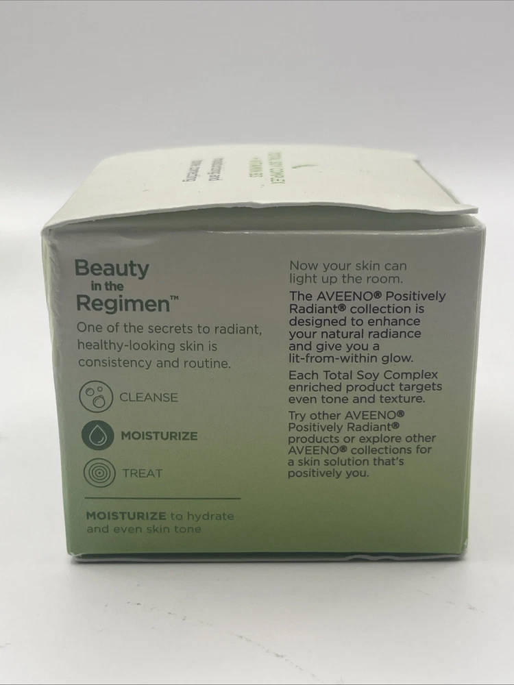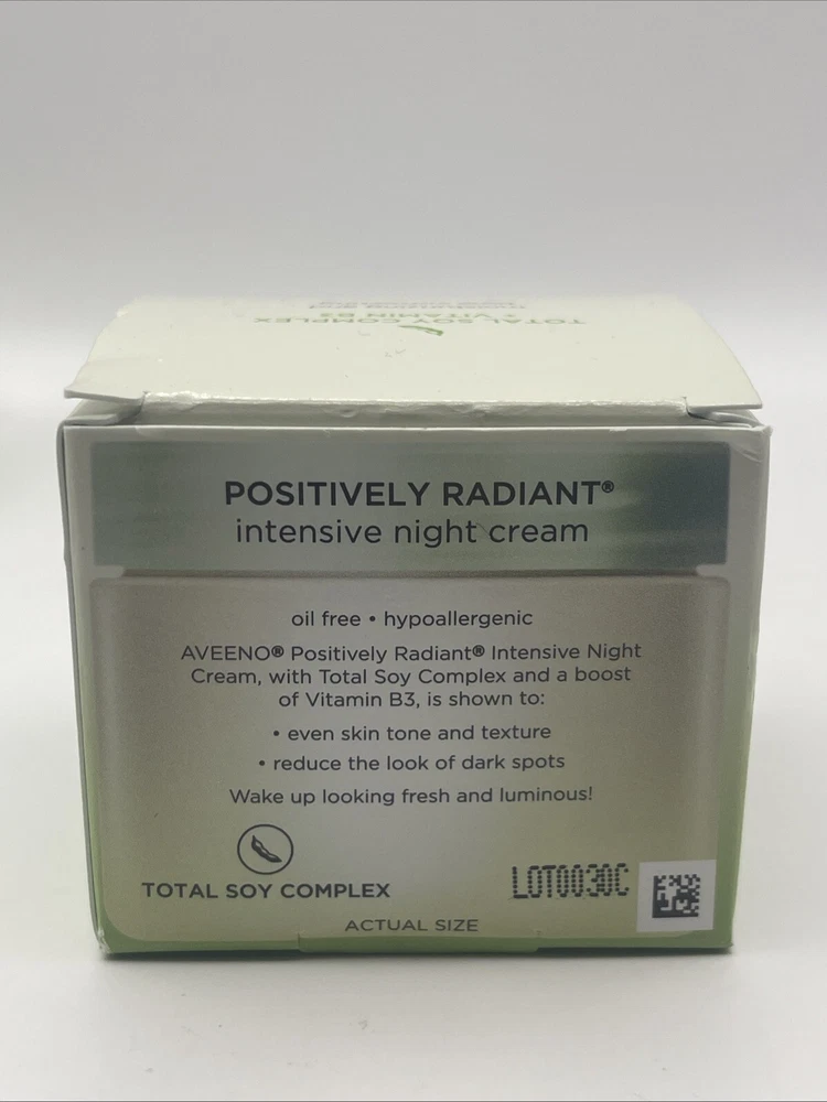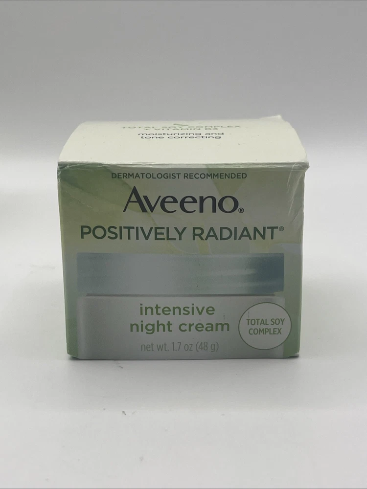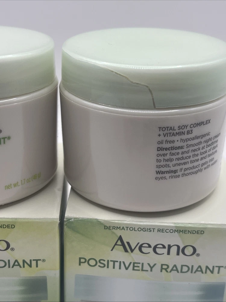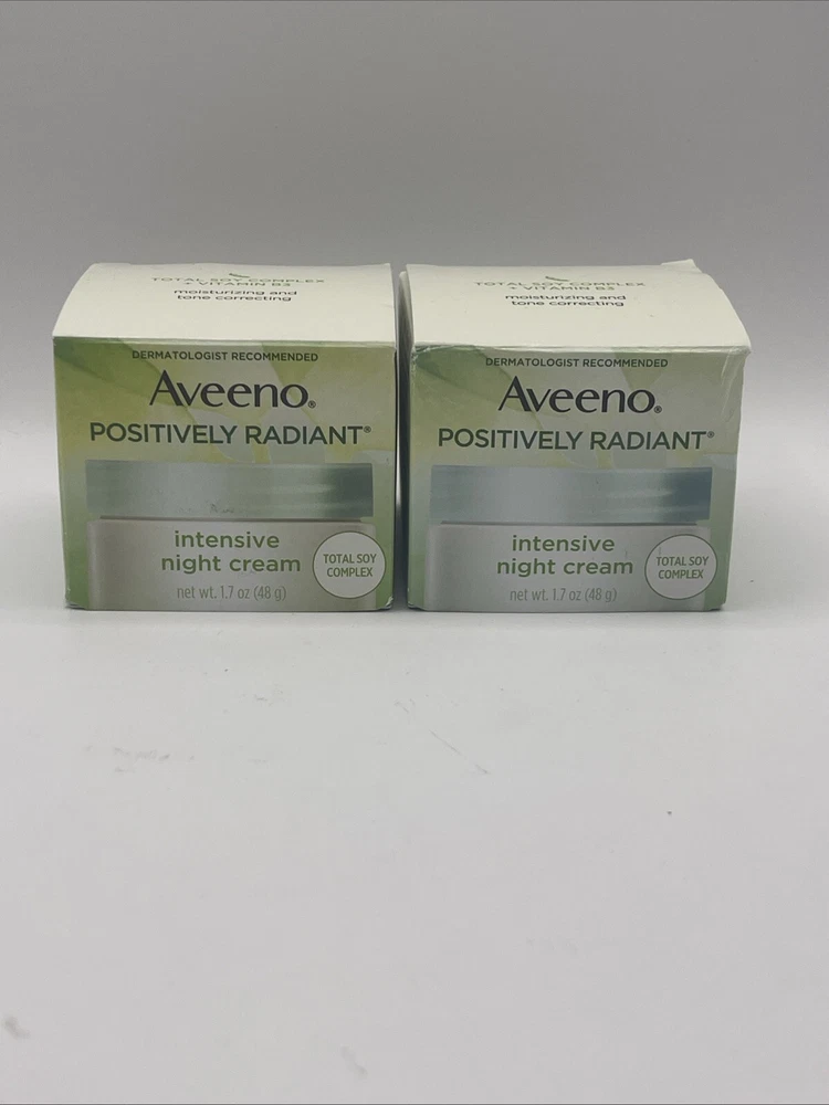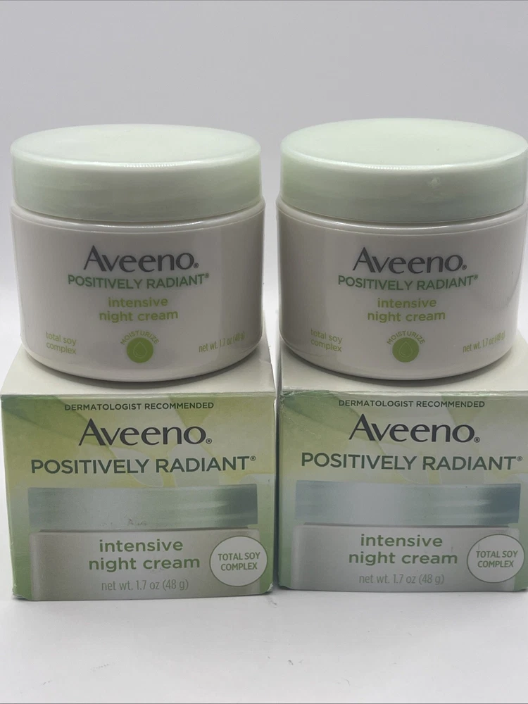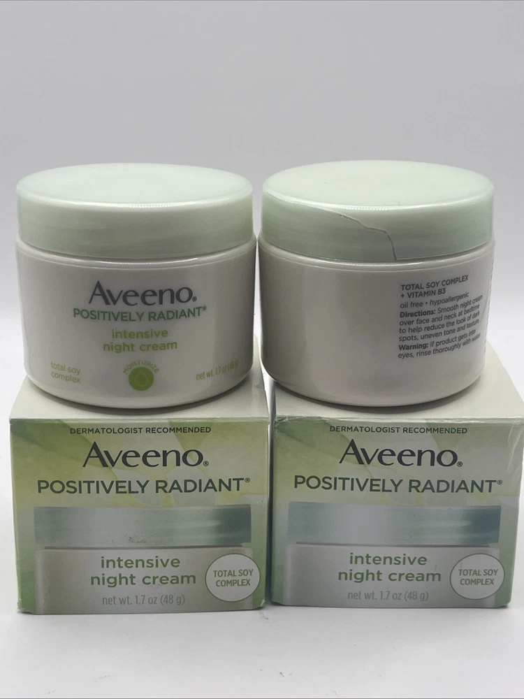 2 PK- Aveeno Positively Radiant Intensive Night Cream 1.7 oz Total Soy Complex. Please note the small crack on the lid of 1 container as shown in the last picture. Thanks for looking!