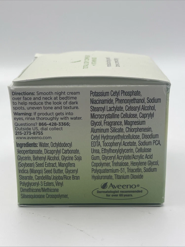 Skin Type: All Skin Types Features: Hydrating, Hypoallergenic, Oil-Free, Discontinued, Vitamin B3 Main Purpose: Moisturizer, Tone Correcting UPC: 381371162499 Country/Region of Manufacture: United States Type: Night Treatment Body Area: Face, Neck Volume: 1.7 fl oz Product Line: Aveeno Positively Radiant Department: Unisex Formulation: Cream Brand: Aveeno Size: Regular gtin13: 381371162499