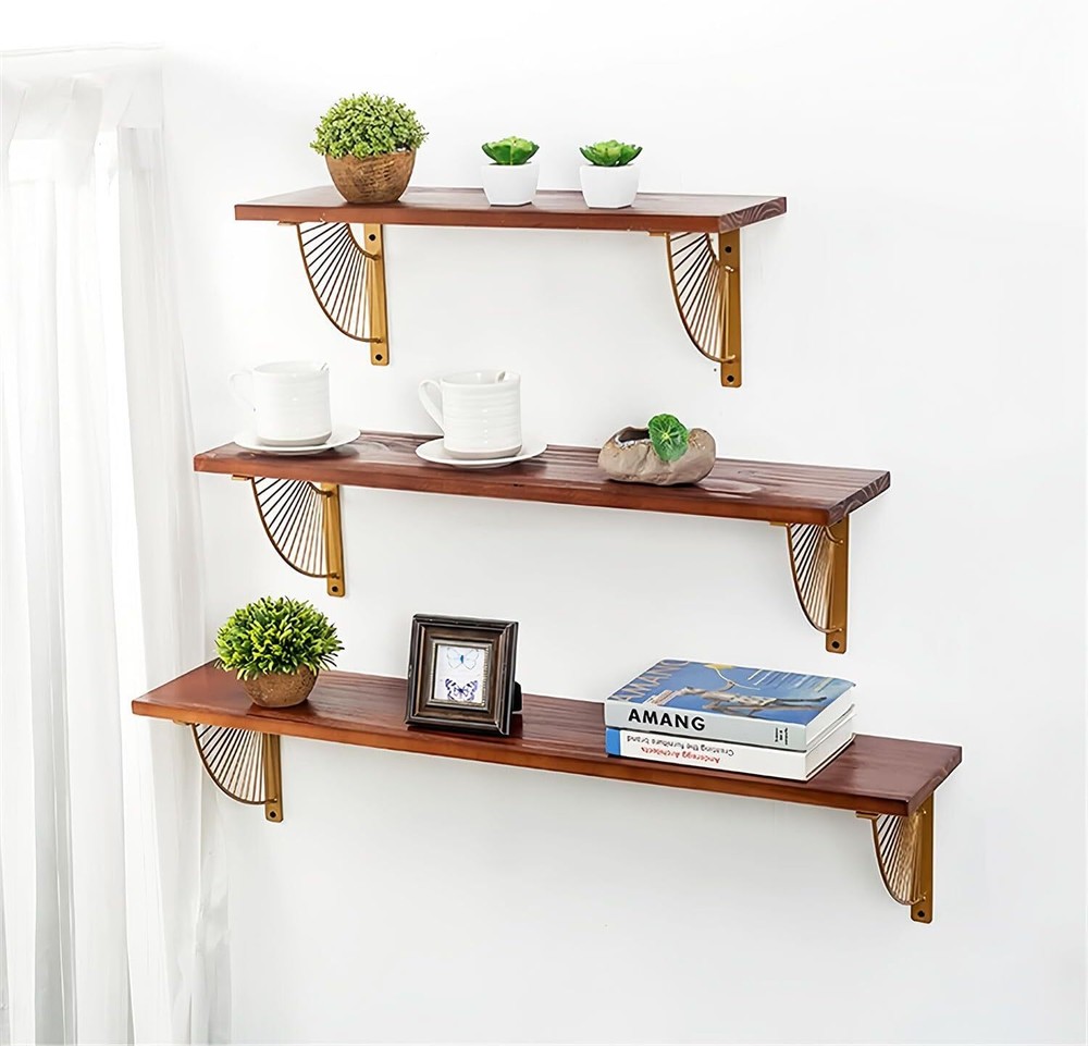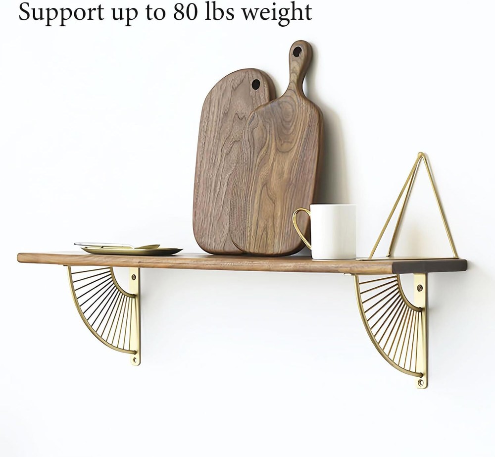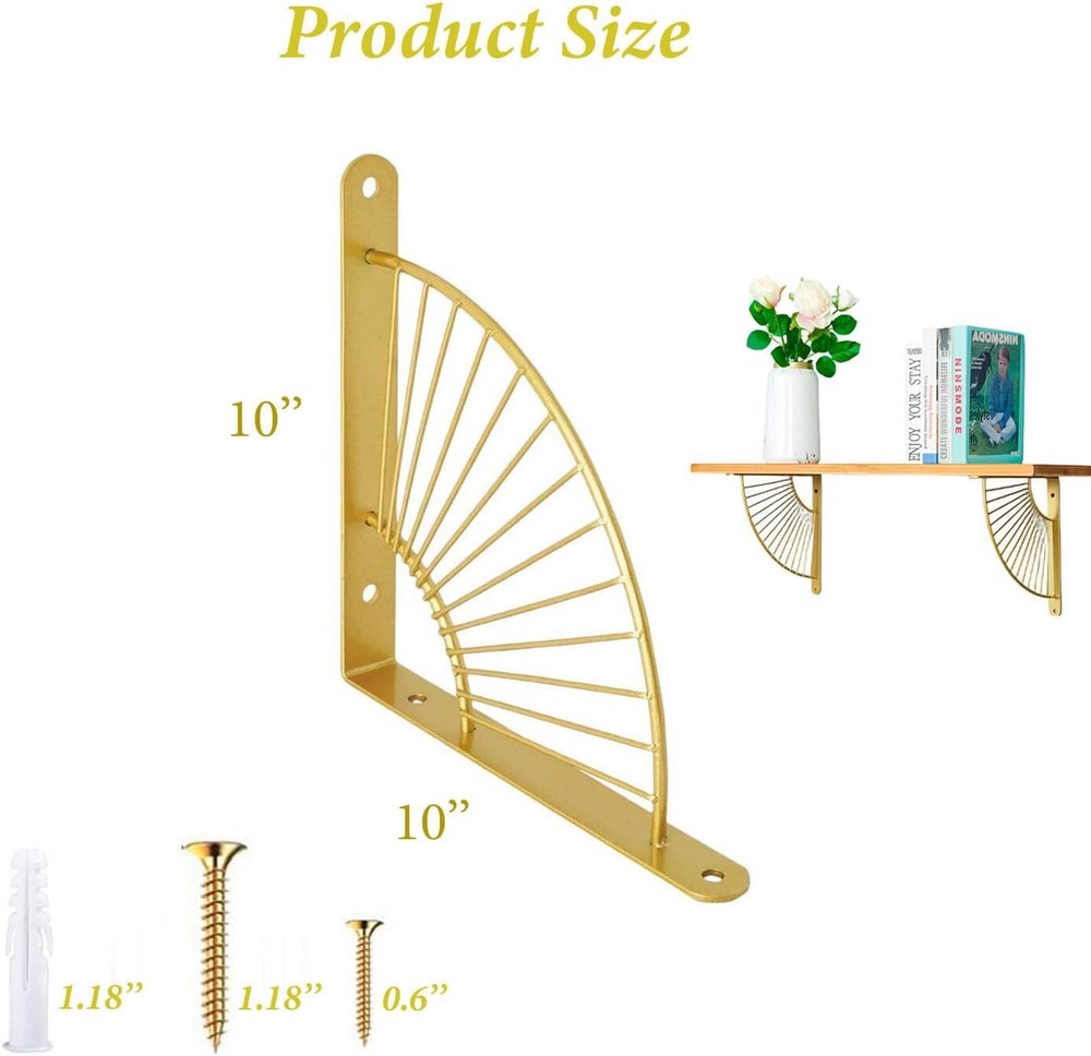 2 Pack Gold Shelf Brackets 10 inch Metal Shelves Bracket Wall Mounted Heavy D... 【Material】 The shelf brackets are made of high quality and is heavy enough to support maximum (80lb) weight. The heavy duty shelf brackets will add extra storage room for you. It is perfect for most DIY opening shelving project. Note: Please confirm product size before purchase. 【Easy installation】 For fixing screws on any wall or wooden surface, mark and drill pilot holes with a drill bit appropriate for the mounting hardware. Insert and tighten the screw. 【Size】10'' long suitable for floating 10-12 inch deep wooden shelves. Sturdy enough for your home decor. 【Wide Application 】This multi-purpose shelf supports could be used for any shelf install, ideal for the kitchen, bathroom, bedroom, office & more. It is a perfect decorative bracket for wood, especially for creating a trendy style. 【Package Contain】 2Pcs of 10 inch shelf bracket and all necessary hardware. All our wall brackets are packed in an individual bags to prevent any scratch during transportation. (board is not included).