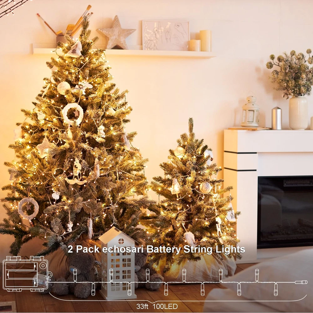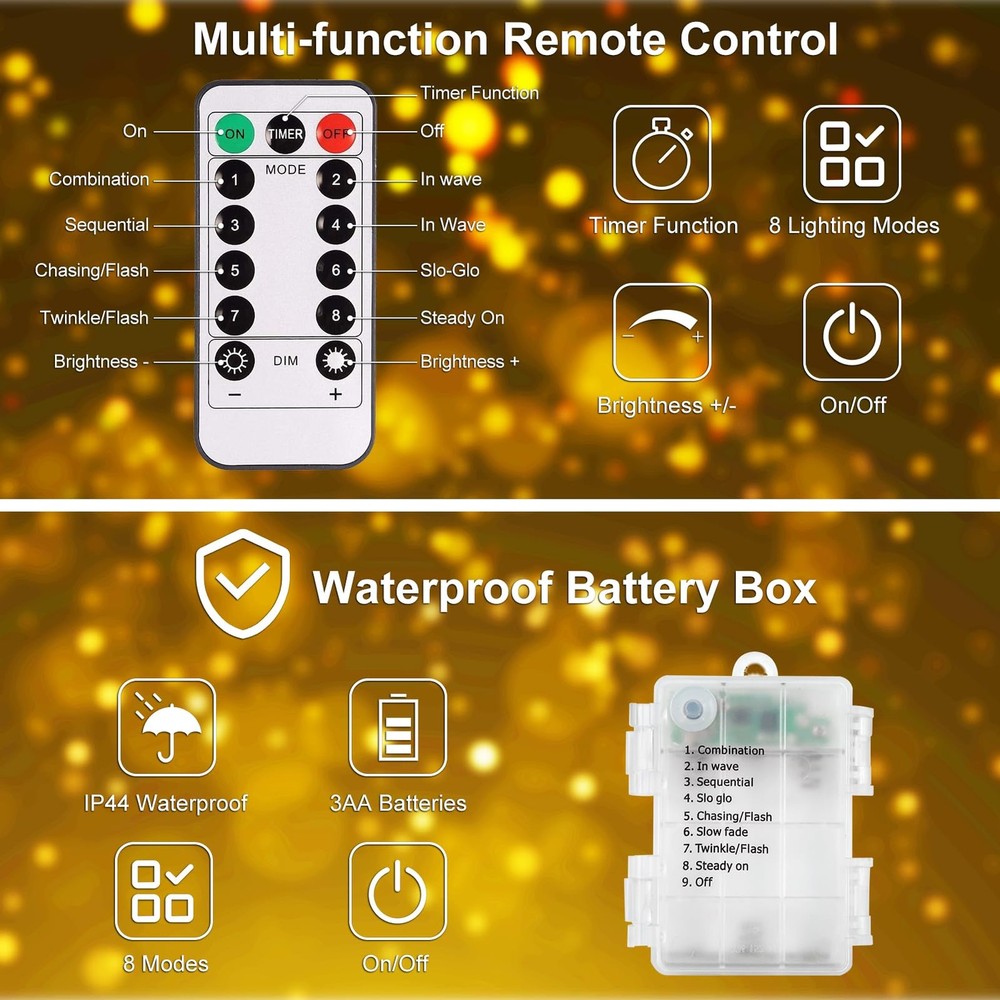 2 Pack Battery String Lights 33Ft 100LED Fairy String Lights with Timer Remote 8 Modes Twinkle Lights for Valentine, Easter, Wedding, Christmas, Girls Bedroom, Patio, Indoor Outdoor Decoration Specification: Light Color: Warm White LED Quantity: 2*100 Strip Length: 2*33ft Lead Length: 50cm Waterproof Rate: IP54 Power Source: 3 AA batteries (not supplied) 8 Modes: Combination/ Wave/ Sequence/ Slow/ Chase/ Flashing/ Slow fade/ Flashing/ Flickering/ Steady on Package Content: 2 x 100 LED waterproof battery fairy lights string Longer String Lights: 2 pack 33ft led battery string lights with 100 led lights, which are providing enough length to surround and decorated the objects,like the Christmas tree, curtain,staircase, terrace, trees. Illuminate your outdoor and indoor spaces with these cozy bright fairy light Timer & 8 Lighting Modes: Warm white string lights battery operated come with a remote to set timer function for 6 hours on and 18 hours off and adjust the 8 Lighting modes and brightness to suit your mood or occasions Outdoor Waterproof String Lights: Our twinkle string lights are designed with IP54 waterproof rating to withstand various weather conditions. You can place the battery string lights outdoor and indoor Safety and Energy Saving: LED string lights are powered by 3 x AA batteries (not included),lower output won't overheat after long time use. High safety for pet and kids. Low consumption also can provide a bright and consistent light Widely Appication: Fairy string lights is perfect decoration for outdoor and indoor, adding the wonderland charm for bedroom, wedding, Christmas tree, terrace, patio, lawn, balcony, porch, garden, commercial building, shopping center etc