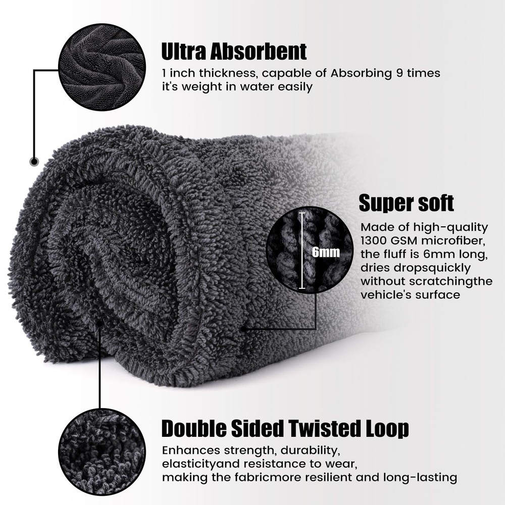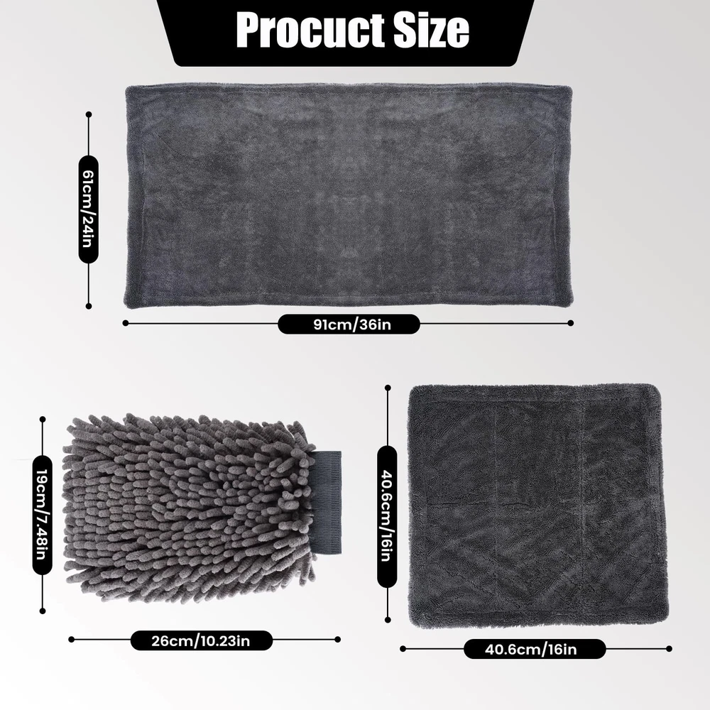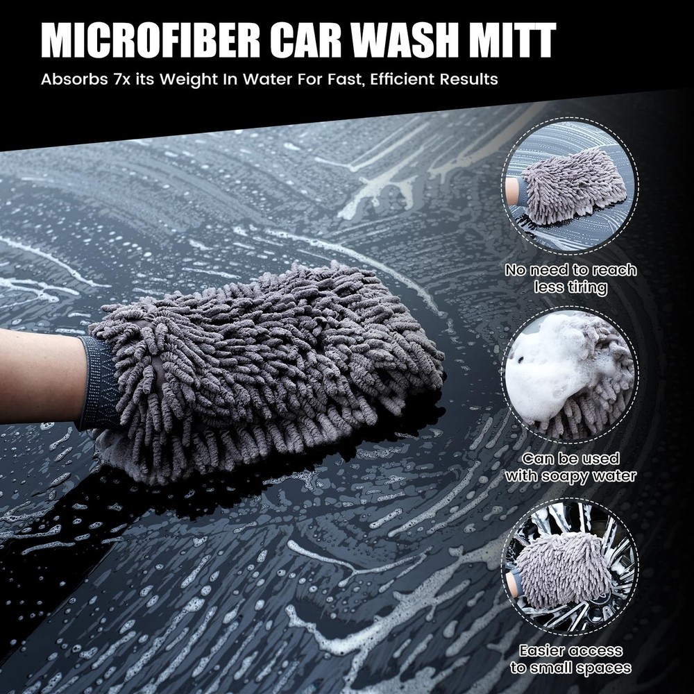 1 COMPLETE CAR WASH KIT - This car cleaning kit includes a 24" x 36" microfiber towel for the entire car body and a 16"x16" microfiber cleaning cloth perfect for windows, mirrors. The car wash mitt for wheel, rim, wing mirrors and many other awkward angles around the car. The car detailing brush perfect for car interior, the comprehensive car detailing kit ensures effective and thorough car cleaning for both exterior and interior without any scratches, lints, and streaks leaving behind PREMIUM TWISTED LOOP MICROFIBER - Made with ultra-soft 1300GSM microfiber, our drying towels car detailing provides superior water absorption, dry your entire car or truck in just one stroke with this microfiber drying towel. Ensuring a streak-free finish and ultimate drying performance for all vehicles SUPER ABSORBENT & VERSATILE - This car towels drying are designed to be soft yet highly effective. The edgeless design and premium microfiber ensure a smooth, scratch-free clean on all paint finishes. The 1300 GSM microfiber towels for cars has ultra-absorbent, absorbs over 6 times more than other towels. The large size and advanced microfiber design make it ideal for drying large vehicles like SUVs and cars DURABLE & EASY TO CLEAN - Machine washable and built to last, these microfiber cleaning cloth are perfect for regular use. They’re suitable for low-temperature drying, ensuring they remain in top condition for hundreds of washes. These durable microfiber towels for cars simplify your cleaning routine and quickly dry for repeated use, making them an excellent choice for busy households and auto enthusiasts GENTLE YET EFFECTIVE HAND CAR WASH MITT - The car cleaning mitt with double sided high density & soft microfiber chenille noodles holds 7x its weight in soapy water, allowing you to softly yet quickly cover large surfaces. They mould well to the shape of the hands, enabling easier reach to every little spot like rims, air vents. Elastic wrist cuff helps keep mitt in place on hand