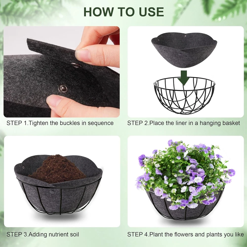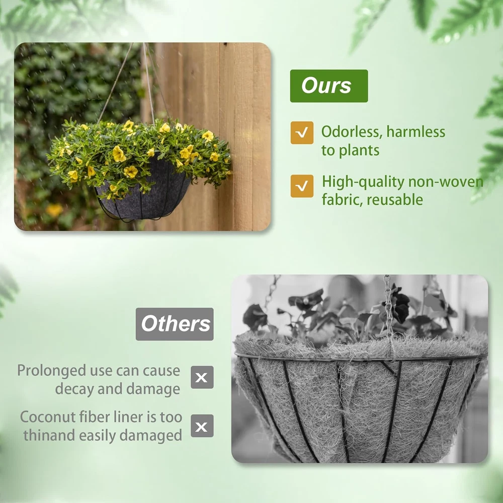 Store New Arrivals Add to Favorite View Feedback Contact 2 Pack 14 Inch Hanging Plant Basket Liner,Round Fabric Plant Baskets Indoor with Liner, Coco Fiber Liners for Plants Garden Outdoor and Indoor (2) Description Planter Form Plant Pot Included Components Liner Style Modern Number of Pieces 2 Mounting Type Hanging Item Dimensions 14 x 14 x 0.07 inches Color Black Pattern Solid Item Dimensions D x W x H 14"D x 14"W x 6.7"H Material Non-woven Fabric Material Type Non-woven Fabric Shape Round Indoor Outdoor Usage Outdoor, Indoor Additional Features Breathable Special Feature Breathable Style Name Modern Number of Items 2 Package Include:You will receive 2 Pack basket liners with a diameter of 14 inches and a depth of 6.7 inches.Suitable for various hanging baskets and flower pots. Our circular replacement liners are the best choice for growers, and these pads are perfect for your plants. Safe Material:Our plant padding is made of thickened non-woven fabric. Compared to coconut fiber basket liners, our padding has no unpleasant odor and is not easy to tear, ensuring its service life. Breathable Design:The hanging flowerpot lining is breathable, allowing water to be discharged well, and drainage and ventilation ensure good growth of plant roots. Durable and can be reused in multiple seasons. Easy to Use:Open the received lining, press the button, and the installation will be completed. Then lay the lining in a 14 inch hanging basket, adding soil and your beautiful plants and flowers. Suitable for Indoor and Outdoor:The black inner lining of the hanging basket can be well matched with the hanging flower pot, and can be used for indoor and garden decoration, to plant flowers, plants, herbs, etc. Whether outdoors or indoors, it is convenient for you to use. Product Description The video showcases the product in use. The video guides you through product setup. The video compares multiple products. The video shows the product being unpacked. 14 Inch Hanging Plant Basket Liner Thickened non-woven lining, 4 concealed buttons, enhanced drainage performance, so that the plant more healthy growth. If you don't know how to use it, check out the video. Odorless and harmless to plants High-quality Non-woven Fabric They are made of thick felt fabric. These replacement plant liners look great and keeps the focus on the plants. They're quality made and come with snaps that keep the liner in shape. How To Use Step 1 Tighten the buckles in sequence. Step 2 Place the liner in a hanging basket. Step 3 Adding nutrient soil. Step 4 Plant the flowers and plants you like. Felt Fabric Compared to coconut fiber basket liners, our padding has no unpleasant odor and is not easy to tear, ensuring its service life. Coconut Fiber I am used to using coconut fiber lining and they look really bad after a few weeks. This lining looks very neat and the water drips out easily without the liner falling apart. Perfect For Your Garden Policy on Product Sourcing and Fulfillment Dear Valued Customers, We would like to clarify an important aspect of our business operations to ensure transparency and trust in our relationship with you. Product Fulfillment: Fulfillment by Amazon (FBA): The products are stored in Amazon Fulfillment Centers. This storage solution ensures that the inventory is kept in a secure and climate-controlled environment, which helps maintain the quality and safety of the products. Efficient Delivery: Utilizing Amazon's fulfillment services allows us to leverage their robust logistics network to provide you with fast and reliable shipping. This means you receive your purchases in a timely manner with the added assurance of Amazon's trusted delivery systems. Customer Assurance: Quality Control: Every product is carefully selected and undergoes rigorous quality checks before being listed for sale. Our commitment is to provide you with high-quality items that meet your expectations. Secure Storage: Amazon's Fulfillment Centers are renowned for their high standards of security and efficiency. Your products are stored safely until they are shipped to you. Customer Support: Should you have any questions or concerns regarding your purchase, our customer support team is readily available to assist you. We are dedicated to ensuring your satisfaction with every transaction. We appreciate your business and are committed to providing you with a seamless and satisfactory shopping experience. Thank you for your trust and understanding. Sincerely, -Manager- Shipping Policy and Expectations Dear Valued Customers, We are committed to ensuring that your package arrives as quickly as possible. However, we kindly ask for your understanding regarding certain factors that may occasionally affect shipping times. Our Commitment: Prompt Processing: We strive to process and dispatch your orders promptly to minimize any delays. Reliable Shipping Partners: We work with reputable shipping companies to ensure your packages are handled with care and delivered efficiently. External Factors: While we do everything within our power to expedite your order, please note that some factors are beyond our control: Weather Conditions: Severe weather can impact shipping routes and cause delays. High Postal Traffic: During peak seasons, such as holidays, the increased volume of packages can lead to longer delivery times. Shipping Company Performance: The performance and schedules of shipping companies may vary, potentially affecting delivery times. We appreciate your patience and understanding in these situations. Rest assured, we are doing everything possible to get your package to you as soon as possible. Customer Support: If you have any questions or concerns about your order, please do not hesitate to contact us. Our customer support team is here to assist you and provide any necessary updates on your shipment. Thank you for your trust and continued business. Shipping Policy and Customer Satisfaction Shipping Information: Service Area: We offer shippi