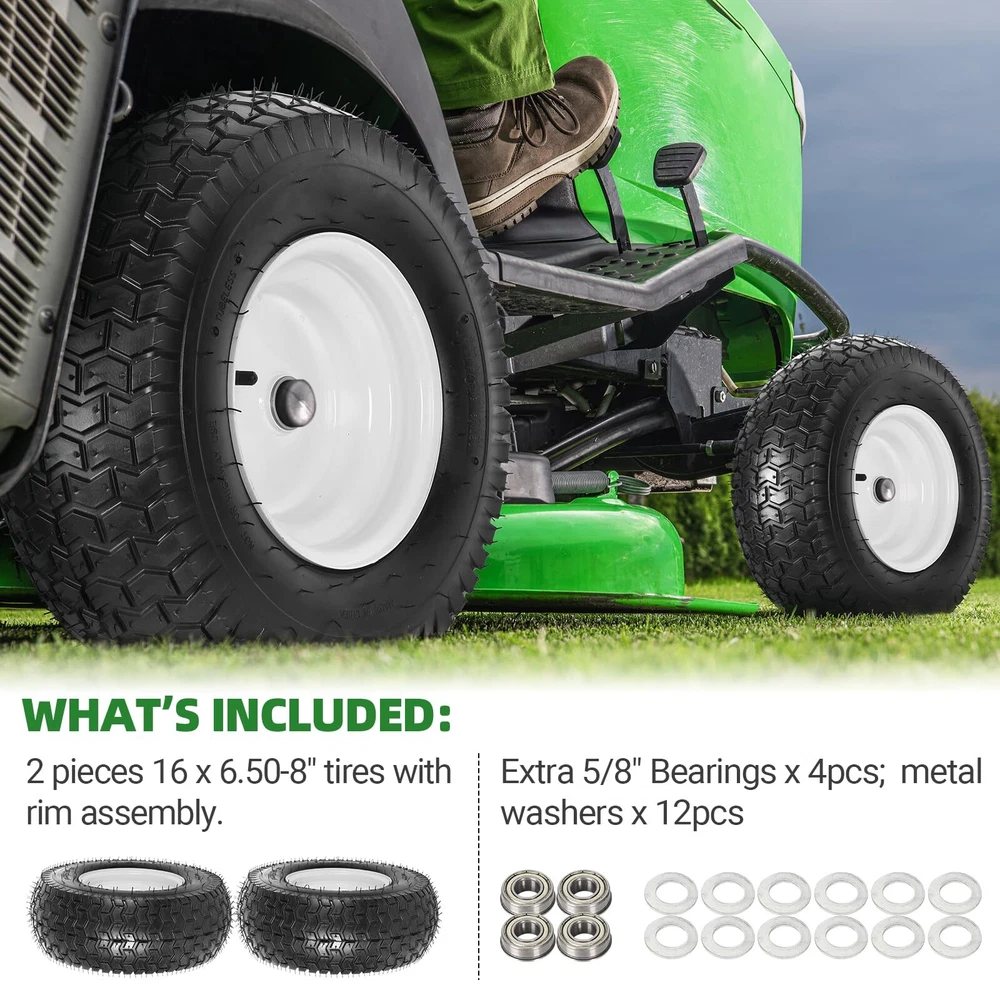 EXACT 16 X 6.50-8 TUBELESS TIRE AND WHEEL ASSEMBLIES - They're an exact for 16x6.5-8" tubeless mower tire and wheels, with John Deere Riding Mowers and most Mowers. 16 inches outer diameter, 6.6 inches section width, and 8 inches rim size. WITH MOST JOHN DEERE RIDING MOWERS: with select yard tractors, lawn mower tires, farm equipment, and other wheeled lawn and garden equipment. These are NHS tires not for use at highway speeds. Check the sidewall of your riding mower's existing front tires for information on the exact size of the tire and wheel. 3" OFFSET HUB AND 3/4" BEARINGS - This 2-pack tire and wheel assembly are also with other brands and models of riding mowers and lawn tractors. Aside from having the exact wheel size, you should also ensure that your existing riding mower's wheel assembly has a 3-inch offset hub and a 3/4-inch diameter Bearings. (Extra 5/8" Bearings x 4pcs; metal washers x 12pcs) 600 LBS MAXIMUM LOAD RATING - These tires were made for hauling and carrying relatively heavy loads. Not for highway service (NHS) tires like these are 4-PLY with a maximum PSI of 30. Made from premium quality rubber compounds that remain reliable and durable throughout all seasons. And with a maximum load capacity of 600 pounds for each tire and wheel assembly, you can do more for less. TURF TIRE TREAD FOR MINIMAL SURFACE DISTURBANCE - Mainly designed for turf, the treads on these tires have shallower depths and a wider footprint to minimize disturbance and damage on turf, natural grass, and other sensitive surfaces. These treads also offer stability on gravel and sand. There's also a noticeable improvement in both traction and maneuverability compared to regular tires.