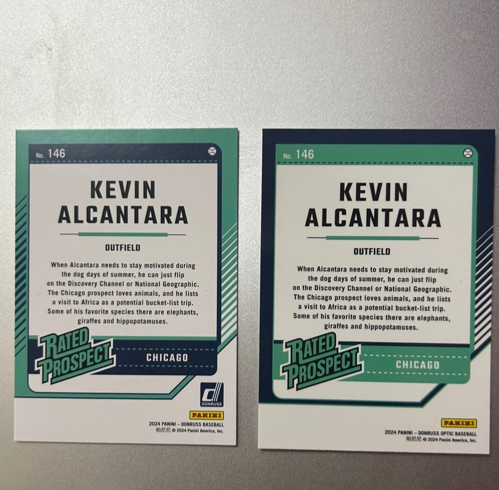 This lot includes (2) 2024 Optic/Donruss Rated Prospect rookie cards of Kevin Alcantara from the Chicago Cubs. Manufactured by Donruss in 2022, these sports trading cards feature a parallel design. The cards are a part of the Major League Baseball (MLB) series for the 2022 season, making them a valuable addition to any baseball card collection.