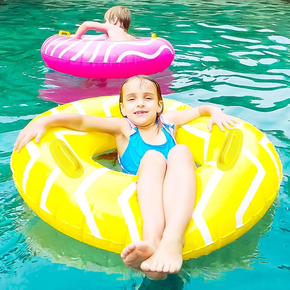 About this item PACKAGE INCLUDING: Comes with a Big Yellow Pool Inner Tube with handle, a Big Pink Pool Tube with handle, and 2 Pcs vinyl pool repair patches included. UNIQUE DESIGN AND PERFECT SIZE: Each swim tube float has an inflated size of about 39 inches, It’s suitable for adults teenage and older kids. Recommended for ages 9 years and older. Nice wave design will make you attractive in the pool. PREMIUM QUALITY: The swim rings are made of strong, non-toxic and thickened PVC material, more sturdy and more durable than any other products in the market, solid enough for the play in summer season. makes you safe when you swim. ENDLESS SUMMER FUN: Our inter tubes for pool with handles are ideal Pool floats for pool as perfect pool and beach parties for children and adults summer fun, summer pool party decorations, swimming pool games, pool toys, floaties, party favors, summer-themed parties, activities, birthday parties. It must create a summer-unique atmosphere to your great holiday.