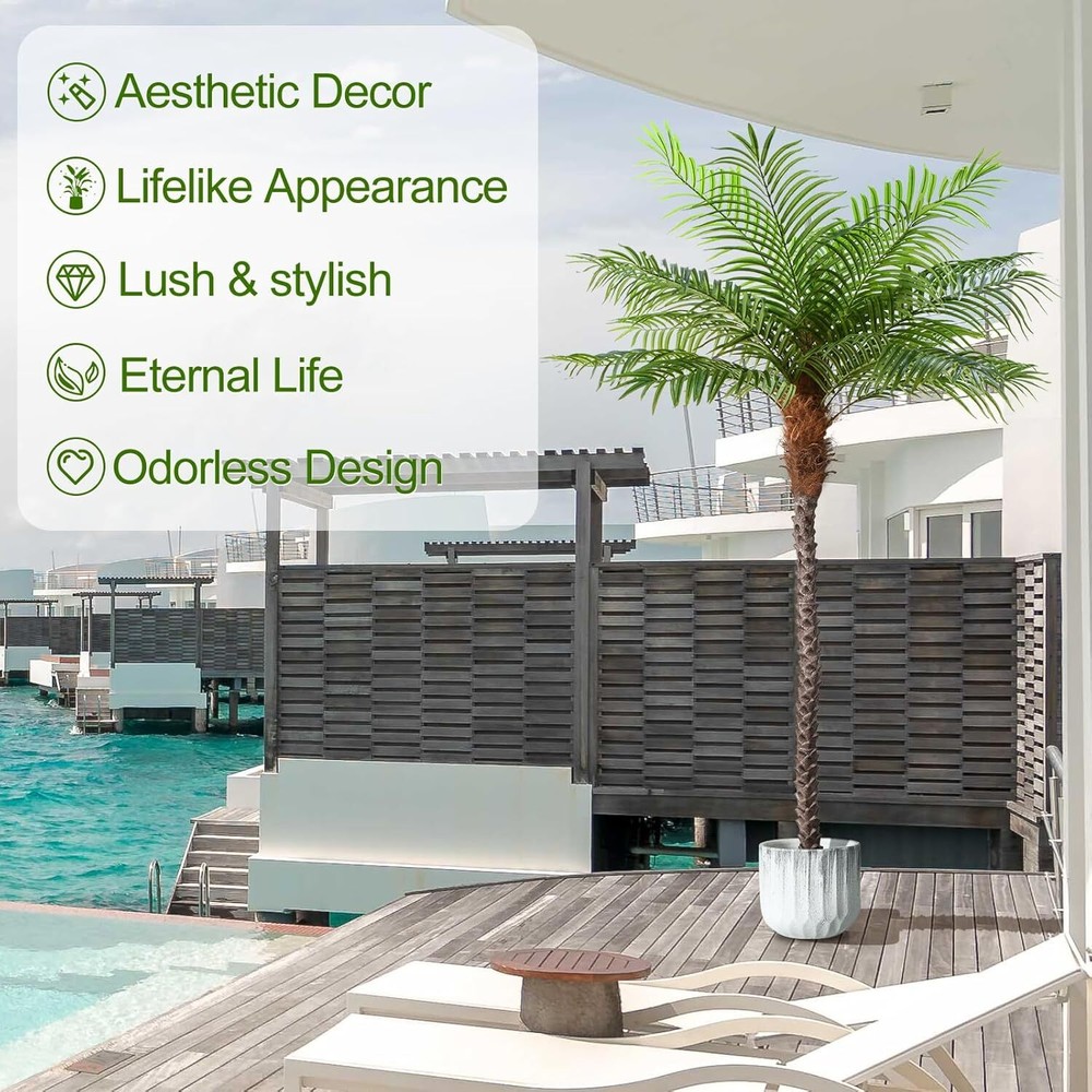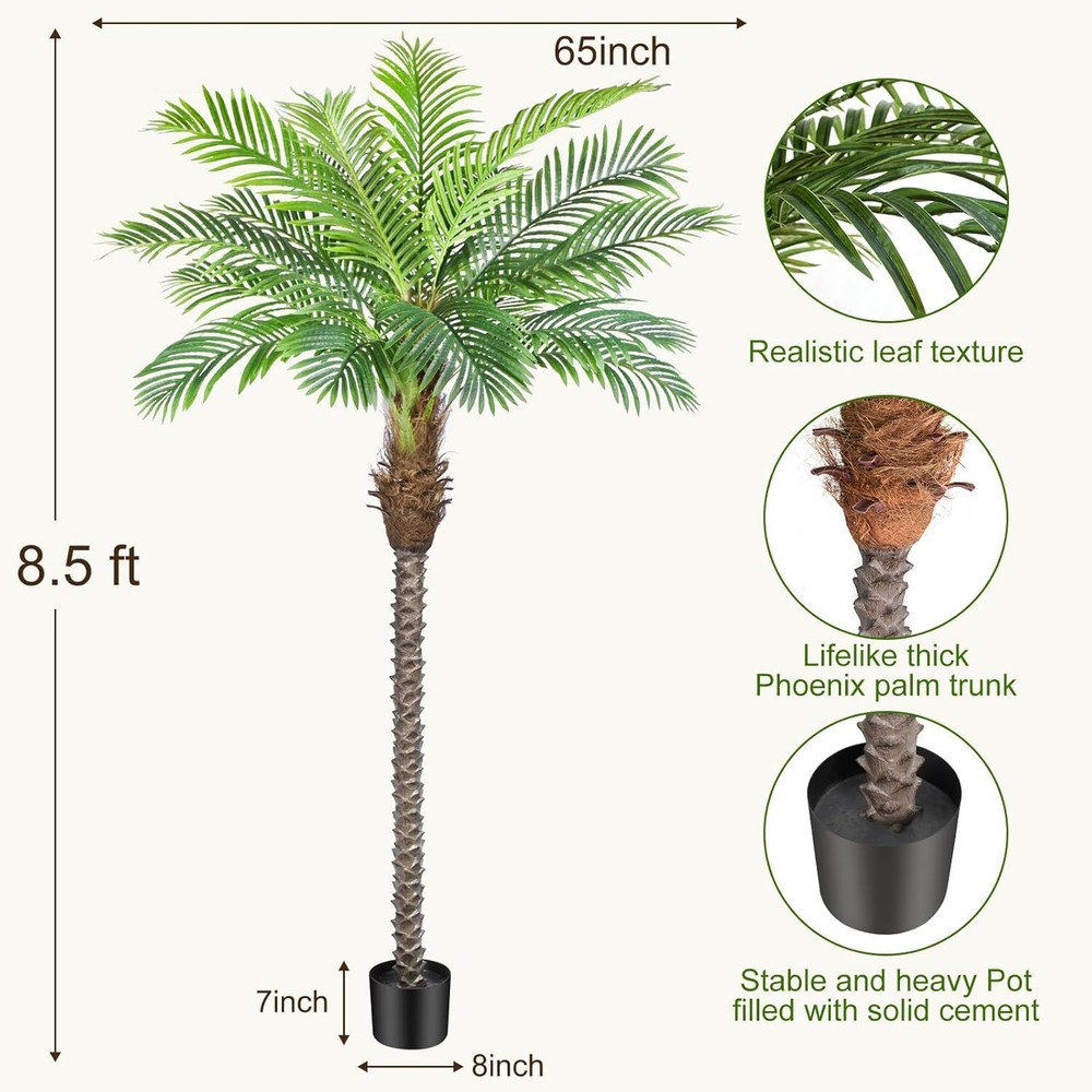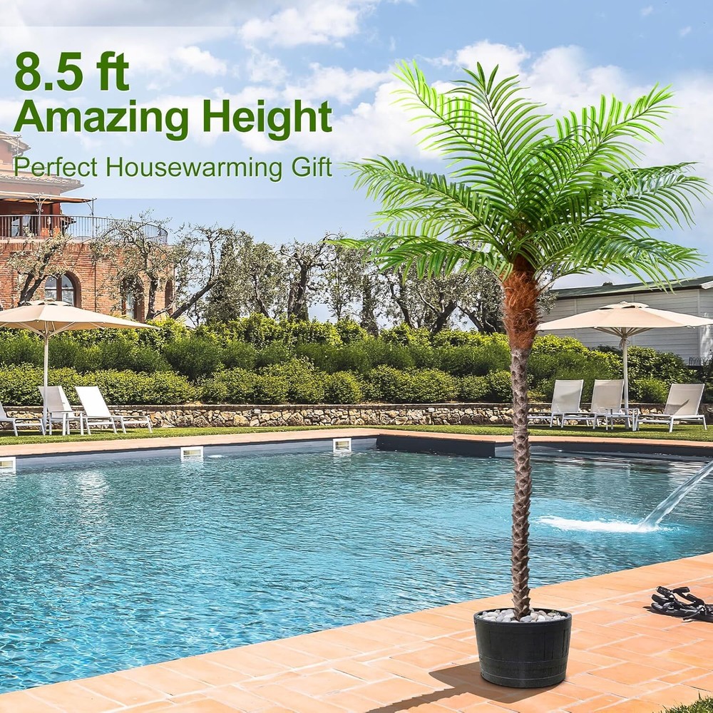 2 Pack, 8.5ft Tall Artificial Phoenix Palm Tree for Outdoors Indoor Decor, Large Faux Coconut Silk Palm Tree Tropical Fake Tree Perfect for Outside Patio Poolside Porch Home Office Decor 🌴This 8.5 feet majestic artificial phoenix palm tree has 18 large vivid palm fronds filled with countless arching feather-like leaves with realistic palm texture, it looks so natural and great, If you are looking for a tropical paradise atmosphere, this is definitely a best choice, your friends, partners and relatives will be in awe, this extra tall palm tree is waiting to dance in the warm tropical breezes 🌴This lifelike large fake palm tree will create a sunny beach summer atmosphere wherever you place it, providing your coastal decor with an authentic look, no need for watering and pruning, looks full and fresh every day, it is the perfect decoration for indoor & outside, big house,office,outsides patio, farmhouse, porch, balcony, entrance, fireplace, doorway, stairway, green garden, yard, dining room, living room, bedroom, modern aesthetic decor, etc 🌴To achieve the intended appearance of natural phoenix palm tree, it need to be assembled and re-shaped when removed from box, all the branches are outfitted with adjustable sturdy metal wires, they are of good quality and strong enough so that you can bend it with confidence, it is nestled inside a 8" non-decorative black plastic pot for versatile appeal, we suggest you tuck it into the bigger and more beautiful planter pot of your choice so it fits right into your ensemble 🌴Overall Product Dimensions: 65"D x 65"W x 102"H; Black Planter Pot Dimensions: 8"D x 8"W x 7"H; Measurements calculated from each furthest outstretched dimension (It depends on how much you bend the palm branches), the black pot is made of heavy solid cement which to prevent children, pets knock it down,its thick and contoured trunk is strong enough to support the hanging of led light strings or decorative pendants, easily create a more welcoming evening atmosphere 🌴To achieve the best look, make sure to buy a good quality faux palm tree that is worth your money. Many different options are realistic and sturdy enough to last for years. Find the best artificial plant that suits your style Measures" 70"D x 70"W x 102"H