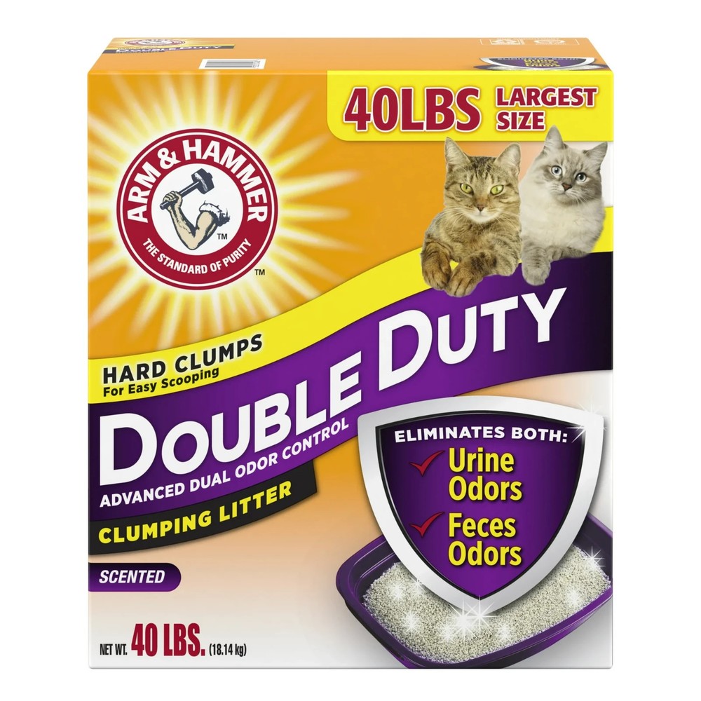 ARM & HAMMER Double Duty Clumping Litter eliminates both types of odors for Advanced Odor Control. Its breakthrough cat litter formula destroys urine and feces odors on contact, and helps keep your home smelling fresh and clean with a fresh scent. ARM & HAMMER cat litter is made with odor absorbing clay and ARM & HAMMER Baking Soda in every scoop to neutralize litter box odor. Rock-solid clumps let you remove the source of odors easily and fresh scent refreshed litter every time your cat uses the kitty litter box. And that’s why an odor-free home starts with ARM & HAMMER clumping cat litter. Plus, with low tracking and 99.9% dust-free formula pour ARM & HAMMER kitty litter from this 40 lb box with confidence. Double Duty Cat Litter destroys urine and feces odors instantly Odor control with powerful moisture activated baking soda crystals, eliminates odors on contact The Double Duty formula is 99.9% dust free and low tracking Kitty litter featuring an easy pour and no-spill spout for less mess Fresh scent refreshes litter every time your cat uses the litter box ARM & HAMMER Double Duty scented clumping litter 40 lb box Features Clumping, Scoopable Scent Scented Animal Type Cat Animal Lifestage All Lifestages Container Type Box Form Crystals Color Gray Brand ARM & HAMMER Count Per Pack 1 Assembled Product Weight 40 lbs Product Line Double Duty Manufacturer Church & Dwight Co., Inc. Manufacturer Part Number 033200024088 Model 033200024088 Size 40 lbs