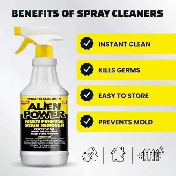 About This Product: Power through tough household and outdoor stains with Alien Power All Purpose Stain Remover Cleaner, a super-concentrated multi-surface cleaner designed for deep cleaning performance. This powerful mold and mildew stain remover activates with water to eliminate stains caused by mold, mildew, algae, soot, nicotine, and water damage. Ideal for both indoor and outdoor cleaning, Alien Power works on tile, grout, vinyl siding, brick, wood, stucco, masonry, and more. The easy just-add-water concentrated powder delivers professional-strength results without harsh scrubbing. Simply mix, spray, and wipe to restore surfaces and remove years of built-up grime. Perfect for bathrooms, patios, fences, siding, RVs, and boats, Alien Power is your go-to all-purpose cleaner for tough stains. Highlights: Super-Concentrated Cleaning Formula - Alien Power delivers professional-grade stain removal when mixed with water, ideal for deep cleaning mold and mildew stains. Removes Tough Stains - Powerful all-purpose stain remover that tackles mold, mildew, algae, soot, nicotine, water stains, and more. Multi-Surface Cleaning Performance - Designed to clean acoustical ceiling tiles, vinyl siding, PVC patio furniture, shower curtains, and other hard surfaces with minimal scrubbing. Easy Spray Application - Simply spray on, let it work, and wipe clean for fast, effective cleaning with less effort. Indoor & Outdoor Use - Safe for use on grout, caulking, boats, RVs, gutters, plaster, stone, brick, and masonry surfaces. Simple Mix-and-Use Maintenance - Just add water to activate the concentrated cleaner; no harsh scrubbing or complicated prep required. Complete Cleaning Kit Included - Box contains two 1 oz. packets of concentrated Alien Power cleaner powder, one 24 oz. plastic spray bottle, and one spray head with dip tube.