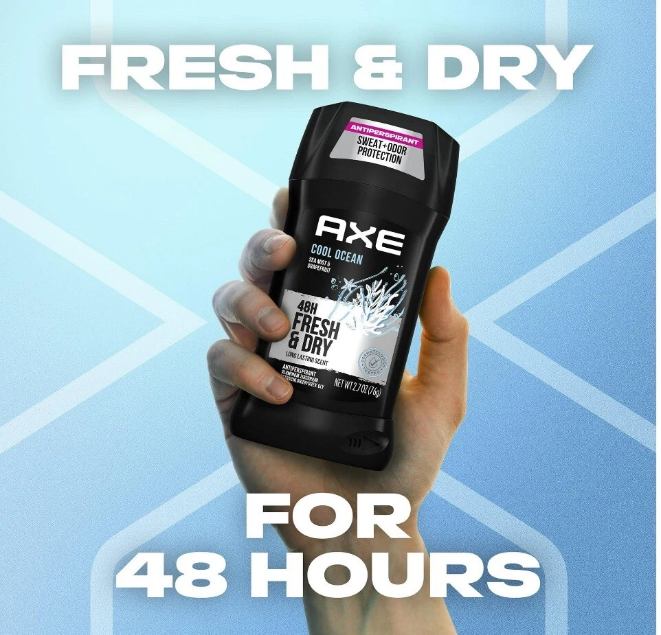 2 Pack Axe Cool Ocean 48H Antiperspirant Deodorant, Sea Mist & Grapefruit, 2.7oz. Axe Cool Ocean Long Lasting Antiperspirant Deodorant Stick, Sea Mist and Grapefruit, Dive into freshness. A scent that feels like endless summer. When opportunity is around every corner, you need a stick deodorant that is going to keep you fresh. With It's 48h High Definition scent and upgraded fragrances, AXE Cool Ocean Deodorant for men has got you covered. An ocean-inspired men's fragrance with light, uplifting essential oils, so you can relax from sunup to sundown. All new AXE Cool Ocean Dual Action Deodorant Stick now features our longest lasting scents ever! Bust odor and smell fresh for 48 hours. Plus. Take care of yourself and the planet. Our video Stick packaging is already made with 66% recycled materials, and by 2025 AXE aims for all our packaging to be recyclable or to include recycled materials. At AXE, we believe that one of the keys to attraction is an irresistible fragrance. We are dedicated to giving you all the tools to ensure that whenever opportunity arises, you smell your absolute best. From our body spray to our shower gels, our Antiperspirants to our deodorants, we are doing everything we can to make sure no one gets left out of the attraction game. All new AXE. The future smells amazing. Smell irresistible all day with all NEW and upgraded AXE Cool Ocean Dual Action Antiperspirant Deodorant for men Anti-sweat, smell fresh with our first Dual Action Antiperspirant for men with enhanced sweat fighters An irresistible smelling Antiperspirant. Let the iconic combo of Cool Ocean scent with Essential oils keep you dry and odor free all day with every swipe Cream deodorant goes on invisible, leaving no white marks or yellow stains Apply AXE Antiperspirant deodorant to clean, dry underarms and feel fresher for longer with every swipe