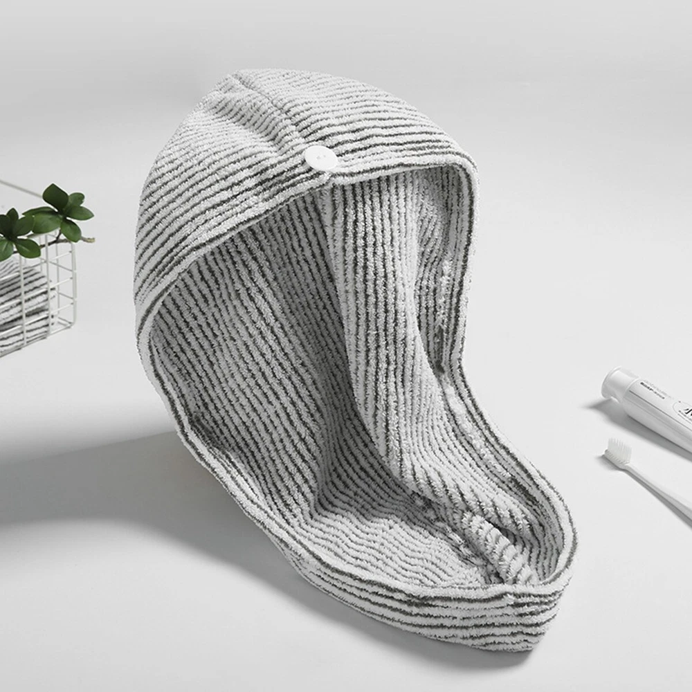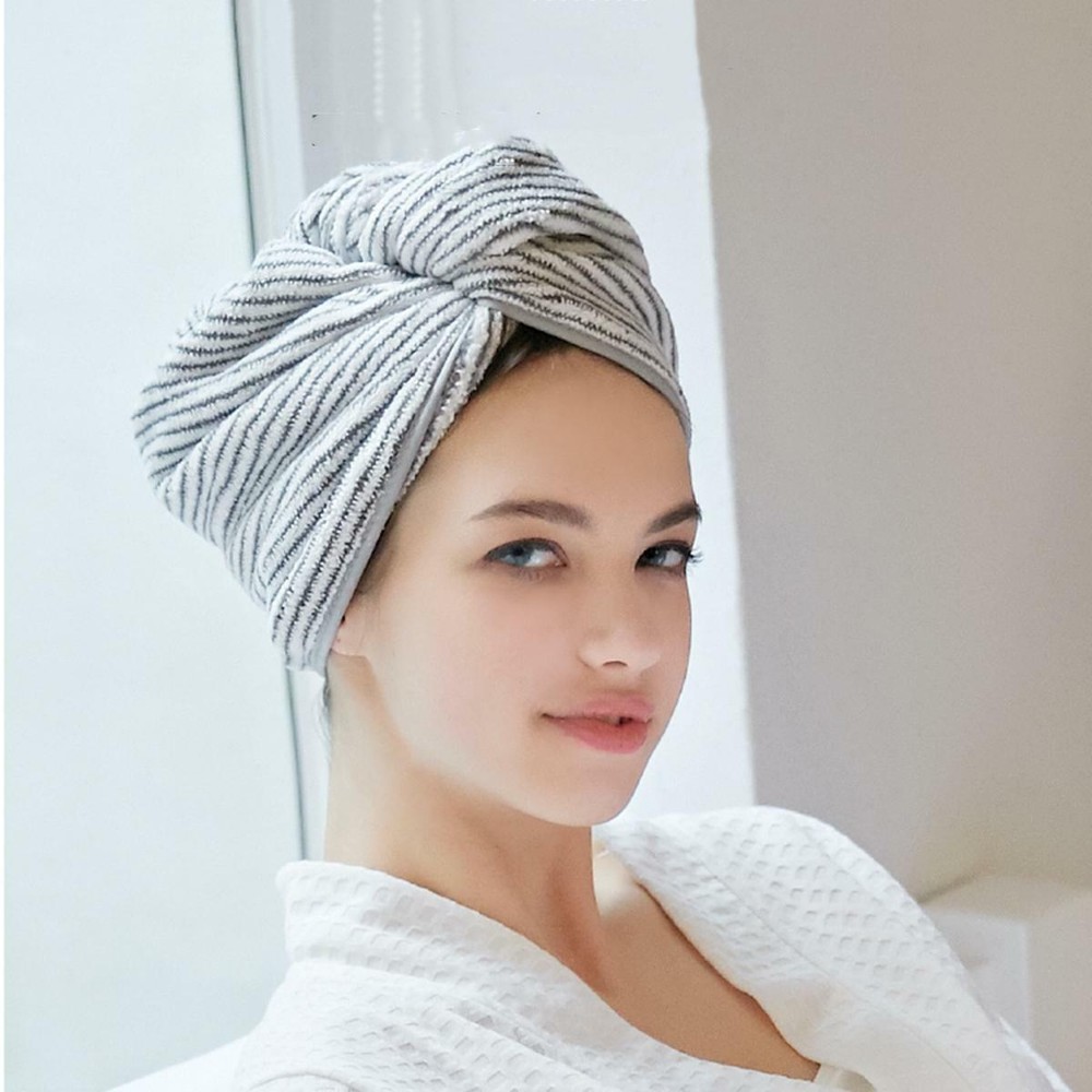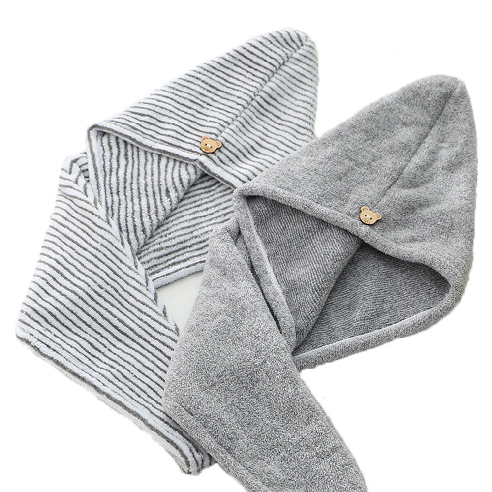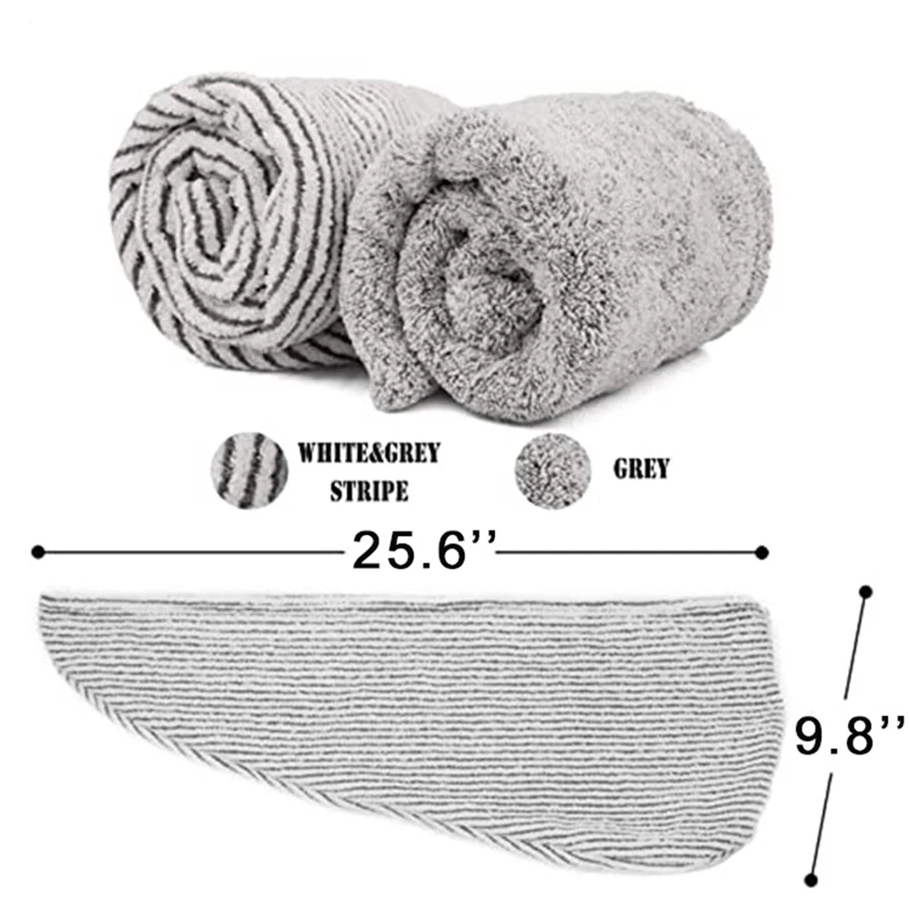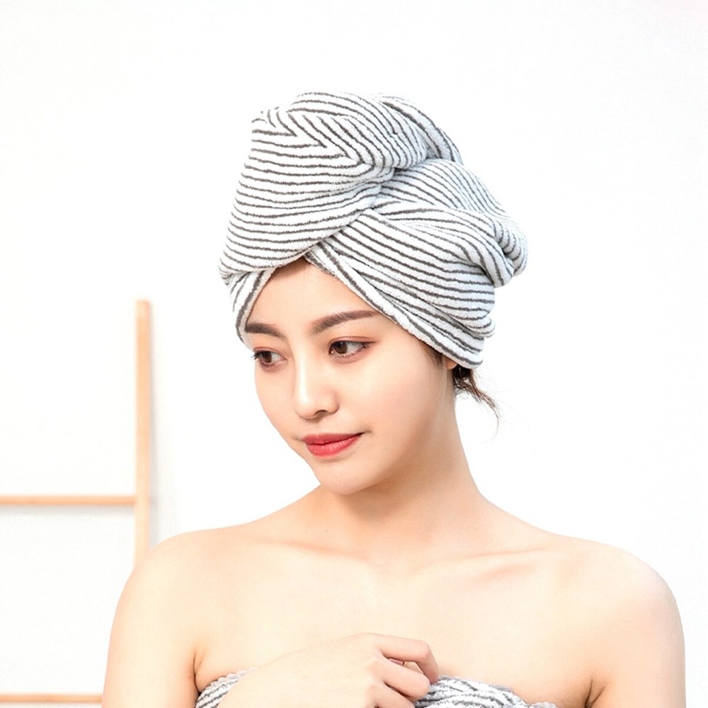 Size: 65×25cm (25.6×9.8 inches) Material: Polyester Fiber + Bamboo Charcoal Fiber Care Instructions: Machine Wash Color: Stripe/Grey Package Included: 1* Hair Drying Cap Features: Made of bamboo charcoal fiber and polyester fiber, it does not contain any substances that may damage delicate hair. For you and your favorite towel, this dry hair towel is a safe, natural and healthy choice. Dries quickly without damaging the hair. Bamboo charcoal nanoparticles are embedded in the fabric instead of simply coating the surface. Dry your hair faster, more thoroughly, and gently. Treat your hair with absorbent, plush and soft towels. Our shampoo not only becomes softer every time you wash, but also is hypoallergenic and environmentally friendly! One size fits all unique designs, suitable for all ages, and is a must for straight curly hair. The cap with a button strap is firmly stitched to ensure that it will not slip off. So easy to use. This towel is perfect for a comfortable bathing time at home, a happy hour at the swimming pool or a nice day at the beach. The hair towel set is very suitable for daily use at home or during travel.