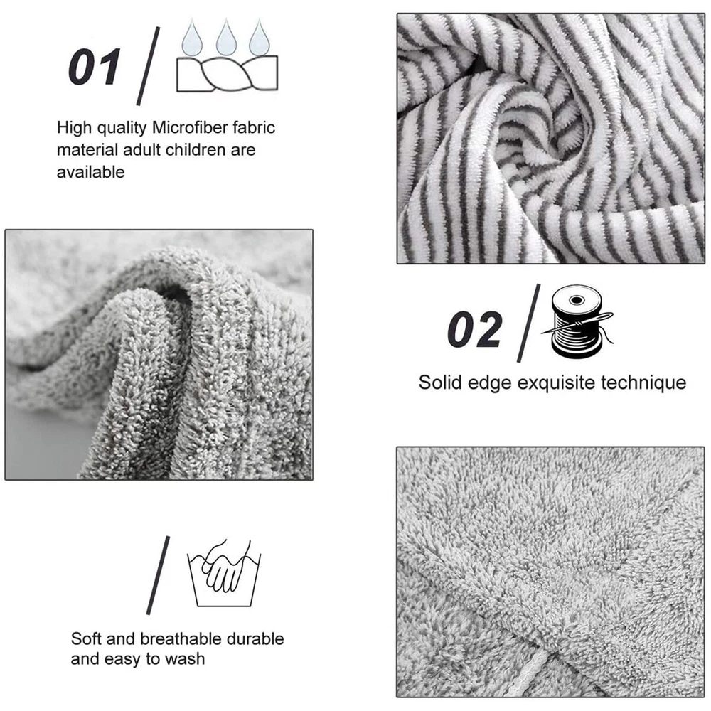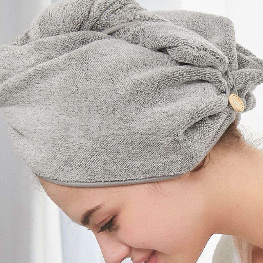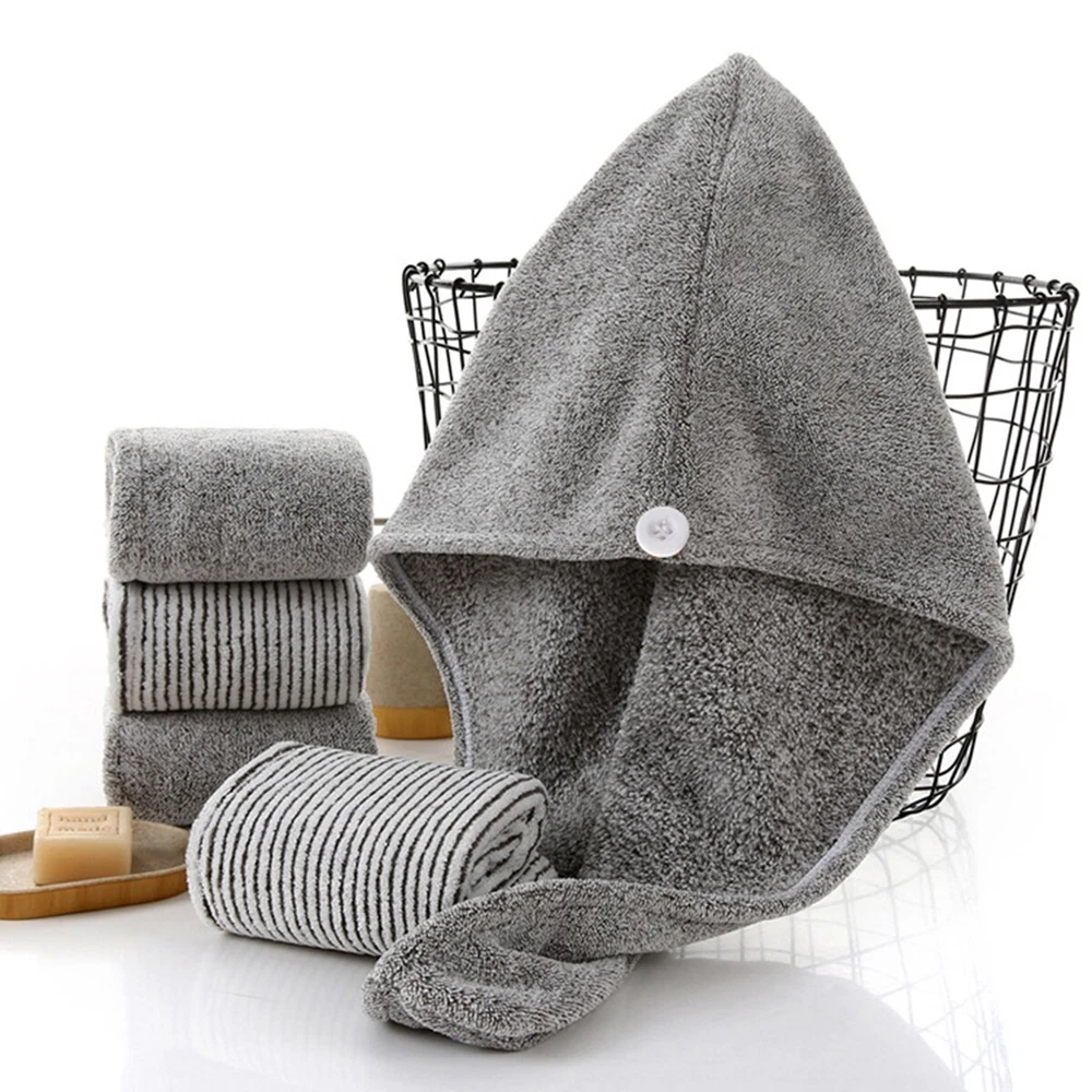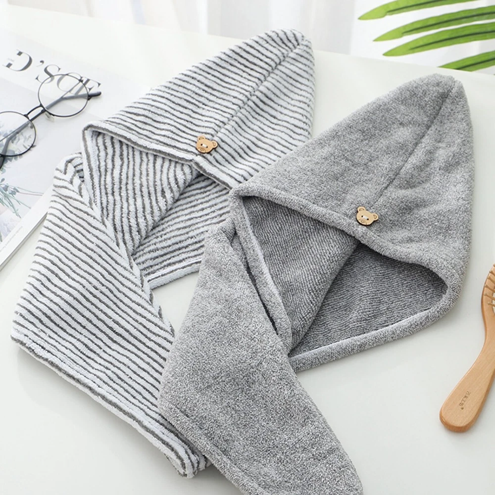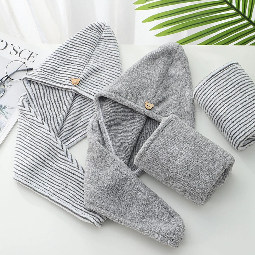 Size: 65×25cm (25.6×9.8 inches) Material: Polyester Fiber + Bamboo Charcoal Fiber Care Instructions: Machine Wash Color: Stripe/Grey Package Included: 1* Hair Drying Cap Features: Made of bamboo charcoal fiber and polyester fiber, it does not contain any substances that may damage delicate hair. For you and your favorite towel, this dry hair towel is a safe, natural and healthy choice. Dries quickly without damaging the hair. Bamboo charcoal nanoparticles are embedded in the fabric instead of simply coating the surface. Dry your hair faster, more thoroughly, and gently. Treat your hair with absorbent, plush and soft towels. Our shampoo not only becomes softer every time you wash, but also is hypoallergenic and environmentally friendly! One size fits all unique designs, suitable for all ages, and is a must for straight curly hair. The cap with a button strap is firmly stitched to ensure that it will not slip off. So easy to use. This towel is perfect for a comfortable bathing time at home, a happy hour at the swimming pool or a nice day at the beach. The hair towel set is very suitable for daily use at home or during travel.