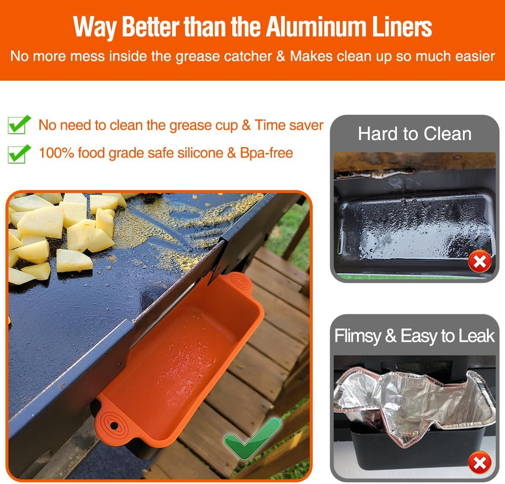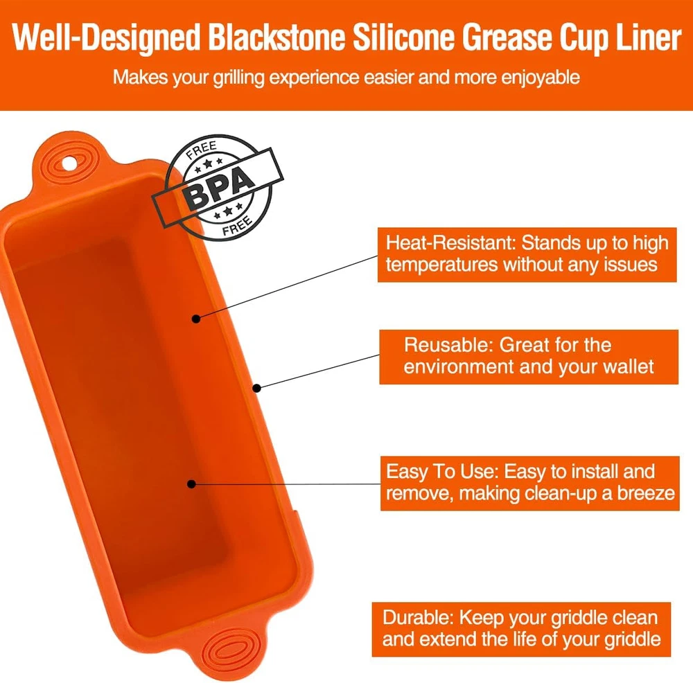 Store New Arrivals Add to Favorite View Feedback Contact 2 Pack Blackstone Silicone Grease Cup Liners for 36 28 22 17 Inch Griddle Description Item Weight 0.23 Kilograms Color Orange Brand AKSDTH Material Silicone Country of Origin China Is Dishwasher Safe Yes Has Nonstick Coating No Shape Rectangular Max Temperature Setting 2.6E+2 Product Dimensions 7"L x 3.3"W x 2.8"Th Manufacturer AKSDTH Must Have Blackstone Griddle Accessories: 2 Pack Silicone Grease Cup Liners for Blackstone Grill. No more scrubbing and scraping the grease and residue from the griddle, makes your cooking/grilling experience easier and more enjoyable. Silicone grease cups measure 7 x 3.3 x 2.8 inches and are designed to fit perfectly on 36/28/22/17 inch Blackstone grills Easy to Clean & Dishwasher Safe: These reusable drip pan liners make cleaning the grill a breeze. Cleaning the liners is incredibly easy too. You can either wash them with ordinary detrgent and water or just wipe with paper towel and throw them in the dishwasher, allowing to quickly remove any grease or residue without any hassle Better than the Aluminum Foil Pans/Liners: Still keep buying disposable aluminum foil pans? Aluminum foil pans are easy to leak, easy to blow away, and the griddle grease catcher will be an absolute mess. Silicone are soft so no worry about accidentally cutting the fingers on the foil pans. No more wasting money on a lot of disposal foil trays. Great value actually saves you money and pays for itself almost immediately Reusable, Durable & Heat-Resistant: The Grill Grease Cup Liners are made of heat-resistant silicone material that can withstand high temperatures and rough outdoor conditions. They are also reusable, which is great for the environment and your wallet. Unlike disposable foil trays, these silicone trays are non-t0xic, non-hazard0us, and can be used over and over again. The silicon pan is also much easier to remove than regular aluminum pans for disposal of grease and cleaning Keep Your Griddle Clean & Extend the Life of Your Griddle: The Grill Grease Cup Liners provide a convenient, efficient, and eco-friendly solution for keeping your grill clean. If you're looking for a reliable and affordable way to make your grilling experience easier, these silicone Blackstone grease cup liners are definitely worth considering Product Description Must Have Blackstone Griddle Accessories Makes your grilling experience easier and more enjoyable with our 2 pack of silicone grease cup liners Better than the Aluminum Foil Drip Pans No need to keep buying disposable aluminum foil pans, better for the environment and your wallet Wide Application Compatible with Blackstone 36 inch griddles, 28 inch griddles, 22 inch griddles, 17 inch griddles Hand Wash Do a quick hand-wash with some liquid soap and a sponge Dishwasher Wipe with paper towel and throw in the top rack of the dishwasher Easy to Use The liners are easy to install and remove, making clean-up a breeze Designed for Blackstone Grease Traps Fits snug in the metal grease traps for narrow hook, long hook, short hook Multi-functional Silicone Cup Liner Keeps your griddle clean & Extends the life of your griddle Shoppers Photo Gallery A reliable and affordable way to make your grilling experience easier ABOUT US We offer the best prices around on high quality products. Our E-store includes media such as books, movies, music and games while offering electronics, toys, sporting apparel, clothing, tools, general home, garden items and more. SHIPPING We are always working hard to ensure your package arrives as soon as possible. Please understand that some factors like weather, high postal traffic, and the performance of shipping companies are outside of our control. We offer free shipping to the lower 48 states and ship within 2 business days of payment, usually sooner. We do not accept P.O. Boxes. Please provide a physical address. RETURNS We offer a 30-Day Return Policy on items which you are not completely satisfied with. You have the option for a full-refund or an exchange of the item. No returns are available on items shipped outside of the USA. PAYMENT We accept PayPal. CONTACT US This page content is yet to come Please ad us to your favorite seller and visit again later Thank You CUSTOMER SATISFACTION We try our very best to make sure every customer is completely satisfied. If there's a problem, message us! We're happy to help.