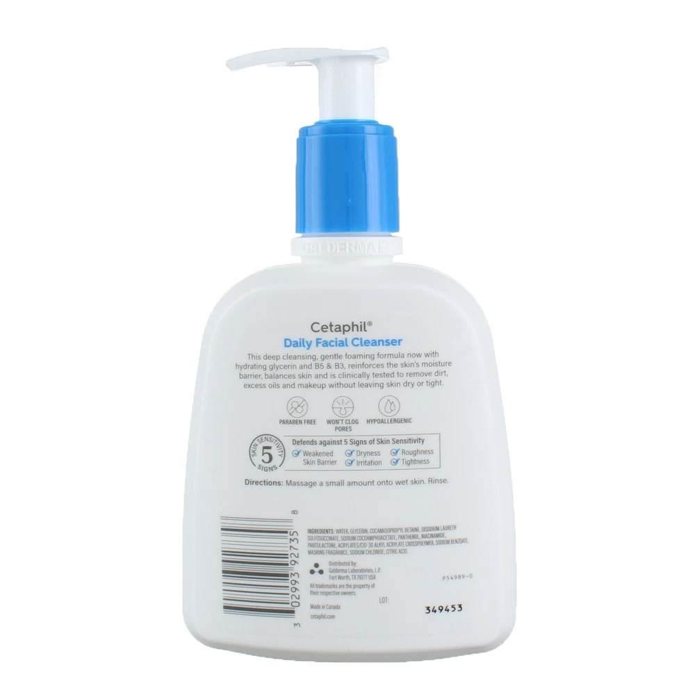 Product Description Step up your skincare regime with CETAPHIL Daily Facial Cleanser, a deep cleansing, gentle foaming formula designed for sensitive, combination skin. Ideal for daily use, this cleanser gently yet effectively removes dirt, excess oils, impurities and pollution microparticles, without leaving the skin dry or tight. Formulated with a new blend of key ingredients: hydrating glycerin, panthenol (vitamin B5) to hydrate, soothe and preserve the skin barrier, and niacinamide (vitamin B3) to help smooth skin’s texture and retain skin’s moisture barrier. CETAPHIL Daily Facial Cleanser minimizes the appearance of pores without stripping the skin of its natural oils and moisture barrier, helping to defend against 5 signs of skin sensitivity. Clinically proven to be suitable for sensitive skin, this gentle cleansing formula is hypoallergenic, non-comedogenic, and free of parabens and sulfate Cetaphil Daily Facial Cleanser, Face Wash for Sensitive skin, 8oz - CETAPHIL DAILY FACIAL CLEANSER: Reinforces the skin barrier, balances skin and minimizes the appearance of pores - IDEAL FOR SENSITIVE, COMBINATION TO OILY SKIN: Clinically proven to deep clean by removing dirt, excess oils, impurities and pollution microparticles - NEW AND IMPROVED INGREDIENT BLEND: Now with hydrating glycerin and skin essential vitamins B5 (panthenol) and B3 (niacinamide) - DEVELOPED FOR EVEN THE MOST SENSITIVE SKIN: The hypoallergenic, non-comedogenic formula is free of parabens and sulfates - DEFENDS AGAINST 5 SIGNS OF SKIN SENSITIVITY: Dryness, irritation, roughness, tightness and a weakened skin barrier Ingredients WATER, GLYCERIN, COCAMIDOPROPYL BETAINE, DISODIUM LAURETH SULFOSUCCINATE, SODIUM COCOAMPHOACETATE, PANTHENOL, NIACINAMIDE, PANTOLACTONE, ACRYLATES/C10-C30 ALKYL ACRYLATE, CROSSPOLYMER, SODIUM BENZOATE, MASKING FRAGRANCE, SODIUM CHLORIDE, CITRIC ACID Product Description Step up your skincare regime with CETAPHIL Daily Facial Cleanser, a deep cleansing, gentle foaming formula designed for sensitive, combination skin. Ideal for daily use, this cleanser gently yet effectively removes dirt, excess oils, impurities and pollution microparticles, without leaving the skin dry or tight. Formulated with a new blend of key ingredients: hydrating glycerin, panthenol (vitamin B5) to hydrate, soothe and preserve the skin barrier, and niacinamide (vitamin B3) to help smooth skin‚Äôs texture and retain skin‚Äôs moisture barrier. CETAPHIL Daily Facial Cleanser minimizes the appearance of pores without stripping the skin of its natural oils and moisture barrier, helping to defend against 5 signs of skin sensitivity. Clinically proven to be suitable for sensitive skin, this gentle cleansing formula is hypoallergenic, non-comedogenic, and free of parabens and sulfate Cetaphil Daily Facial Cleanser, Face Wash for Sensitive skin, 8oz - CETAPHIL DAILY FACIAL CLEANSER: Reinforces the skin barrier, balances skin and minimizes the appearance of pores - IDEAL FOR SENSITIVE, COMBINATION TO OILY SKIN: Clinically proven to deep clean by removing dirt, excess oils, impurities and pollution microparticles - NEW AND IMPROVED INGREDIENT BLEND: Now with hydrating glycerin and skin essential vitamins B5 (panthenol) and B3 (niacinamide) - DEVELOPED FOR EVEN THE MOST SENSITIVE SKIN: The hypoallergenic, non-comedogenic formula is free of parabens and sulfates - DEFENDS AGAINST 5 SIGNS OF SKIN SENSITIVITY: Dryness, irritation, roughness, tightness and a weakened skin barrier Ingredients WATER, GLYCERIN, COCAMIDOPROPYL BETAINE, DISODIUM LAURETH SULFOSUCCINATE, SODIUM COCOAMPHOACETATE, PANTHENOL, NIACINAMIDE, PANTOLACTONE, ACRYLATES/C10-C30 ALKYL ACRYLATE, CROSSPOLYMER, SODIUM BENZOATE, MASKING FRAGRANCE, SODIUM CHLORIDE, CITRIC ACID Suggested Use Massage a small amount onto wet skin. Rinse Disclaimer The product descriptions and instructions provided by vitabox.com are for informational purposes only and are qualified in their entirety by the information available from manufacturers of the products. You should carefully read all product packaging, and contact the manufacturer with any questions before using a product. While we endeavor to ensure that product descriptions are current, manufacturers sometimes change their products. We are not liable for inaccuracies or misstatements about products. We do not provide medical advice or recommendations. You should not use the information provided by vitabox.com for diagnosing or treating a health problem or disease. If you have or suspect that you have a medical problem, immediately contact your health care provider. Information and statements regarding dietary supplements have not been evaluated by the Food and Drug Administration or any other government agency and are not intended to diagnose, treat, cure, or prevent any disease.