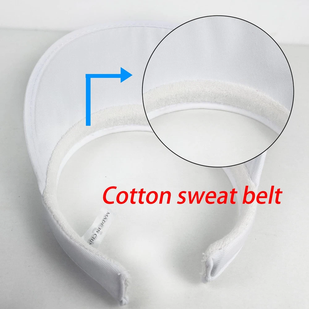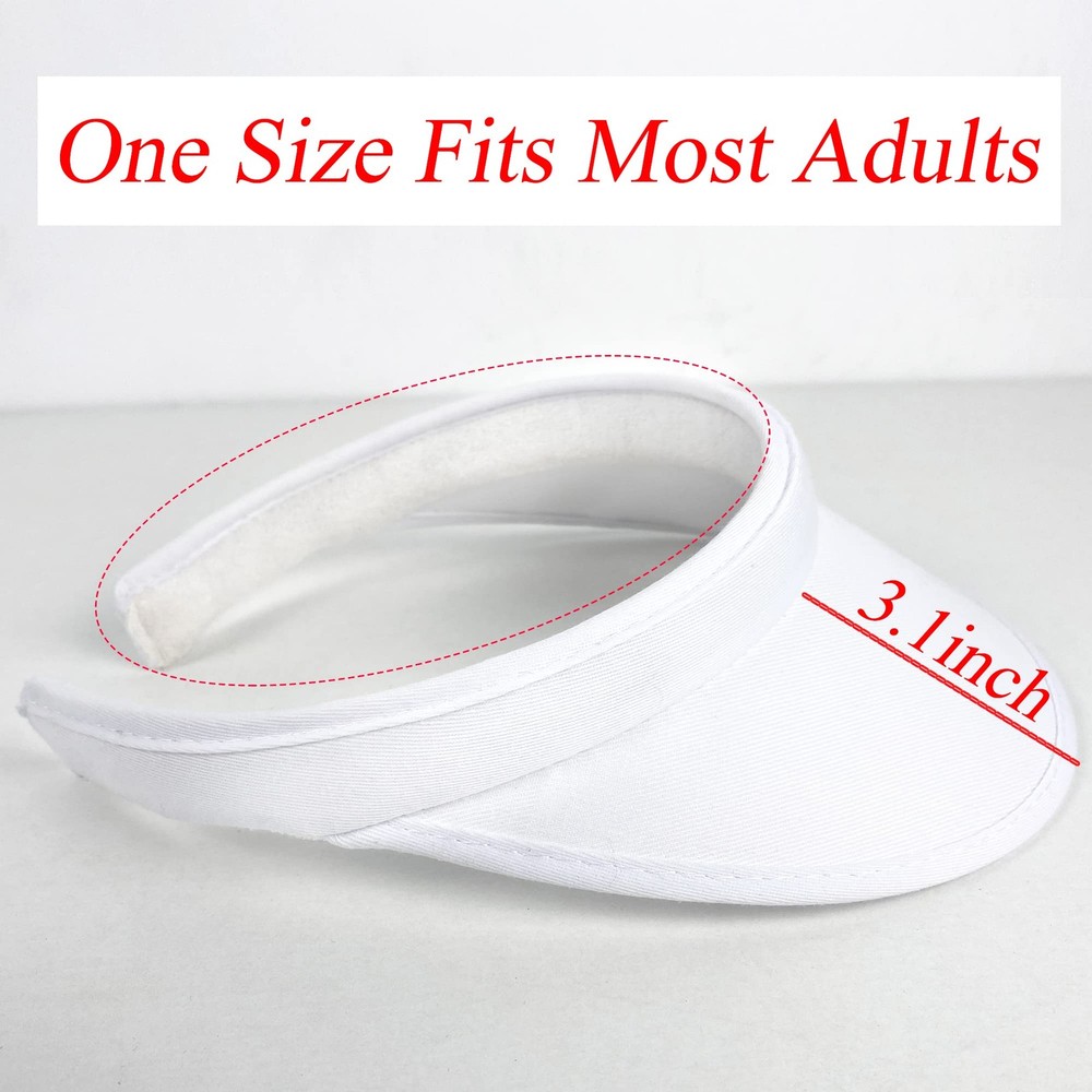 The cotton cdlip on visors hat keep sunlight. sweat and har away from your eyes. The curved diagonal coton sun visor provides thebest sun protection for your face and eyes. One Size Fits Most Head circumference : 21.25-22.83 inch. Wide Brim: 3.1 inch 2 PACK: There are 2 pack clip-on sun visor hats in the package. Multiple Colour:These visor hats for women have balck , white , blue , navy , khaki ,green, maroon, hot pink. These sport visor hats are comfortable, and if you don't want to take time to fix your hair, put one on and go! Wearing Perception:These open back visors for women men are comfortable fit, stylish look, retro appearance, light weight, adjustable design. Classic accessories:Whether you are in the gym, for golf and yard work outdoor activities or leisure and entertainment. Use fashionable sports cotton twill golf sun visor to enjoy and protect yourself on sunny days. Excellent Quality:Keep sunlight, sweat and hair away from your eyes. The curved diagonal cotton golf sun visor provides the best sun protection for your face and eyes.
