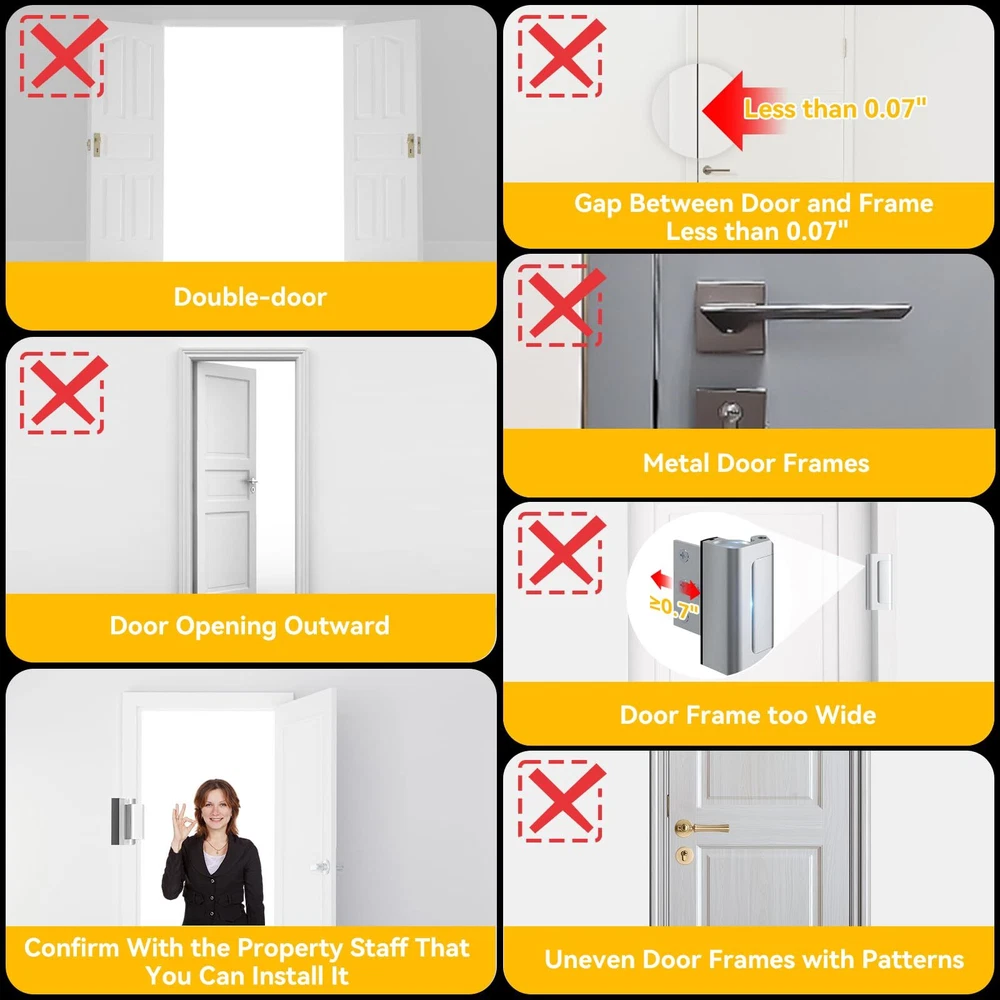Safety Protection Design: Made of all-aluminum alloy, the sturdy door reinforcement lock can withstand 800 lbs of force, fixed with 4 screws. Child locks for door, Equipped with four long and four short screws, a total of 8 screws. A must-have choice for providing extra door security to home safety. Easy to Install: The safety door lock can be installed within 5 minutes with an electric drill and a screwdriver. The family quickly gained a sense of security. The special design allows you to quickly unlock it under any circumstances to avoid accidents. If the frame is too thick, it may not fit your door. Please check the image to see if our product is suitable for your door. Unlock in One Second: Reach out and press the upper and lower grooves of the reinforced door lock and pull horizontally to the fully unlocked state to unlock. Unlocking and locking can be completed within a second with a little contact. The most convenient and fast door security device. Get Rid of Unsafe Neighborhoods: Give your home, your apartment an extra layer of security in unsafe neighborhoods. The safety door lock is stronger than 12 ordinary deadbolts, and it is designed for women living alone, the elderly and families with young people. 5-Year After-Sales Service: is committed to providing security for American families. We provide a 5-year after-sales guarantee for our products. If you have any questions, please feel free to contact us.