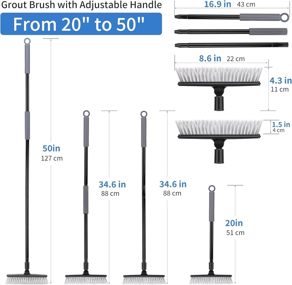 2 Pack Grout Brush with Long Handle 50 Inches Swivel Floor Scrub Broom New Color: Black Handle Material Plastic Specific Uses For Product: Floor Product Dimensions: 17.24"L x 3.85"W x 2.28"H 2 Pcs V-Shape Grout Cleaning Brush: JEHONN V-shape stiff bristles grout scrub brush fits perfectly into grout lines, gaps, corners and window track. Tired of cleaning tough stains in gaps with toothbrush? This brush would be your best cleaning partner 180°Rotating Head: This grout brush for tile floors features with a 180° swivel grout scrubber head, which allows you to scrub away grimes and dirt from different angle with ease. Package comes with 2 packs of tile brush heads, you can replace for use 50 inches Long Handle: JEHONN shower broom includes 3 metal extension poles, can be extended from 20” to 50”. So you can stand upright for comfortable scrubbing instead of bending over to clean. It helps protect your waist and back from pains Multiple Application: This grout brush cleaner with long handle can tackle grimes and stubborn stains on grout, corners, gaps, window track, baseboards from kitchen, bathroom, shower, hallways, deck, patio, walls Bathroom Scrub Brush: JEHONN has committed to cleaning products for more than 10 years. Want to get a sparkingly clean house? Try this grout scrubber brush Return Policy: We offer a 30 day return policy from the receiving date. Please contact us for a Free Return Label. Please use our return label so it will go back to our supplier and we can do a refund or replacement afterwards. Feedback: Your satisfaction is very important to us! If you have any problem with your order, please contact us and we will do our very best to make you satisfied. As long as you are happy with your purchase, please leave a positive feedback for us. We will always leave you a positive feedback in return. If you have any problem with your purchase, please do not leave a negative feedback. Please Contact us ... and your issue will be solved quickly and positively We are a small family-owned business trying to make a living, not a huge company that does not care ... We will ALWAYS do our best for you!