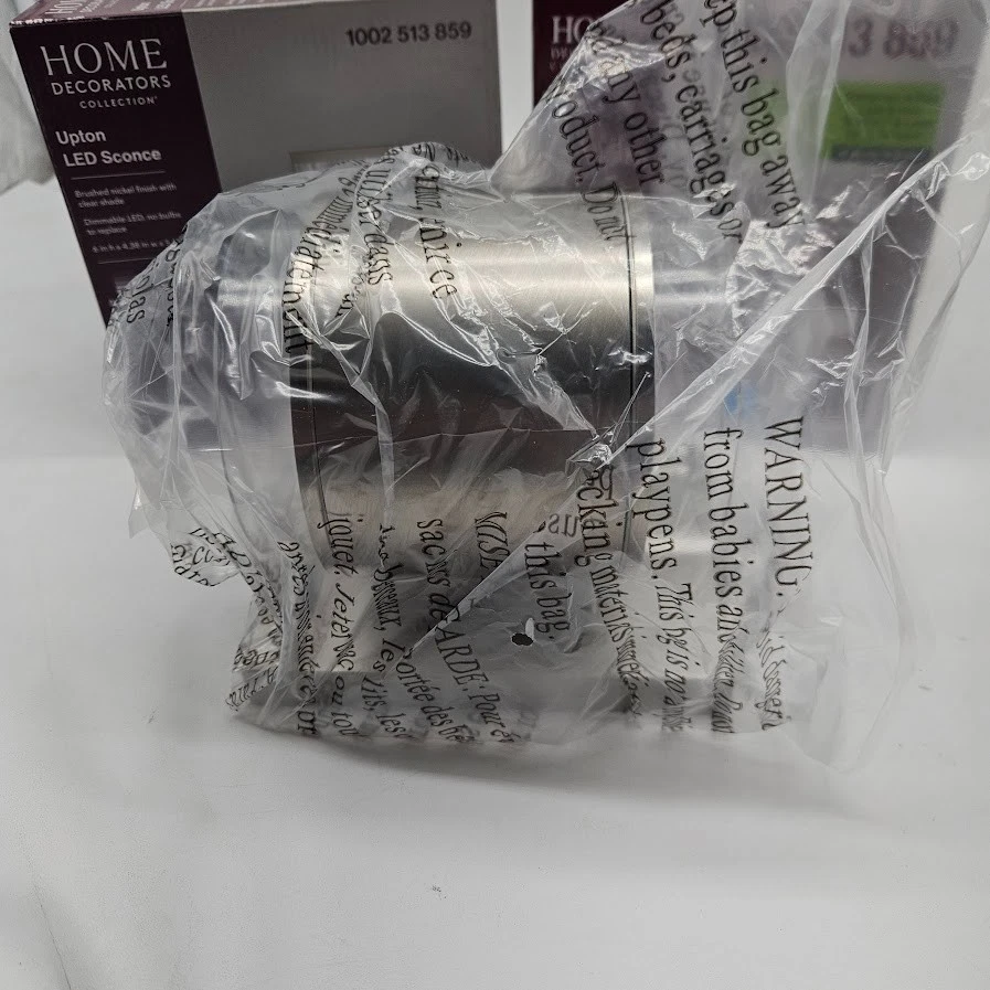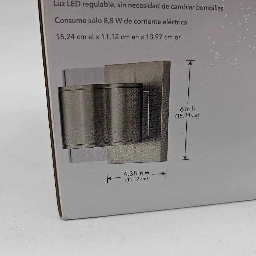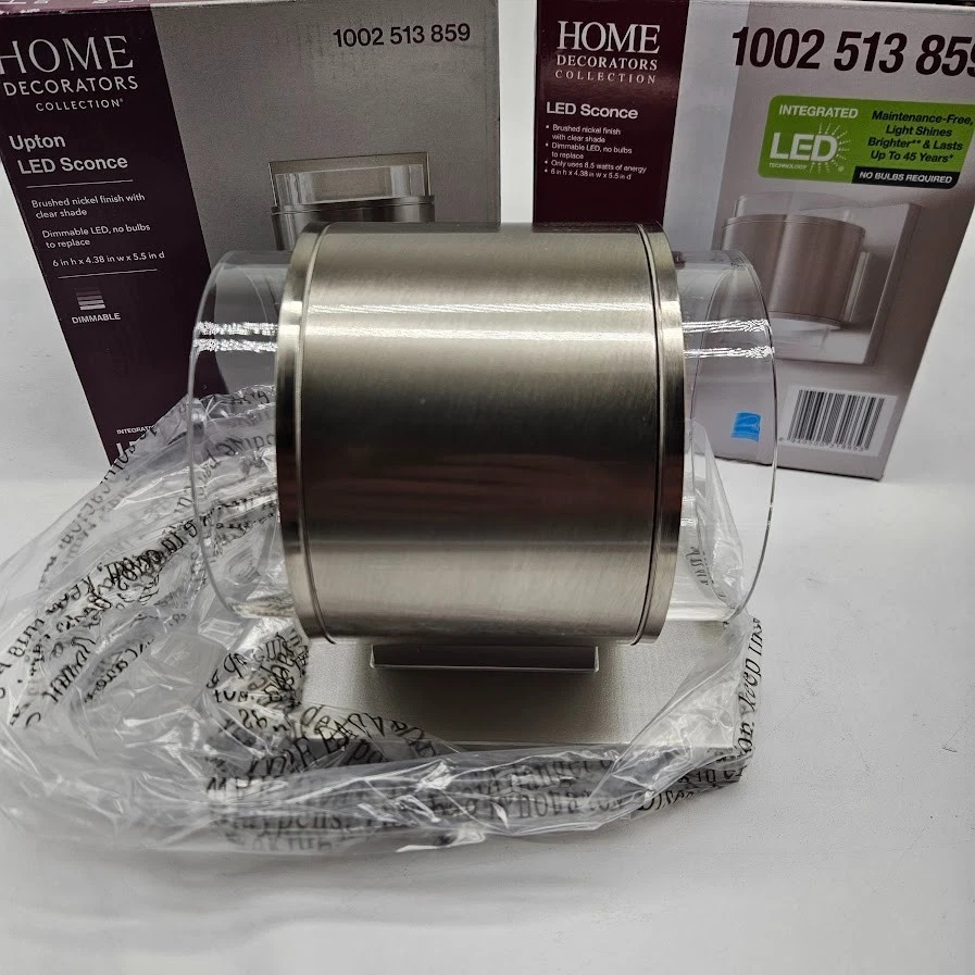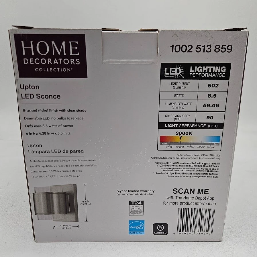Hampton Bay Upton Brushed Nickel Integrated LED Wall Sconce – 3000K Warm White, 502 Lumens About This Product The Hampton Bay Upton LED Wall Sconce features a clean, modern cylinder design finished in brushed nickel for a sleek contemporary look. Designed to illuminate both upward and downward, this bi-directional fixture provides balanced accent lighting that enhances hallways, bedrooms, living areas, and other indoor dry locations. The integrated LED delivers 3000K warm white light with 502 lumens and a 90 CRI rating, offering comfortable illumination and accurate color rendering for everyday use. With no bulbs required, this maintenance-free fixture provides long-lasting efficiency and dependable performance. Built with a clear acrylic shade and ETL-certified components, the Upton sconce ensures safety and stability. It is compatible with dimmer switches for adjustable brightness and includes installation hardware and instructions for straightforward setup. Features & Highlights Bi-Directional Lighting – Illuminates both upward and downward for balanced wall lighting. Integrated LED Technology – No bulbs required; maintenance-free design. 3000K Warm White Light – 502 lumens with 90 CRI for natural, comfortable illumination. Dimmable – Compatible with approved dimmer switches for adjustable brightness. Modern Brushed Nickel Finish – Contemporary style complements various décor themes. Clear Acrylic Shade – Enhances light distribution and visual appeal. Fixture Dimensions – 4.38 in. W x 5.5 in. D x 6 in. H. ETL Certified – Tested for safety and performance. Indoor Dry Location Use Only – Ideal for interior residential spaces. Installation hardware and instructions included for easy setup. We take great care to inspect all items and ensure they are accurately described. Should you have any issues with your purchase, please let us know immediately. We are committed to resolving any concerns promptly and to your satisfaction. Our small business truly appreciates your patronage. Hampton Bay Upton LED wall sconce brushed nickel cylinder light 3000K warm white 502 lumens 90 CRI dimmable indoor wall lighting bi directional up down light modern contemporary wall fixture