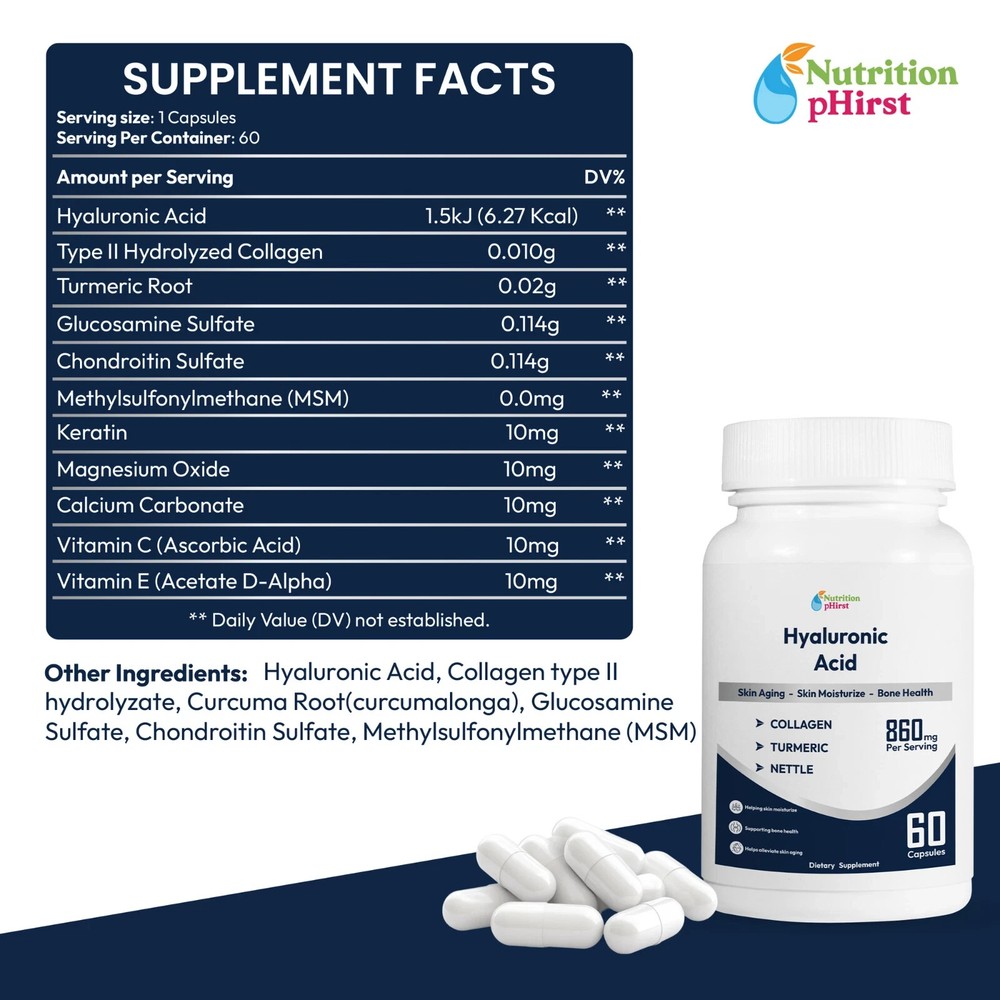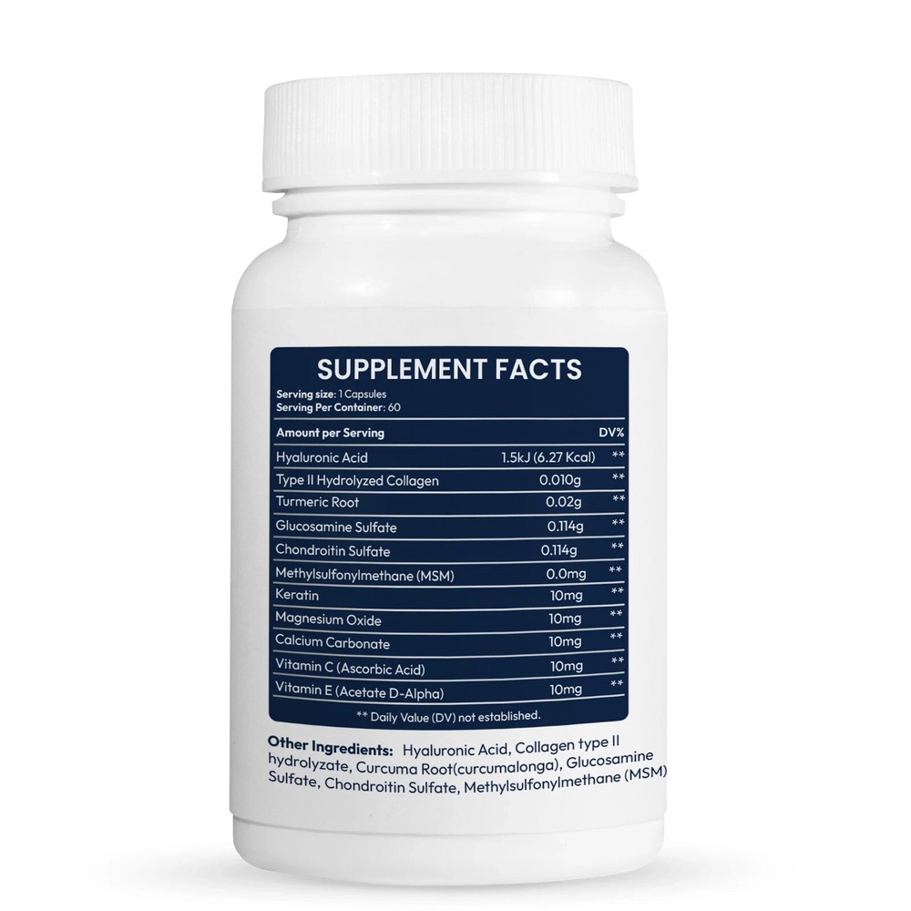 Achieve Radiant Skin & Pain-Free Joints! Transform your wellness journey with our premium supplement, expertly formulated with Hyaluronic Acid, Turmeric Extract, and Hydrolyzed Collagen Type II. This unique blend provides superior support for joint mobility, skin hydration, and overall vitality. Features 🦴 Joint Support: Promotes cartilage regeneration and reduces joint discomfort. πŸ’§ Skin Hydration: Enhances skin elasticity and firmness. 🌿 Natural Formula: Vegan-friendly and gluten-free ingredients. βœ… High Potency: 1700mg per serving for maximum effectiveness. 🏭 Quality Assured: Made in a cGMP-certified facility. Key Benefits Alleviates joint pain in knees, elbows, ankles, and hands Enhances skin elasticity and hydration for a youthful appearance Supports recovery and flexibility for an active lifestyle Product Facts Ingredients: Hyaluronic Acid (120mg) Turmeric Extract (120mg) Hydrolyzed Collagen Type II (120mg) Bottle Content: 60 capsules Expiration Date: 16/2027 Free From: Gluten, GMOs, animal products Shipping & Returns πŸš€ Fast Shipping: Dispatches same or next business day with tracking provided. πŸ”„ Hassle-Free Returns: 30-day money-back guarantee with free returns. Why Choose Us? 🌟 Trusted seller with top-rated feedback 🏷️ Competitive pricing for premium supplements 🀝 Dedicated customer service and satisfaction guarantee Statements are not FDA evaluated. Consult your healthcare provider before use. Follow recommended dosage for safe results.