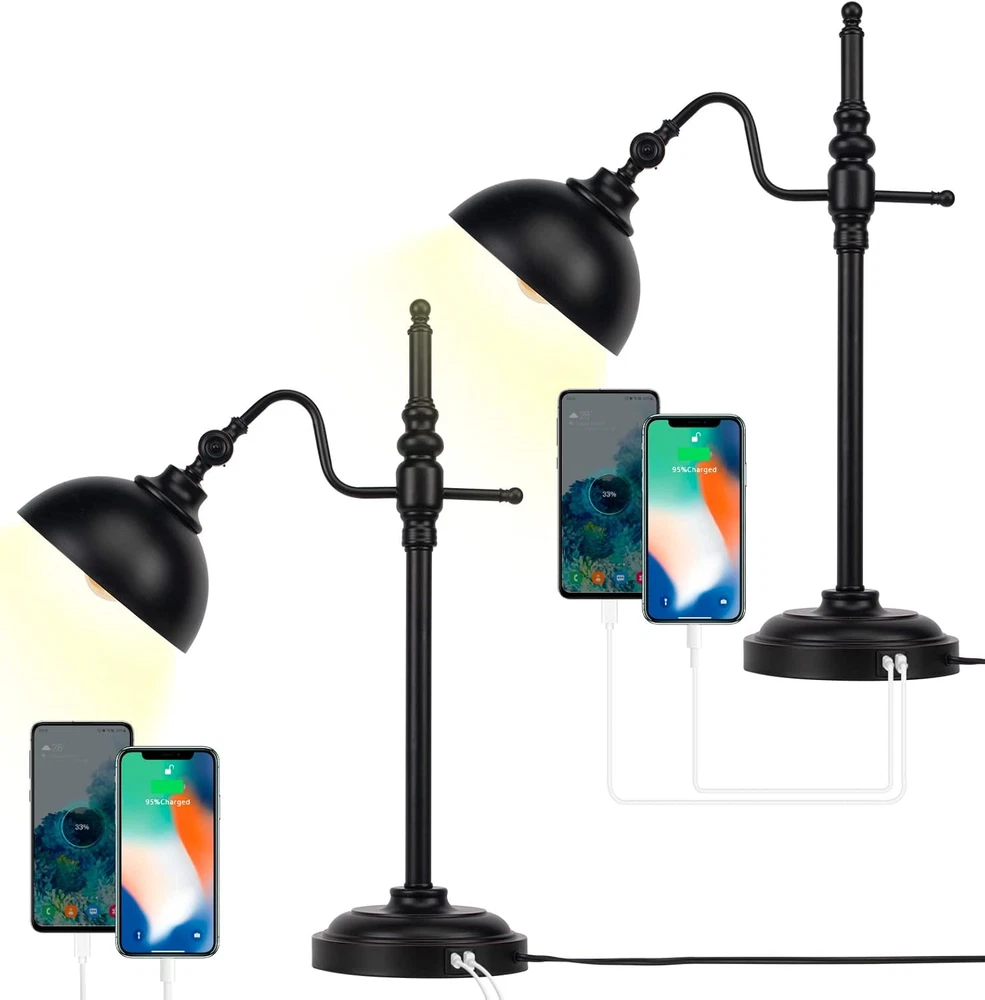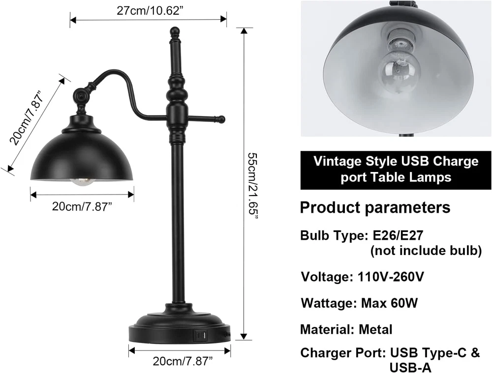Store New Arrivals Add to Favorite View Feedback Contact 2 Pack Industrial Desk Lamp with 2 USB Charging Port Black Metal Rustic Table Lamp for Reading with Adjustable Head Vintage Task Lamp for Office Living Room Dorm Farmhouse Description Item model number 001 Light Source Type LED Style Vintage Number of Items 1 Power Source Corded Electric Number of Light Sources 2 Country of Origin China Is Electric Yes Batteries Included? No Lighting Method Adjustable Maximum Compatible Wattage 60 Watts Room Type Bedroom, Living Room Lamp Type LED Bulb Shape Size B10 Product Dimensions 17.32"D x 9.84"W x 17.32"H Material Metal Installation Type Tabletop Finish Type Painted Specific Uses For Product Decoration Indoor/Outdoor Usage Indoor Bulb Base E26 Water Resistance Level Not Water Resistant Batteries Required? No Item Weight 11 Pounds Connectivity Technology USB Connectivity Protocol Usb Special Features Corded Special Feature Corded Part Number 001 Shade Color Black Mounting Type Tabletop Color Black-2 Is Cordless? No Base Material E26 Is Waterproof False Shape Bulb Recommended Uses For Product Decoration Shade Material Metal Finish types Painted Included Components Shade Switch Type Push Button 💡Farmhouse Modern Meets Industrial: combines modern minimalism with a rustic and retro appeal to create unique industrial desk lamps. The classic minimalist all-metal design with attractive warm light is perfect for your retro or modern home style. 💡270° Rotatable Lampshade:The black metal lampshade can give off beautiful and soft light after the lamp is turned on. The lampshade can be rotated in a wide range, which provides multi-directional lighting. And the metal material is easier to clean when it is dirty. 💡2 USB port:The USB Type-C port and USB-A port of this black desk lamp can charge your mobile phone and other small electronic devices. It has a good charging function. Allows you to conveniently use the desk lamp while charging. 💡Lamp Sockets:Equipped with 2 standard E26 sockets. Compatible types: Incandescent, Edison, Halogen, Dimmable LED bulb (bulb not included). All switches, sockets and cables have passed UL safety testing and certification. 💡Durable Metal Construction: The vintage desk lamp is made entirely of iron, with a retro classic design that is elegant and sturdy. No matter where it is placed, it will be one of the most attractive decorations in your home. Product Description Product Decrisption Colour: Black Material: Metal Style: Vintage / Retro / Industrial / Farmhouse / Modern Voltage: 100-110V Maximum power: max. 60 Watt Dimming function: not dimmable All sockets and cables have passed UL and are absolutely safe. Package Detail packing box:1 X Desk Lamp ( Bulb isn't included) Packing Dimension:10.62 x 7.875 x 21.655in Packing Type:Mail Order package E26 Bulb Base With an E26 bulb base, Max 60 watts .Bulb is Not included.The retro metal table lamp is compatible with a variety of incandescent, halogen bulbs, LED or CFL light bulb.You can customize the lighting of the lamp based on the color light bulb you choose. Rotary Switch Button Easy on/off Clockwise rotation 2 USB ports USB Type-C connector and USB-A connector Easy to charge when using the desk lamp Adjustable Lamp Shade 1 metal lampshade 360° lighting Sturdy Metal Base Sturdy heavy metal base With cable and plug Perfect Match with Different Styles Working Desk ABOUT US We offer the best prices around on high quality products. Our E-store includes media such as books, movies, music and games while offering electronics, toys, sporting apparel, clothing, tools, general home, garden items and more. SHIPPING We are always working hard to ensure your package arrives as soon as possible. Please understand that some factors like weather, high postal traffic, and the performance of shipping companies are outside of our control. We offer free shipping to the lower 48 states and ship within 2 business days of payment, usually sooner. We do not accept P.O. Boxes. Please provide a physical address. For shipping outside of the continental USA, we only use eBay's Global Shipping Program.The item is shipped to KY and then sent to the rest of the world. International customers are responsible for all duties and taxes. Continue to check out in order to calculate costs for shipping the item to your country. Messages regarding eBay's Global Shipping Program MUST be directed at eBay EXCLUSIVELY. RETURNS We offer a 30-Day Return Policy on items which you are not completely satisfied with. You have the option for a full-refund or an exchange of the item. No returns are available on items shipped outside of the USA. PAYMENT We accept PayPal. CONTACT US This page content is yet to come Please ad us to your favorite seller and visit again later Thank You CUSTOMER SATISFACTION We try our very best to make sure every customer is completely satisfied. If there's a problem, message us! We're happy to help. WE ACCEPT Copyright © 2021 AutoDS. | All Rights Reserved