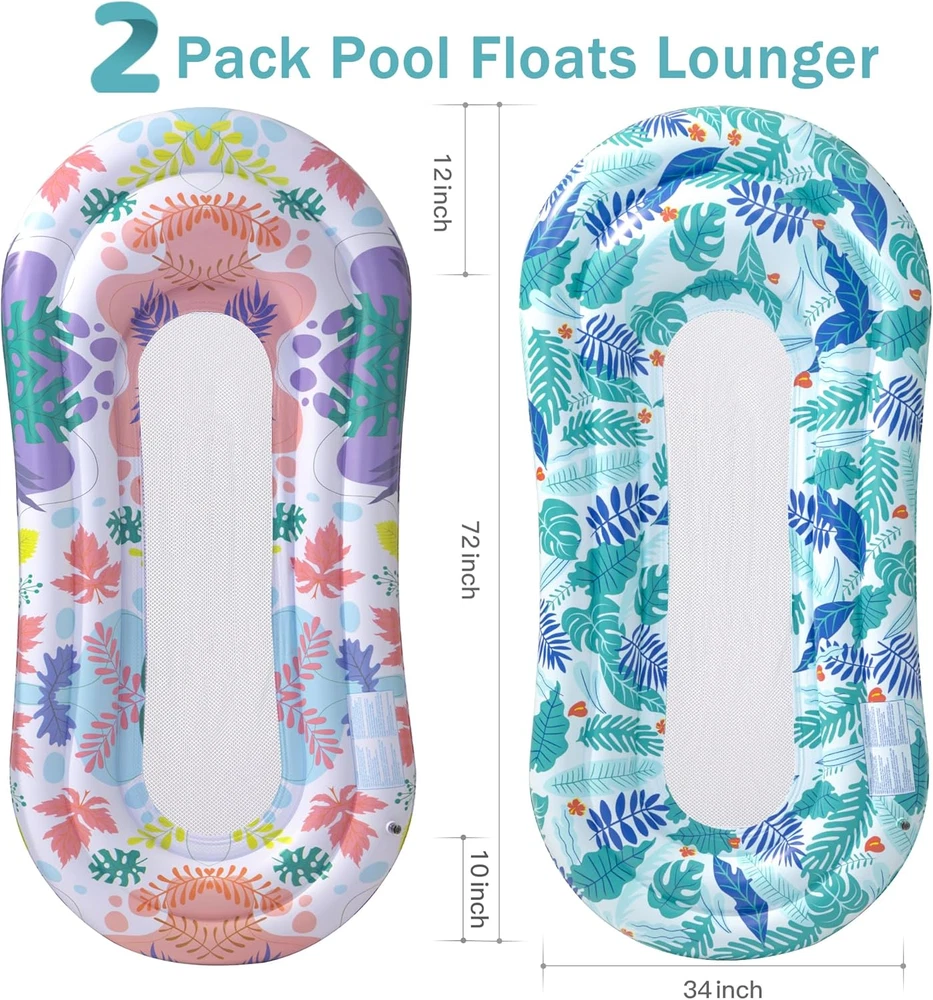Pool Floats Lounger, 2 Pack Inflatable Pool Floats Adult Size, Water Hammock Pool Rafts Floaties for Swimming Pool Tanning Floating Pool Party Toys for Summertime Beach Outdoor - Multicolor Unique Pool Floats: This ultra-comfortable pool lounger has a special cooling mesh center, which can support you in the water to keep you cooler; Perfect inflatable pool rafts and floats for outdoor swimming pool party, beach, lake, river and more Pool Floats with Headrest & Footrest: With supportive headrest and footrest, the pool rafts offer a lot of support and an abundance of comfort; The mesh bottom surface is comfortable and breathable, not stick to the skin; Enjoy a relaxation and cooling for hours in hot season Keep Cool & High Stability: Inflatable pool lounge allows you to relax semi-submerged, helps you stay cool by getting in close contact with water; Balance design water hammock floaties, with 2 air chambers outer tube and soft inner mesh; Easy to get on and off, stable and not easy to tip over in water 2 Pack Fantastic & Versatile Floats: Water hammock pool float, pool raft, sun tanning float all in one pool lounger; The inflatable pool float mat meets all your needs; With a maximum weight capacity of 265 lbs, the lengthened and widen pool lounges are suitable for adults; Ideal for party travel vacation or birthday gift for lover, family, friends Prime Quality & Compact Size: Our swimming pool floats are made of thick, premium vinyl and soft mesh fabric, superior support force and better quality give you a good summertime; Compact size after deflated, dry fast and easily carried; Take it on your summertime trip Product Description The video showcases the product in use. The video guides you through product setup. The video compares multiple products. The video shows the product being unpacked. 2 Pack Pool Floats Lounger for Summertime Merchant Video Made from lightweight and durable performance fabric, the inflatable pool lounger is built to withstand sun and mildew while also being soft on the skin. The perfect summery gift of pool floats for adult looking to make a splash in the swimming pool, lake, river, water park, ocean or beach Item model number STPF-006 Color Multicolor Product Dimensions 72"L x 34"W Material Vinyl Country of Origin China Weight Limit 265 Pounds Item Weight 1.96 pounds Age Range (Description) Adult Department unisex-adult Item Form Hammock-shaped Size Large 11.77 inches x 12.48 inches x 1.65 inches. Weight: 1.96 lb Shipping from the USA All of our products are shipped from the USA, ensuring quick delivery to your destination. Payment We offer the following payment methods: PayPal, credit card, bank transfer, and eBay's secure payment system. Free Shipping & Free Returns Shipping within the USA is FREE. Additionally, any return is absolutely free for you. Risk-Free Purchase You have the option to return an item within 30 days without any justification. We cover the return shipping costs! Fast Shipping We ship immediately upon receipt of payment. Generally, the package is delivered within 2-3 days in the USA. If it takes longer, we will contact you. Quality and Costs Made in Europe, USA, China No customs fees or additional charges Total satisfaction guarantee Invoice with declared VAT available upon request in .pdf format Feedback Your feedback is very important to us. After you pay for your purchase, you will automatically receive positive feedback from us.
