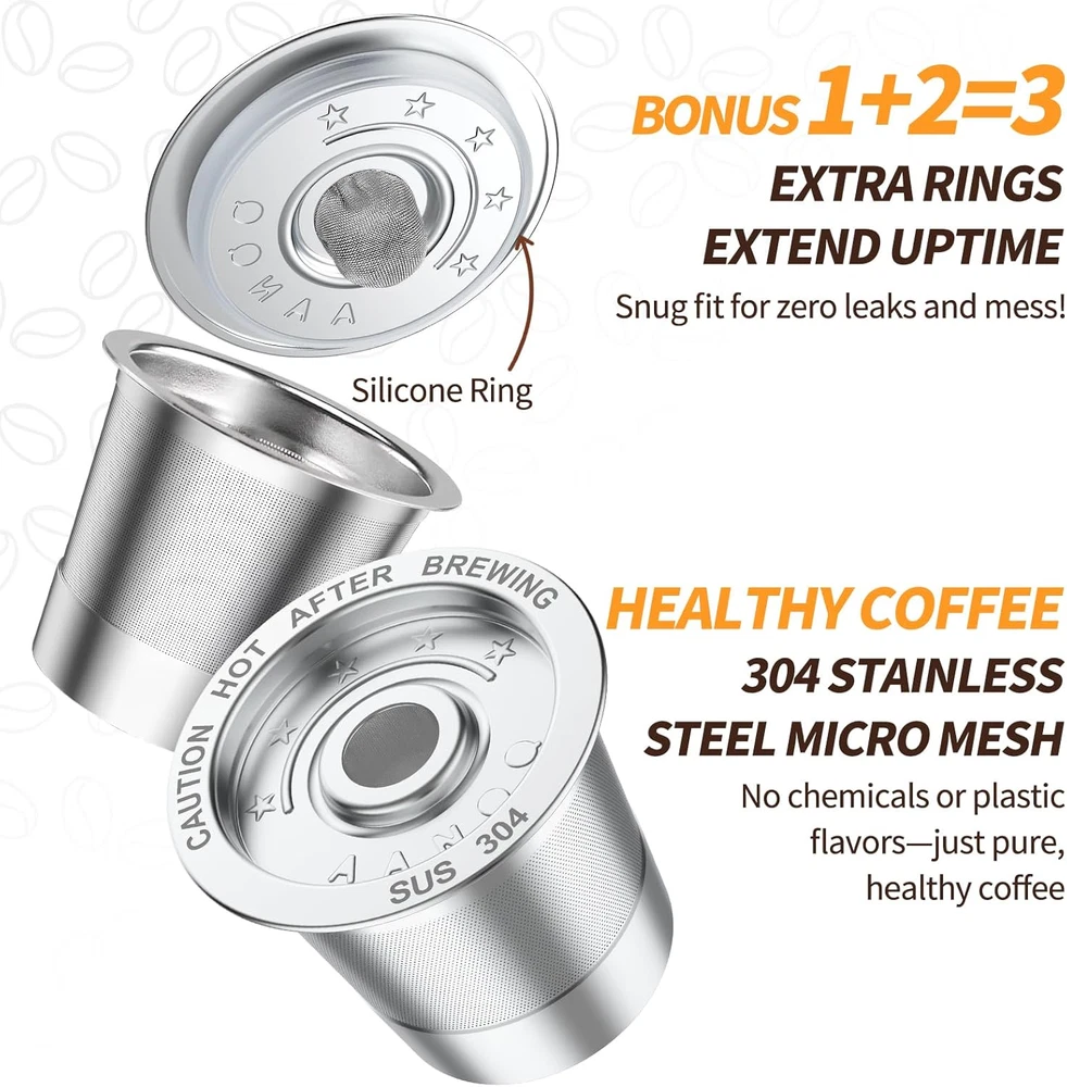 🌟Universal Compatibility for Keurig 1.0 Maker: Our k cup reusable coffee pods fit perfectly with Keurig 1.0 coffee machines: B40/K40/K45, B44/B50/B60, B66/B70/K75, B77/B79/B100, B135/B140/B145, K145/B150/K150, B155/K155/B200, B1250/B1255/B3000, K1500. Also work with Keurig K-Mini, K-Express, K-Classic, K-Elite, K-Latte, K-Cafe, K-Select, K-Compact, and Breville, Mr. Coffee k cup ⚠️⚠️⚠️Please note, NOT work with: Keurig 2.0❎ coffee maker and multistream machine,such as Keurig K-Duo Gen 2❎, K-Supreme/Plus/Smart and K-Slim❎ 🌟Precision Micro Mesh for Rich Brews: Featuring a high-density micro-mesh, our stainless steel reusable k cups for keurig control water flow precisely, ensuring even saturation of coffee grounds to unlock rich oils and aromas. The silicone seal on top of coffee capsules prevents leaks and residue, delivering a smooth, full-bodied cup every time for an unmatched coffee experience. Bonus: Extra 3 Silicone Seals for Extended Use 🌟Durable and Safe Design: We partner with top factories for outstanding quality! Our metal reusable k cup are made from food-grade, heat-resistant materials, ensuring no harmful chemicals leach into your coffee. Unlike plastic k cups (contain BPA, Lead, and DEHP), they won’t alter flavor and can be reused for tens of thousands of brews. Enjoy unique coffee blends that pre-made K-cups can’t offer 🌟Minimal cost, Sustainable Choice: Ditch costly disposable k cups and low-quality plastics coffee pods! Our durable reusable coffee filters coffee keurig accessories can be reused over 10,000 times, saving you up to 90% in costs. Savor the same rich coffee while reducing plastic waste and living more sustainably 🌟Easy to Use & Clean, Customer-Centric: Simply add full 10 gram coffee grounds, close the refillable k cup lid, and brew in your Keurig 1.0 maker. After use, just dump the grounds and rinse for hassle-free cleaning-no complicated steps involved. We offer replacements or refunds for a worry-free purchase. Choose us for a secure, enjoyable coffee journey Product Description The video showcases the product in use. The video guides you through product setup. The video compares multiple products. The video shows the product being unpacked. Which brewers are compatible with the AANQQ Reusable K Cup? Fit with Keurig 1.0: B40/K40/K45, B44/B50/B60, B66/B70/K75, B77/B79/B100, B135/B140/B145, K145/B150/K150, B155/K155/B200, B1250/B1255/B3000, K1500. Also work with Keurig K-Mini, K-Express, K-Classic, K-Elite, K-Latte, K-Cafe, K-Select, K-Compact. How can I get extra rubber gaskets? Rubber gaskets are essential for a good seal. Additional gaskets are available here: [ASIN: B0DMDVJ1GZ]. What type of coffee grounds should I use? The AANQQ reusable K cup works best with medium-ground "drip coffee" for optimal flavor extraction. You can use your preferred coffee blends and adjust the strength to suit your taste. How do I clean the Refillable K cup? Cleaning is easy! Simply rinse thoroughly with water. For a deeper clean, place the K cup in the top rack of your dishwasher. Stainless steel gets hot, please clean it after it cools down! What after-sales support do you offer? We offer a 180-day hassle-free return and replacement. We’ll respond within 8 hours to ensure your issue is resolved quickly. Choose us for reliable shopping!
