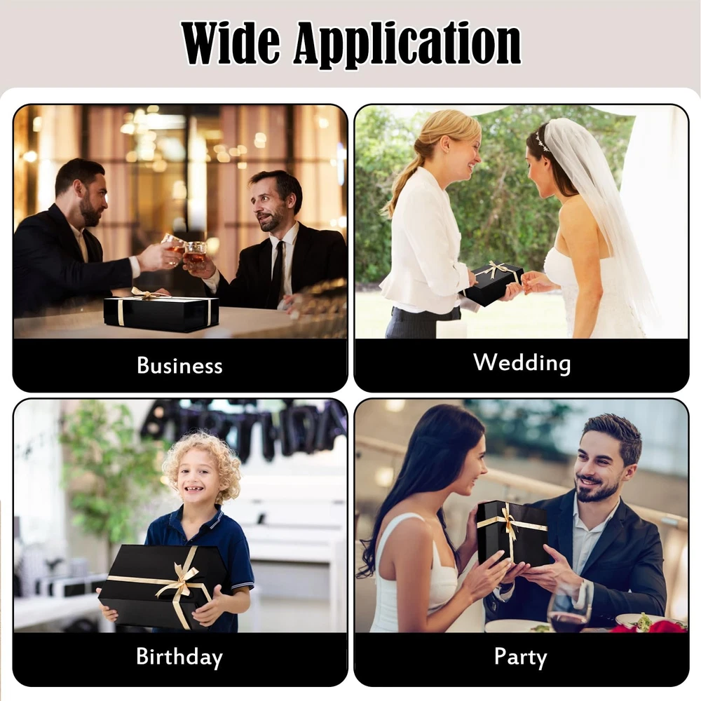 Gift boxes for presents-Perfect Solution for All Your Gifting Needs! extra large gift box has a glossy surface and unique foldable design, equipped with a complete set of accessories to meet all your gifting needs, making the big gift box wrapping more exquisite, elegant and elevated. Dimension: 13.5''L✖10''W✖3.5''H Specific Features: Super Strong Magnetism-Three hidden magnets ensure that the gifts inside the box are stored safely. Easy to Install design-Makes it a hassle-free option. Sturdy Construction-Hard cardboard with high load bearing capacity Large Capacity-Spacious enough to hold a variety of items. 🎁【Complete Accessories Included】Dimension: 13.5’’L x 10 ’’W x 3.5’’H. Gift boxes with lids for presents comes with complete accessories including 8.2 ft/98 inch delicate ribbon, 30 g beautiful raffia filler, delicate card and envelope. Black box makes your present shine and uniqueness, filling happiness and warmth to your loved ones. (Warm tip: Please confirm the size before purchasing) 🎀【Super Strong Magnetic Power】Featuring super strong magnetism, black gift box with concealed magnetic closure on two sides for excellent sealing. Large gift box ensures that all your gifts stay securely in place, can be easily opened and closed again for durability 🧸【Sturdy Material & Large Capacity】Collapsible box is made of premium high-density and reusable1200 GSM cardboard. Large gift boxes with lids is spacious enough to hold more important and heavier gift,like clothes, wine, cosmetics, perfume,and ornaments, making it a versatile option for all your gifting needs 💝【Installation in 4 Easy Steps】To use, lay your black gift boxes on a flat surface. Tear out reinforced adhesive corner lining away from the magnetic box corners. Paste and fasten the 4 corner of the gift boxes . Put in your gifts and accessories, flip the lid and let the magnetic closure seal 🎊【Ideal for Any Important Occasion】Ensure an upscale wrapping with chic, our special collapsible gift boxes for the perfect presentation. Suitable for party, birthday, wedding, business, graduation, anniversary, box for gift is the perfect choice to meet all your gift wrapping needs and make your special occasion more memorable. If you have any questions about our products, please feel free to contact us