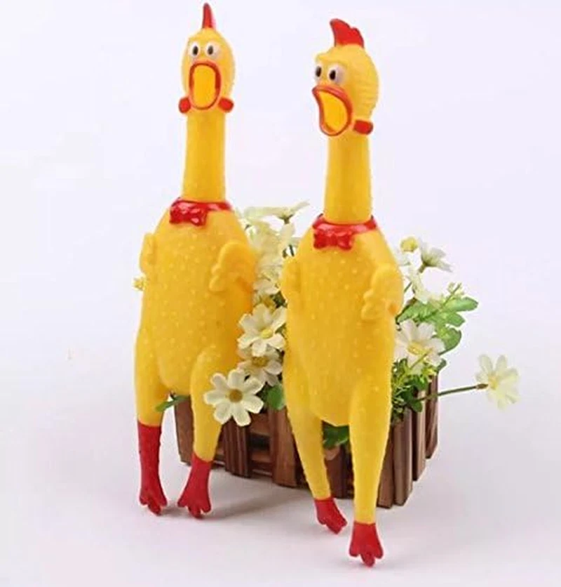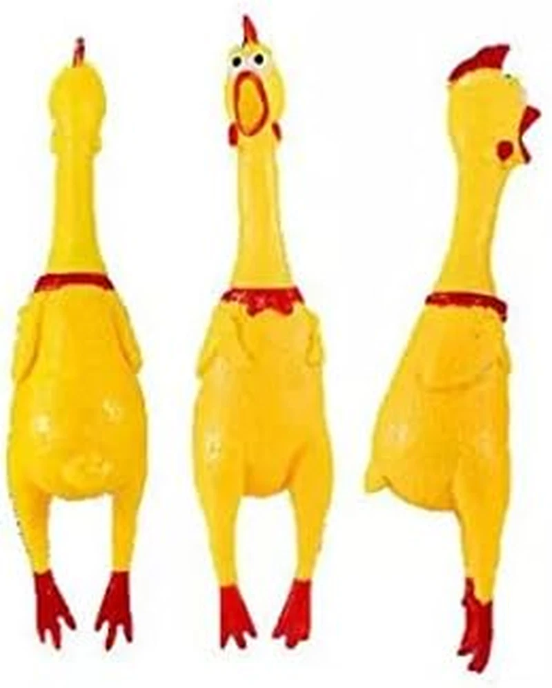 Come with 2 Packs :The chicken measures 12 inches long. Squeeze fun squawking chicken is a novelty toy. Perfect gifts for kids, adults and also a perfect chew toys for your dog. Connected at the center and may pull apart, especially with dogs who like to pull and tug. It is made from high quality durable rubber, safe product, can withstand countless of fun squeezing. The fun squawking & screaming can provoke laugher for kids and decompress for adults..it is also a squeaky chew toy for your lovely pet to play. there are a lot of high quality new products, safe for pet bites.ideal for budding comedians and fun-loving pranksters. suitable for all age groups.