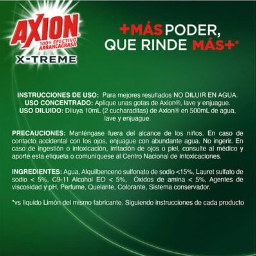 This is a 2-pack of Axion X-tream dishwashing liquid soap in lemon scent. Each bottle has a capacity of 1.1 liters, providing a total of 105 washes per bottle. The liquid soap is biodegradable, animal cruelty-free, and eco-friendly. It features an easy grip design for convenience. Ideal for washing dishes effectively.