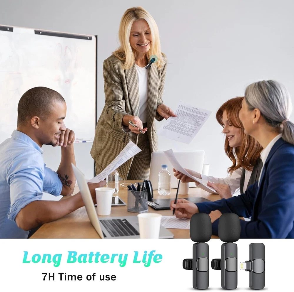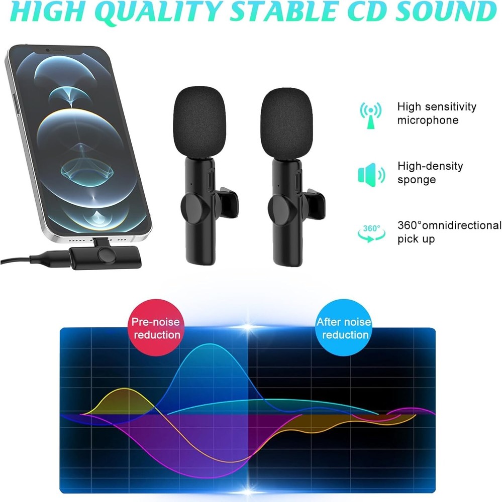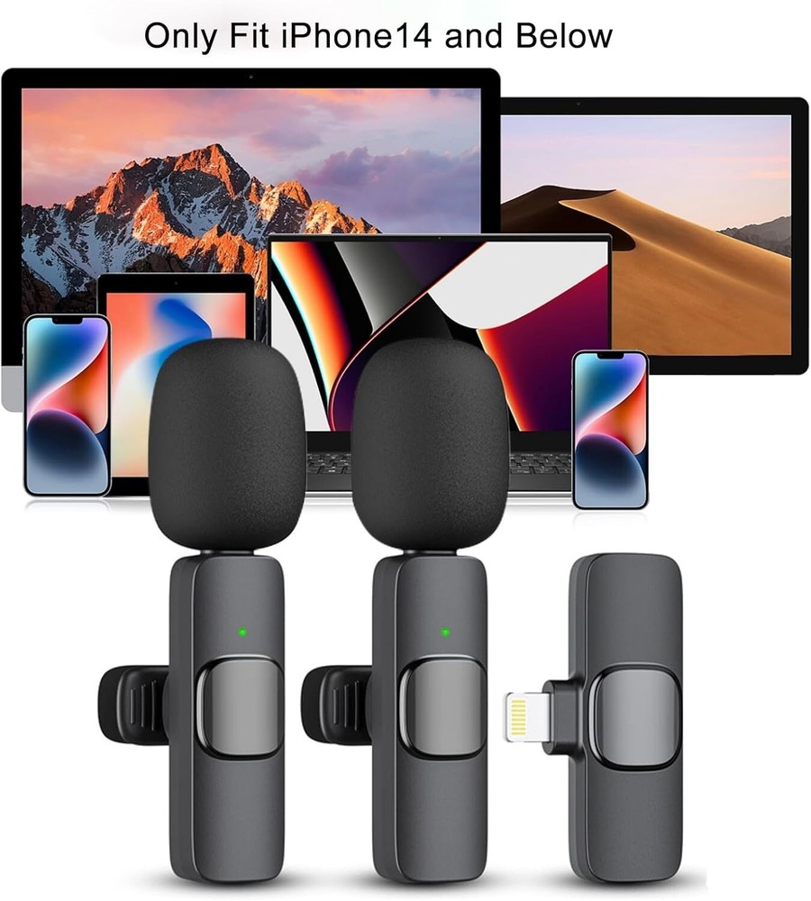 【Microphones for iPhone with Great Sound Quality】 This Wireless Lapel Microphone have 360° all-round accurate sound pickup. providing effective identification of the original sound and clear recording in noisy environments. The sponge windscreen reduces wind noise and plosives, strong anti-interference ability, meet your pursuit of high sound quality. 【Mics Plug and Play】 This Wireless microphone is easy to use. Plug and Play. No Adapter, Bluetooth or Application needed. Just get the receiver into your devices, then turn on the portable mic, these two parts will pair automatically. Its a mini Lapel microphone, free yourself from the constraints of the cable, just clip the microphone on your shirt and click it then you can enjoy the recording now. 【Omnidirectional Mini Microphones with Noise Reduction】 This Professional wireless lavalier microphone built in High Tech noise reduction chip, achive real-time auto-sync technology, and stable signal transmission with super low latency, the sound picking-up follows the picture in real-time. 【Podcast Microphone IOS Compatibility and Widely use】 Wireless clip-on microphone is equipped with LIGHTNING ports. Compatible with iPhone, iPad, IOS device. Because of its small size, lightweight, Cordless design and great performance, you can bring it anywhere and Can be applied to most working scenarios. Such as for interviewing, online conferencing, podcasting, vlogging, live streaming, YouTube, TikTok, Podcast, Instagram and more. 【Long-Lasting Battery Life & 100FT WIRELESS TRANSMISSION】 The Tiny Mic is built in rechargeable 65MAH battery and low-power chip, up to 6 hours operation time. The receiver has a charging interface, making it convenient for you to charge while working. Ensure a longer continuous working time. In addition, Wireless Lavalier microphone have adopted more stable transmission technology and chips. To ensure100 feet barrier-free effective distance and super-low transmission delay while working. 【Lavalier Microphone Package include】 package come with 2*Mini Microphone, 1*Receiver, 2*Anti-spray Sponge, 1*Type-C Charging Cable, 1*User Manual. This wireless microphone, due to its compact and portable design, is easy to operate and has a wide range of applications. Suitable for all types of people. It is a ideal gift choice for parents, and friends. It can be a good gift choice when Father's Day. Note: (Device only Fit iPhone14 and Below)