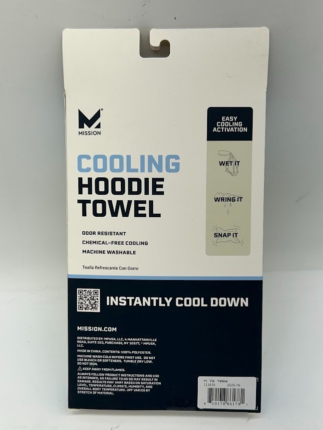 About This Product Stay cool, dry, and comfortable no matter the activity with the Mission Cooling Hoodie Towel . Engineered for versatility, this innovative cooling accessory can be worn draped over your head or wrapped around your neck for instant heat relief . Its chemical-free cooling technology activates with water, helping you stay refreshed for up to 2 hours —perfect for post-workout recovery, outdoor construction, or sideline breaks. Designed for performance and convenience, the Cooling Hoodie is odor-resistant and machine washable , making it the go-to solution for beating the heat anywhere life takes you. Highlights Long-lasting cool: Stays cool for up to 2 hours when activated. Natural cooling: Chemical-free cooling technology—just add water. Odor-free: Resists unwanted odors for lasting freshness. Easy maintenance: Machine washable and reusable. Versatile functionality: Drape over your head or wrap around your neck for instant relief. Customer Care Statement We take great care to inspect all items and ensure they are accurately described. Should you have any issues with your purchase, please let us know immediately. We are committed to resolving any concerns promptly and to your satisfaction. Our small business truly appreciates your patronage.