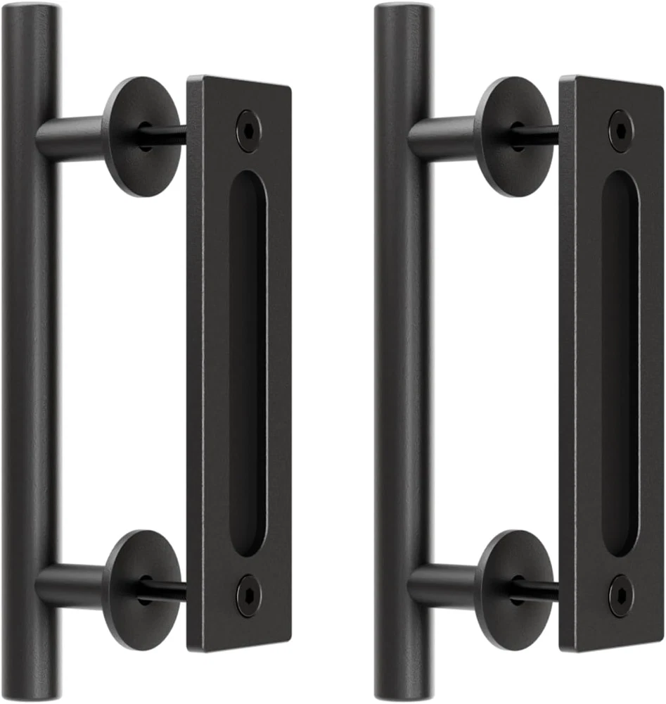 Frosted Touch: Black powder surface, heavy-duty aluminum, matte feel, oval design and smooth edges, so you can use it comfortably without scratching your fingers. Door Thickness Range 1 3/8” to 1 3/4”: The distance between the center of the two screw holes is 7". The external length of the handle is 9.5", The internal depth of the handle is 0.2". Quick and Easy Installation: Atached with all handles and screw parts, easy installation, just need to measure the distance, then drilling holes in the door and install both side door handle. NOTE: The door needs to be chiseled a little for the back trim piece to be flash. Rustic Barn Door Handle: Suitable for metal doors, wooden doors, sliding door, used as shower handles, interior door handles, kitchen handles, wardrobe handles. Easy Installation: The 9.5" handle comes with a complete flush hardware set, making installation a breeze. Measure your door, drill the required holes, and secure the handles without hassle. Enjoy the convenience of quick setup with all necessary components included. Product description TOIMIOTOIM 2 Pack Heavy Duty 9.5" Sliding Barn Door Handle Pull and Flush Hardware Set TOIMIOTOIM is committed to the production and research and development of sliding barn door hardware kit. As the sliding door becomes popular in home decor, the demand for sliding door accessories is also increase. This new type of handle uses the urban fashion design concept, with elegant black colour, slick modern design, oxidation process. It can match most of the door styles, and ideal for high traffic areas such as apartments, restaurants, swimming pool and other commercial area. Product Details 1. Made of high-quality aluminum alloy to ensure safety and durability. 2. Matte black appearance is not only refined and elegant, but also attractive and decent. 3. After exquisite polishing, the edge prevent any unexpected injury and provide a more comfortable feeling. The package includes: 2* Internal handle 2* External handle 4* Mounting screws 2* L-shaped wrench Product Details: Handle Weight: 1.98 LB. Applicable to 1.38''-1.77'' door thickness. It can be installed directly without digging. Detailed Size Description: The distance between the centers of the two screw holes is 7''. The total length of the handle is 9.4''. The inner thickness of the buckle handle is 1.5''. The length of the screw is 2.56''. Smooth Polished Edges We always strictly control the quality of the product to ensure that it can withstand the test of almost anything. Fine polished surface dealt with edges prevent any unexpected injury. Frosted Black Surface Through fine black powder coating process under high temperature, our handle set can resist to rust, corrosion and deformation. Widely Use It can be installed on interior or exterior doors or with a variety of materials including wood, glass or aluminum doors, fit for doors, gates, garages, barns, sheds, closets, sliding doors etc.